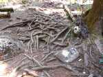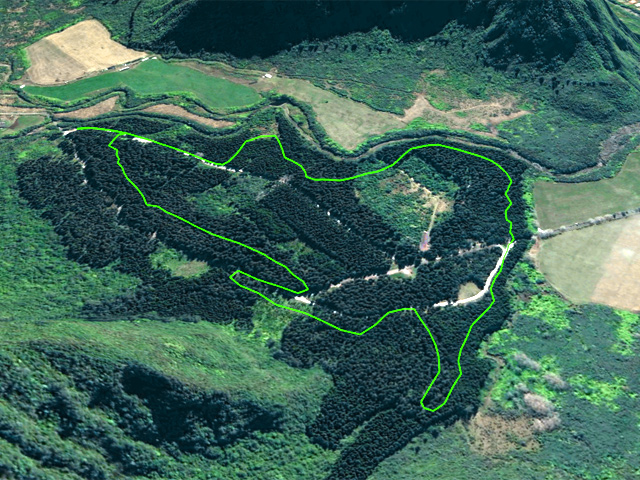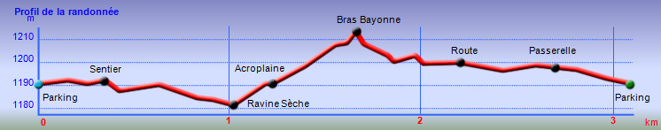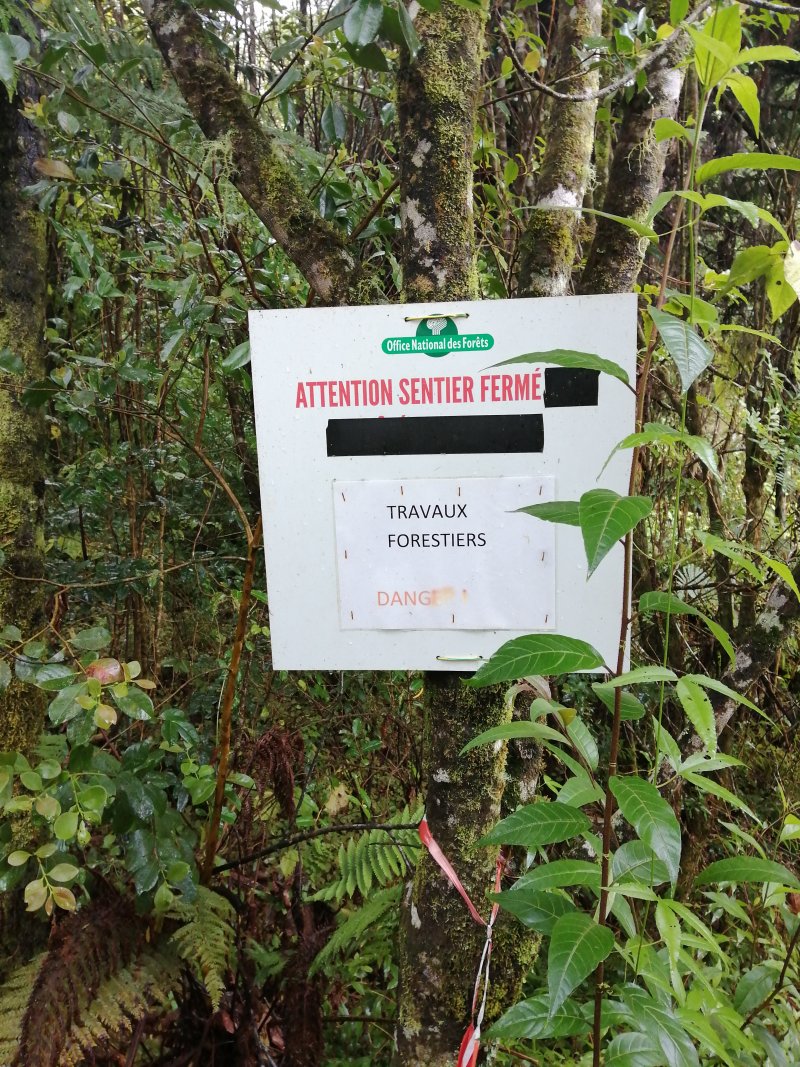 La randonnée débute ici à la fin de l'aire de repos, à deux pas du radier sur le Bras Noir. Un parking d'une dizaine de places est situé à l'ombre des cryptomérias qu'on côtoiera jusqu'à la fin de la boucle. L'image satellite montre bien la forêt entre le Bras Sec et le rempart. Emprunter la piste terreuse rouge en fin de parking et la suivre jusqu'à la nouvelle route (Photo 1). Le sol, totalement plat, permet une agréable balade pour tous. On frôle des emplacements de stationnement en épi qui servent de repère pour trouver le sentier qui fait le tour de l'aire boisée (Photo 3). C'en est fini de la piste et on chemine sur un sentier large et facile sous les hauts cryptomerias (Photo 4). On parvient à une clairière d'où l'on a de belles vues sur le Pic des Sables (Photo 5). Le sentier oblique vers la droite et pénètre sous les installations d'Acroplaine, un grand parc aventure pour amateurs de randonnées aériennes (Photo 7 et 8). La marche se poursuit à l'ombre sur les racines de cryptomerias particulièrement saillantes à cet endroit (Photo 9). On parvient à la route et au nouveau croisement bétonné qui a un peu empiété sur le tracé du sentier (Photo 10). Partir sur la gauche de cette nouvelle route et chercher le sentier, assez peu marqué à cet endroit. Très vite, on retrouve le passage entre les troncs, les jouvences et quelques pieds d'arums (Photo 12). Il remonte ensuite le long du Bras Bayonne dont on coupe un petit affluent avant de repartir en sens inverse dans une légère descente, toujours sous les hauts cryptomerias (Photo 13). Plusieurs sentiers en plus ou moins bon état partent dans plusieurs directions. Conserver la meilleure trace qui se rapproche de la route en franchissant une passerelle (Photo 15). On ne rejoint pas la route car le sentier, qui lui est parallèle, pénètre dans une zone reboisée de jeunes cryptomerias (Photo 16). Ce n'est qu'après ce reboisement que le sentier rejoint la route bordée d'une piste dédiée aux marcheurs (Photo 18). Marcher une centaine de mètres, prendre le virage à gauche et repérer le début du sentier près d'un kiosque de pique-nique (Photo 19). La fin de la boucle est une agréable balade sous les cryptomerias où les racines sont moins présentes (Photo 20). L'endroit est parfois un peu boueux et quelques petites ravines entourées de longoses se franchissent sur des passerelles en bois (Photo 21). Une clairière ensoleillée accueille quelques kiosques un peu éloignés de la route pour y trouver plus de calme (Photo 22). On parvient assez vite au parking du début, toujours sous ces cryptomerias qu'on n'aura jamais quittés, sur un sentier bordé également de fougères arborescentes (Photo 24).