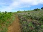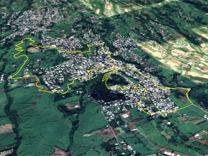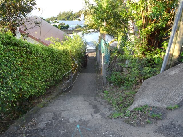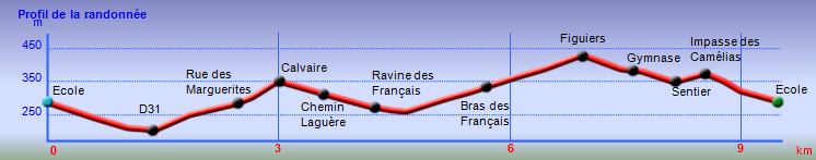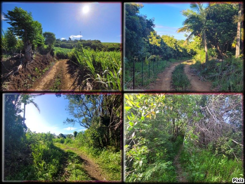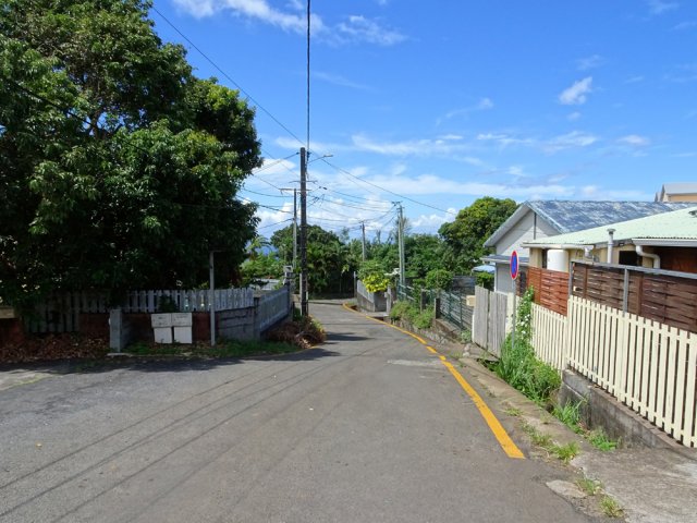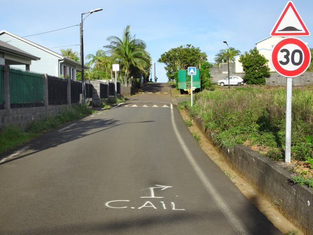 La randonnée débute au grand parking de la mairie, juste en face de l'école des Alpinias. Filer plein sud par la Rue du Général de Gaulle, poursuivre par la Rue de l'Est (Photo 1) avant de poursuivre par l'Allée des Violettes. On s'approche ensuite de la Ravine de Petite Île qui longe le Chemin Joseph Pothin (Photo 2). Le chemin bétonné se rapproche du pied du Piton Rosille et de quelques cases proches de la ravine (Photo 3). L'étroit chemin, bordé de bananiers et de nombreuses cultures dont un grand champ de pitayas, se dirige en direction de la mer qu'on aperçoit à l'horizon (Photo 4). A la fin du champ de pitayas, laisser le Chemin Pothin et tourner à 90° sur l'Allée des Azalées qui file droit vers le bas de la ville (Photo 5). Traverser la RD31 et remonter la rue passant devant un garage. Tourner à droite et emprunter aussitôt l'Allée des Pandanus en profitant de beaux panoramas sur la côte en direction de Grands Bois (Photo 6). A noter qu'un escalier permet un agréable raccourci à la fin de l'Impasse des Œillets. Remonter jusqu'à la Rue François Hoareau, la traverser et remonter le Chemin du Calvaire jusqu'à la Rue des Marguerites. Les grandes inscriptions sur l'asphalte permettent de ne pas manquer l'Impasse des Grévilléas (Photo 7). Les 20 premiers mètres, en forte pente peuvent inquiéter, mais très vite, la piste herbeuse redevient facile à suivre (Photo 8). Un nouveau coup de rein est nécessaire pour atteindre la clôture du cimetière. On se retrouve face aux oliviers bordant le calvaire qui culmine au sommet du Piton (Photo 9). Visiter ou non le cimetière très fleuri qui occupe la presque totalité du cratère puis emprunter la Rue du Calvaire qui descend vers le cœur de Petite Ile. Dans les trouées, on peut observer la ville et quelques sommets dépassant à l'horizon (Photo 10). La route descend de plus en plus et rejoint rapidement la Rue Joseph Suacot qu'on emprunte en partant à gauche. Après le parking des Zoizos verts, bifurquer à gauche sur l'étroite Rue des Letchis où il est impossible de se croiser en véhicule et où les camions doivent rouler au pas (Photo 11). Continuer jusqu'au Chemin Laguerre, l'emprunter vers la gauche et tourner à la première rue à droite. Cette Rue des Jacques traverse champs et habitations en légère descente (Photo 12). A la fin de la rue, prendre le chemin entre cultures et plantations d'ananas (Photo 13). L'absence d'arbres et de canne permet de profiter d'un large horizon sur l'océan (Photo 14). Le parcours longe ensuite plusieurs plantations avant d'obliquer à gauche pour grimper un peu grâce à des marches (Photo 15). Il est facile ainsi de faire la différence entre pieds de corossols, cœurs de bœuf ou pommes cannelles (zates) qui peuvent se ressembler quand ils ne portent pas de fruits (Photo 16). Cet escalier se termine dans de nouveaux lotissements avant d'emprunter la Rue des Maraîchers qui descend vers un quartier isolé (Photo 17). Dans la descente, guetter les inscriptions sur le sol et tourner à droite sur la première piste dans les cannes qui occupent la rive gauche de la Ravine des Français (Photo 18). Le parcours est facile car le sol est nettoyé par le passage fréquent des engins agricoles (Photo 19). Après avoir coupé la Ravine des Français, on aperçoit le stade qu'on s'apprête à contourner (Photo 20). La montée se poursuit encore sur des pistes faciles à suivre dont une bordée de palmistes (Photo 21). Arrêter de monter en arrivant à la plantation de figuiers sur la gauche du chemin (Photo 22). Laisser la piste montant au nord et bifurquer sur celle de droite. Elle est tout d'abord envahie de hautes herbes mais le passage est assez large (Photo 23). La traversée de la Ravine des Français se remarque à peine tant le fond est envahi de grandes cannes fourragères (Photo 24). La descente douce se poursuit sans encombre en direction des habitations. Après les installations sportives, on parvient aux abords du collège Joseph Suacot. Prendre à droite la longue descente de la Rue des Cryptomerias et de la Rue Joseph Fontaine. Dans un virage de cette dernière, prendre à gauche une piste menant à des travaux de terrassement où s'installent de nouvelles habitations (Photo 25). Ne pas manquer à gauche le début de l'Allée des Poivriers, totalement envahie qui marque le début du sentier remontant vers la rue principale. Il est court, étroit, mais de bonne qualité sous les poivriers (Photo 26). En arrivant sur la Rue Mahé de Labourdonnais, partir à gauche sur quelques dizaines de mètres puis emprunter la première rue à gauche. Trouver, au début de l'Impasse des Camélias, l'étroite ruelle permettant d'entamer la descente vers le centre ville (Photo 27). Cette rue se transforme en escalier pour terminer la descente vers l'école des Badamiers à deux pas de la Ravine de Petite Île (Photo 28). Rejoindre l'église que l'on aperçoit à gauche et terminer la boucle en suivant les magasins de la ville jusqu'à la mairie et son parking.