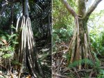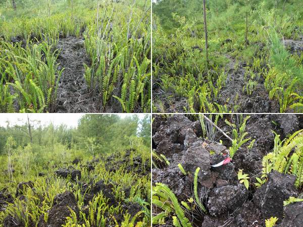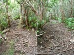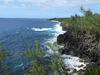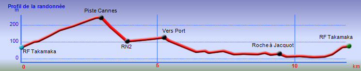 La randonnée débute ici au croisement de la Route Forestière de Takamaka quelques dizaines de mètres avant la piste descendant à la Pointe de la Table. On peut stationner avant ou après le premier virage à gauche. Cette route goudronnée monte régulièrement en forêt jusqu'à la Ravine de Takamaka puis traverse ensuite les champs de canne. Elle est étroite et sans circulation, hormis quelques producteurs de vanille, et monte à peine entre les fougères et bois divers de ces altitudes (Photo 1). Très vite, on remarque dans les sous-bois des centaines de pieds de vanille qui grimpent sur les poteaux naturels créés par les arbres laissés là à cet effet (Photo 2). Si une voiture, un scooter ou une bicyclette est en stationnement sur l'accotement, tenter de rencontrer la personne venue le matin pour fertiliser les fleurs. Sans prendre trop sur son temps compté, ces explications sont toujours intéressantes. Moins de deux kilomètres plus loin, on traverse la Ravine de Takamaka au fond basaltique glissant à cause de la mousse (Photo 4). Cette ravine a vu son cours chamboulé par la coulée de 1986. C'est également là qu'on trouve le sentier montant vers le Piton de Takamaka dans les fougères et les bois de chapelets. Les cannes remplacent les bois et les plans de vanille dans les Hauts du village de Takamaka. (Photo 5). Le goudron a souffert des passages des tracteurs et des radiers profonds empêchent d'y passer avec des voitures basses sur roues. Comme il n'y a plus d'arbres, le regard porte jusqu'au Piton de Takamaka (Photo 6) ou vers les Grandes Pentes (Photo 7). Plusieurs pistes cannières redescendent vers la mer qu'on aperçoit dans les trouées, même si la canne est haute. La petite route traverse la Ravine Pavée, plus belle que la précédente (Photo 8). Le paysage alterne petits bois non cultivés et champs de canne à sucre. Traverser la Ravine Rencontre et tourner quelques mètres plus loin sur une piste constituée de cailloux et surtout de larges plaques de basalte (Photo 9). On comprend mieux, en voyant ce sol, pourquoi les cannes sont si petites à côté ; elles n'ont rien pour se nourrir et même l'eau abondante de la région ne suffit pas à leur développement puisqu'elle file vers le bas au lieu de s'infiltrer. La piste est un peu envahie d'herbes qui sont régulièrement écrasées par un 4x4 ou les tracteurs. Le planteur passe également du désherbant. Effectuer la boucle en hiver assure de bons panoramas et la piste, très utilisée, aura perdu toutes sa végétation. On arrive à une palmeraie traversée par la piste encore plus défoncée qu'ailleurs puis on parvient très rapidement à la route à l'arrêt de bus des Pandanus. Prendre à gauche et marcher moins de 2 km sur la RN2. C'est moins agréable que sur routes forestières ou sur les pistes cannières mais ce tronçon est obligatoire si on veut effectuer une bonne sortie en bord de mer (Photo 10). On traverse ainsi les habitations du Tremblet, on marche sur le tunnel de lave du Brûlé des Citrons Galets et on emprunte aussitôt la petite route qui redescend en lacets vers le Quai de Sel à la Pointe du Tremblet avec encore quelques pieds de vanille sur les arbres. La descente est faible et constante, toujours à l'ombre (Photo 11). Quand le bruit des vagues est au plus fort, prendre à droite le sentier qu'on suivra sans beaucoup de difficultés jusqu'à la Pointe de la Table. Le trajet commence entre les goyaviers et leurs racines (Photo 13). Puis ce sont les vacoas qui l'emportent avec parfois de beaux spécimens ou d'autres aux racines interminables (Photo 14). Des petites sentes de pêcheurs partent souvent vers la falaise. Il n'est pas toujours facile d'en suivre quelques unes pour mieux voir la mer ou surtout les endroits où passent les pêcheurs pour rejoindre les rochers en bas (Photo 15). De plus, ils effectuent ces escalades en savates deux doigts ! Plus loin, ce sont les fougères qui bordent le sentier herbeux sous de multiples filaos (Photo 16). Quand c'est l'herbe qui est majoritaire, elle a vite fait de recouvrir le sentier mais les multiples passages la domptent un peu (Photo 17). Peu après la Roche à Jacquot on commence à apercevoir les falaises créées en 1986 par la coulée de la Pointe de la Table (Photo 19). En fonction de la fatigue, on peu effectuer toute la boucle de la Pointe de la Table, une moitié seulement par l'Ouest ou comme ici une balade hors sentier sur les coulées et sous les filaos (Photo 20). A la fin de la zone, on est bloqué par de hautes falaises. Partir sur la droite et les longer à l'ombre des filaos (Photo 21). Il n'y a pas de danger et on a l'assurance de rencontrer de beaux paysages le long des falaises ou trouver des crabes qui aiment se cacher dans les fissures (Photo 22). Deux manières de s'échapper de ce cirque : en escaladant 2 mètres de la falaise en face du sentier de la boucle mais il faut se méfier de la chute ; ou en filant vers le point d'entrée utilisé 10 minutes avant. Avant de poursuivre en suivant cette trace, ne pas hésiter à marche sur les autres plaques basaltiques plus au sud. En cherchant un peu on peut dénicher de plus ou moins belles arches basaltiques en bord de mer (Photo 23). Revenir sur la boucle officielle où il est toujours aussi agréable d'emprunter les coulées de 1986 qui ressemblent parfois à de véritables routes (Photo 24). Dans un virage du sentier Ouest, débute un sentier qui rejoint la route en moins de 500 mètres (Photo 25). Il monte sur des larges plaques de lave noire et il faut absolument se méfier des fissures en partie couvertes de plantes dans lesquelles il est très facile de se briser une cheville ou un tibia si on marche le nez en l'air (Photo 26). Plus haut, il est de très bonne qualité sous les bois de couleurs et l'on entend déjà passer les véhicules sur la RN2 (Photo 27). Ce sentier se termine par un panneau de l'ONF donnant des explications sur l'agrandissement 