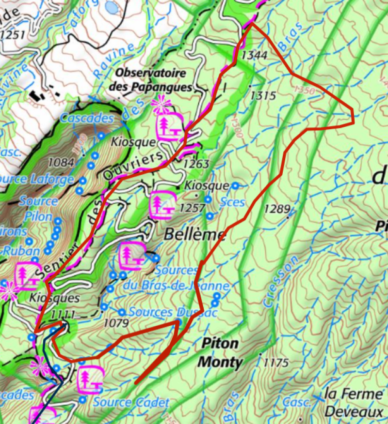 Se rendre à l'Etang Salé les Hauts puis au Tévelave - Traverser le village en direction du Maïdo puis garer le véhicule au départ du sentier des Ouvriers - Suivre le sentier jusqu'à la route qu'on longe en laissant sur la gauche le nouveau départ de sentier des Ouvriers - Poursuivre jusqu'à l'aire de pique-nique quelques dizaines de mètres plus haut puis repérer après la ravine le sentier qui part sur la droite - Longer ce sentier de sources en sources jusque très haut sur le Piton Monty et rejoindre la ligne plantée d'une rangée de cryptomerias - Suivre le sentier étroit qui chemine sous les grands arbres, passer quelques ravines et arriver jusqu'au Bras Marat - Faire demi-tour par le même itinéraire jusqu'au véhicule. Au bras Marat, si on suit la ligne verte sur la carte, on rejoint le Sentier des Ouvriers, beaucoup plus haut et on peut effectuer une boucle en revenant par le Sentier des Ouvriers. Mais le sentier est parfois très étroit ou envahi de pestes. Pourtant, on ne peut pas s'égarer car on suit constamment la ligne plantée d'une rangée de cryptomerias.