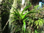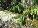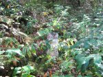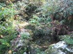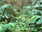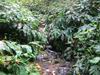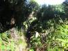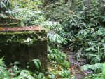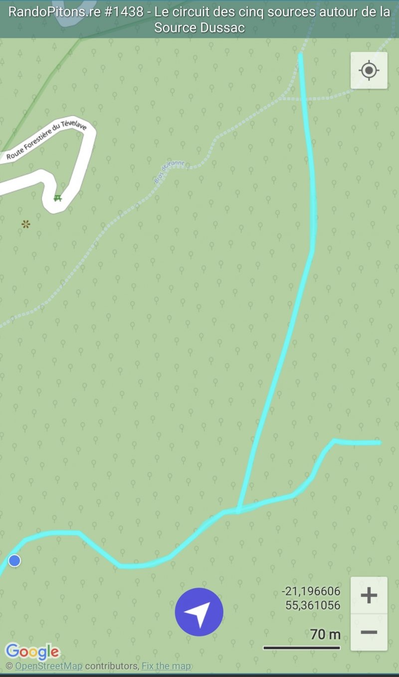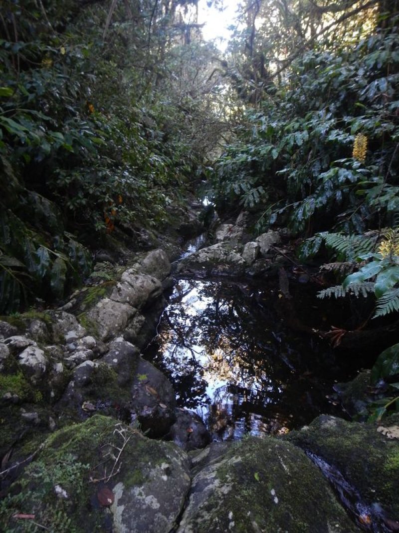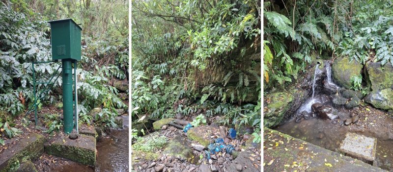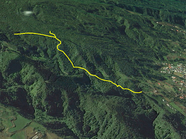 Lorsqu'on regarde la carte au nord du Tévelave on est frappé par le nombre important de cercles bleus représentant chaque fois une source. En y regardant de plus près on remarque également des pointillés indiquant que quelques sentiers sont répertoriés. Le sentier emprunté sur cette page n'apparaît pas sur la carte. La région est effectivement très humide et malgré la végétation parfois dense, il est pratiquement impossible de s'y perdre car on rencontre à tout bout de champ des tuyaux en fonte ou en plastique dans lesquels on entend l'eau circuler ou s'enfuir par de petites ou grosses fissures. On remarque également sur la carte des traits verts. Quand on arrive sur l'emplacement, on remarque très vite que ce sont de larges allées qui ont été plantées d'une seule rangée d'arbres, très souvent des cryptomerias. Entre les troncs souvent envahis de longoses on remarque pourtant des sentiers étroits montrant que quelqu'un passe ici de temps en temps. La randonnée de la Source Dussac permet de rencontrer 5 prises d'eaux sur de petits cours d'eau qui, à eux seuls, ne pourraient pas alimenter les populations des bas.