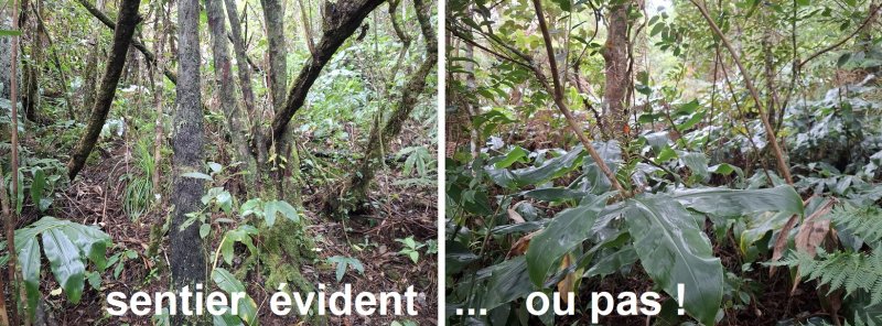 ATTENTION : Plusieurs pancartes dans la montée du Tévelave à la Route Forestière des Tamarins interdisent le passage sur ces sentiers. Il faut comprendre ces interdictions car tous les randonneurs ne sont pas des modèles de civisme et abandonnent facilement tous leurs déchets à partir du moment où on se sent moins surveillé.