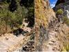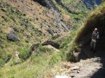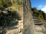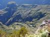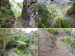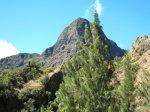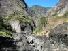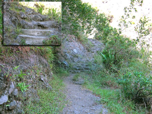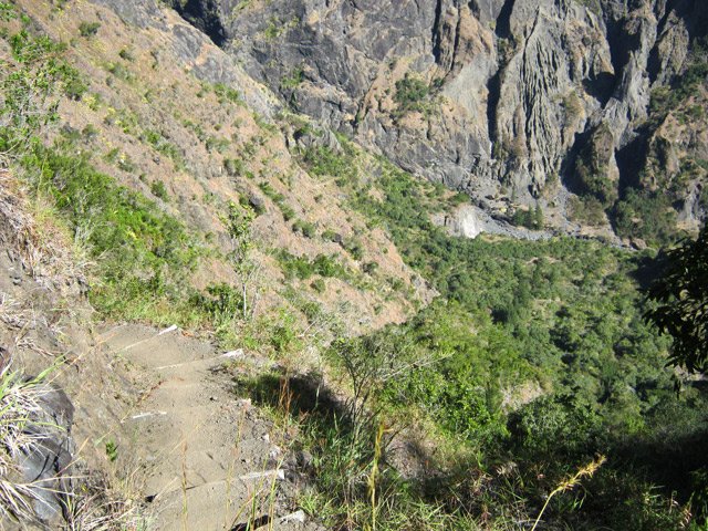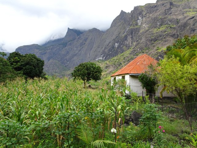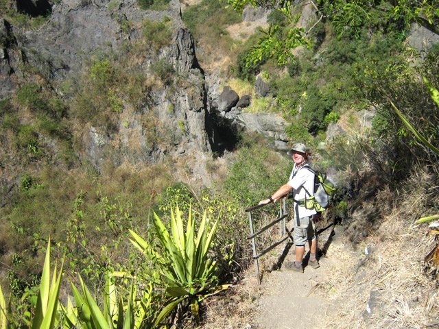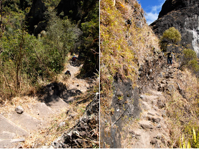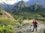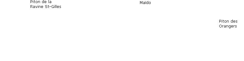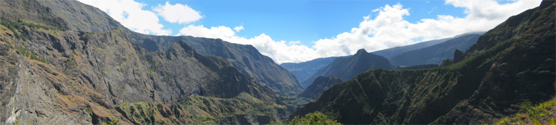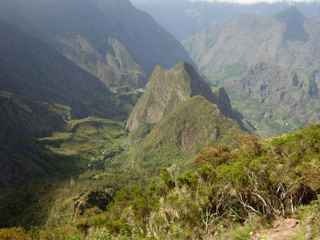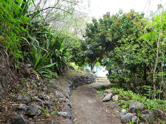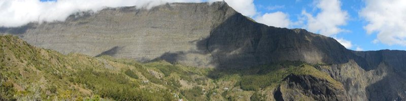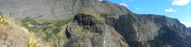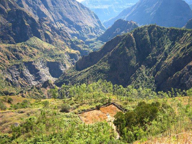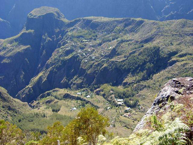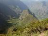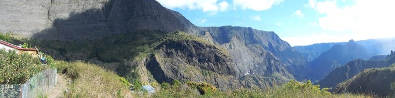 Le début est un classique du genre avec la descente du Maïdo vers Roche Plate précédée d'une courte traversée de laves anciennes à partir de la route. La croix blanche qui marquait le début de la descente a disparu mais pas les premiers panoramas exceptionnels sur Mafate et le Gros Morne, même au petit matin avec un soleil à peine levé (Photo 1). La pente est forte et les constants "freinages" mettent déjà à mal les muscles et les articulations (Photo 2). Profiter des magnifiques paysages en direction des Orangers (Photo 3). La portion plus plate en début de descente sera la bienvenue au retour pour souffler un peu. Les genoux ont déjà souffert en arrivant à l'escalier de la Brèche où les gens sujets au vertige cramponnent fermement le câble fixé à la paroi (Photo 4). On a sous les yeux la totalité de Roche Plate qui comporte des habitations jusqu'au pied du Bronchard (Photo 5). La portion qui va de la Brèche à Roche Plate est en pente agréable et permet de souffler un peu. On voit très bien le petit pain de sucre du Maïdo 900 m plus haut (Photo 6). Plusieurs gîtes se rencontrent dans le village pour une pause café ou jus de fruit mais il ne faut pas trop traîner car on est à peine au cinquième de la journée et il vaut mieux réserver cette pause pour le retour. La traversée de l'îlet est très agréable car à plat et ombragée. Les cases, pour la plupart fleuries, sont éparpillées sur une grande surface (Photo 7). On parvient rapidement au col situé au pied du Bronchard avec de larges vues sur le Piton des Calumets (Photo 8). Délaisser le sentier qui file droit vers la Nouvelle et descendre à gauche vers la Roche Ancrée en passant au plus près du Cimetière du Bronchard qu'on aperçoit de loin et qui semble de plus en plus abandonné (Photo 9). La vertigineuse pente se descend sur un sentier étroit, comportant des lacets et une multitude de marches qui retiennent le sable (Photo 10). Les deux images de la photo 11 donnent une très bonne idée de la pente, de la hauteur des marches et des cailloux qui l'encombrent. Si un randonneur est sur le sentier on ne voit que le chapeau et le haut du sac à dos ! Il ne faut donc pas oublier cette difficulté pour le retour (Photo 12). Une halte est possible près de la petite chute d'eau de la Ravine de Roche Plate qu'on traverse en fin de descente où se baignent souvent des randonneurs partant pour des circuits plus courts. Mais avant d'atteindre ce bassin alimenté par une petite chute il faudra grimper de nouveau puis descendre très fortement vers la Rivière des Galets (Photo 14). Les lacets se succèdent pour de nombreuses vues plongeantes (Photo 15). On parvient à la Rivière des Galets où il faut chercher le bon passage en suivant les balises blanches pour poursuivre vers Grand Place. Une petite chute d'eau alimente un grand bassin plus ou moins rempli en fonction de la saison (Photo 16). Le fond de la rivière est encombré de nombreux rochers énormes et le sentier qui remontait la rivière a été emporté par un gros éboulis vers le Cap Noir (Photo 17). Si, depuis le Maïdo, on est beaucoup descendu, il va falloir se préparer à la première montée sérieuse de la journée en direction du Piton des Calumets qui a bien grossi depuis le départ (Photo 18). On commence à l'ombre sur un sentier qui part en direction du Cap Noir sur des marches (Photo 19). Laisser les vestiges du sentier du Cap Noir qu'on distingue de moins en moins et obliquer à gauche sur une pente faible. Très vite la pente s'accentue sur de courts lacets poussiéreux (Photo 20). Le Piton des Calumets devient de plus en plus impressionnant et infranchissable. Si les faces visibles sont effectivement infranchissables, il en est autrement de la troisième, invisible depuis le sentier qui contourne le pic (Photo 21). Après le passage d'une première ravine, la pente s'accentue encore graduellement et les lacets, courts et nombreux coupent un peu le souffle (Photo 22). La pente est raide, d'autant plus si le soleil est au zénith. En se retournant, la rivière des Galets semble s'éloigner de plus en plus. Le Piton des Calumets, inversement, a encore grossi et on atteint le petit col qui domine Grand Place (Photo 23). Le Piton Papangue et le Piton Carré encadrent le village très étendu dans la verdure. Rejoindre l'école de l'îlet par une longue traversée en pente assez douce par rapport à ce qui vient d'être franchi. En bas du village, les mêmes pitons ont grossi et emplissent tout l'horizon. Le sentier passe près des plantations des élèves de la petite école mais semblent beaucoup souffrir du manque d'eau. Les noms de plantes sont ici remplacés par le prénom des élèves ayant effectué la plantation et on se rend très vite compte que certains ont la main plus verte que d'autres à moins que ce soit la variété choisie qui pousse plus vite que sa voisine. Grand Place et Cayenne ne sont séparés que de quelques minutes de marche qui s'effectuent d'abord par une forte descente caillouteuse. Laisser le premier sentier filant sur la droite vers Dos d'Ane et remonter rapidement à l'îlet fleuri de Cayenne. On parvient très vite au dispensaire après avoir traversé la Ravine Fontaine (Photo 24). Laisser le dispensaire, la petite chapelle avec sa cloche à l'extérieur et les cases entourées de fleurs ou de champs de maïs (Photo 25). Les fleurs rouges dominrnt dans la verdure entourant les habitations ou les gîtes (Photo 26). Le sentier, un peu moins employé que les autres, se poursuit dès la sortie de l'îlet. Il franchit un verger de manguiers et une petite passerelle puis longe la courbe de niveau en effectuant quelques lacets pour contourner des ravines qui rendent verdoyants les abords du passage (Photo 27). Le sentier est agréable car il tourne beaucoup dans tous les sens mais comporte peu de pentes (Photo 28). Après une zone dénudée, il commence à descendre fortement vers la Rivière des 