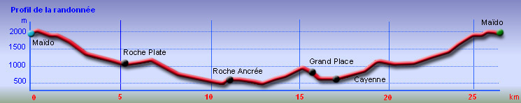 Cette randonnée, longue et difficile, est à réserver aux marcheurs entraînés. Longue car elle approche les 30 km ; difficile car elle comporte en une seule journée la descente et la remontée du Maïdo ainsi que les alentours de la Roche Ancrée pour grimper à Grand Place par des lacets courts et abrupts ou pire, pour remonter vers le Bronchard. Elle donne l'occasion de contempler de magnifiques paysages, comme souvent dans Mafate, tout d'abord au Maïdo sur la Crête des Orangers, en général au lever du soleil, puis Mafate en entier depuis la Brèche et enfin d'autres endroits du Cirque à partir du point de vue proche du départ pour le Piton des Calumets après la Roche Ancrée . Il est possible de se ravitailler en route lors de la traversée de Roche Plate où un robinet est à disposition près de l'école, également à Grand Place ou à Cayenne. C'est ainsi trois îlets du Cirque qui seront traversés au cours de cette longue journée. Les difficultés de sentiers sont très variables : longue descente vers Roche Plate ainsi que vers la Roche Ancrée à partir du Cimetière du Bronchard et longue montée en sens inverse. Quelques parties plus plates permettent un peu de repos comme avant ou après avoir traversé Roche Plate en direction du Bronchard où l'on chemine à l'ombre des filaos sur un sentier agréable et dépourvu de cailloux. Le Sentier Facteur, également appelé Sentier Dacerle est assez impressionnant par endroits. Il peut être glissant, voire vertigineux mais comporte quelques mains courantes. Bref, une étape très sportive qui nécessite préparation, entraînement et ravitaillement. Il est bien sûr possible de réserver un gîte à Grand Place ou Cayenne pour prendre une autre direction le lendemain matin.