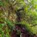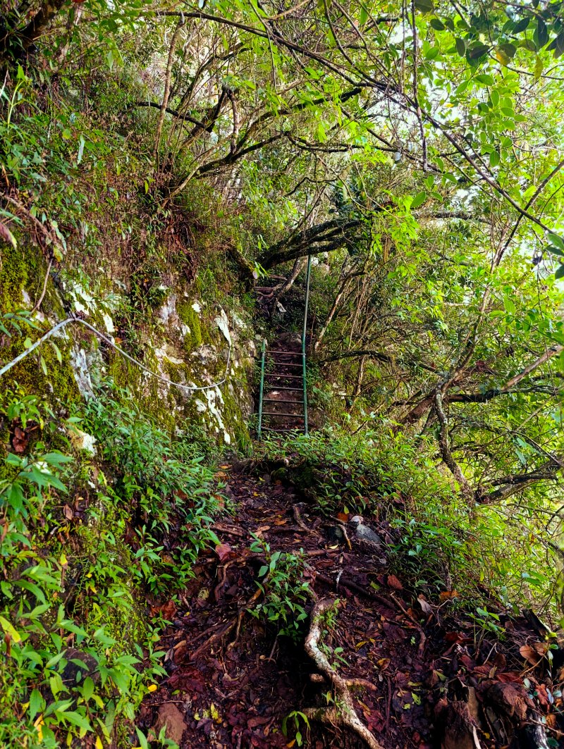 La randonnée débute à Bois Court près de l'ancienne horloge, du belvédère et des kiosques où les marchands viennent en fin de semaine proposer leurs produits à la vente. Ne pas manquer l'originale Vierge dans sa niche en losange : Notre Dame de la Médaille Miraculeuse. Marcher vers le Chemin Thomas Payet à 300 m de là. Un sentier, partant sur la droite, en faible descente, rectiligne (Photo 2) gagne le bord du rempart puis il plonge littéralement vers Grand Bassin en débutant par des marches bétonnées, parfois hautes (Photo 3). Un parcours terreux et rocailleux remplace le béton (Photo 4). Les lacets sont nombreux et parfois raides jusqu'à la falaise sur la droite où la marche est beaucoup plus aisée. Franchir un éboulis récent très bien sécurisé (Photo 5), passer devant un oratoire dédié à Sainte-Rita et poursuivre à plat jusqu'à une nouvelle série de lacets. On passe au plus près des installations de pompage de l'eau venant des nombreux captages de la région de Grand Bassin. De nouvelles canalisations, doublées, ont été installées sur les anciennes. Ce très gros chantier a modifié le paysage par de longues saignées disgracieuses qui descendent le rempart (Photo 9). Des passerelles grillagées et des escaliers contournent désormais ces ouvrages qui se passent sans effort. Les vues sur les vallées, le village de Grand Bassin ou le bassin du Voile de la Mariée compensent le rouge et le noir des tuyauteries (Photo 6). Lorsque les tuyaux plongent vers les cases, le sentier se poursuit vers le Bras Sec pour contourner le Petit Coteau et parvient dans des zones ombragées couvertes de bibassiers. Encore quelques lacets sur cailloux et on parvient à une passerelle étroite qui enjambe le Bras Sec (Photo 10) et amène aux premières cases depuis longtemps transformées en maisons d'accueils des touristes et randonneurs. Toutes sont propres, colorées, entourées de jardins fleuris et donnent envie de rester là pour quelques jours (Photo 11). Un point d'eau se situe au premier croisement. C'est là qu'on décide de rendre visite aux cascades ou de poursuivre vers le sentier Mollaret. Prendre alors à droite et marcher entre les murettes de pierres sèches et sous les arbres fruitiers en direction de la petite chapelle (Photo 13). Débute alors une pente douce qui permet de franchir les 100 m de dénivelée jusqu'au croisement avec le sentier Mollaret. On longe des petits champs ou vergers et de nouvelles cases, toujours aussi fleuries. Ralentir au pont métallique et repérer le départ vers le Piton Bleu (voir § ci-dessous). Le sentier débute discrètement dans les goyaviers après avoir enjambé la canalisation venant des sources du Bras de Sainte-Suzanne. Il ne paye pas de mine par ses portions boueuses et son étroitesse. Des roches un peu partout, des racines, des bois de couleurs ayant du mal à résister à l'envahissement des goyaviers et jamrosas font craindre le pire. Mais, très vite, le sentier devient propre et d'importants travaux de sécurisation rassurent. Les câbles de sécurité sont omniprésents et protègent du vide qui donne sur la ravine à droite (Photo 14). Elle est sombre, profonde, creusée de toutes parts de grottes et de failles et semble dangereuse. Les câbles continuent dans des parties boisées où la marche s'effectue sur des racines (Photo 15). Une assez longue partie se recouvre petit à petit de longues tiges de vigne marronne qui griffent au passage et peuvent même justifier l'emploi d'un coupe-coupe. Les vignes s'estompent et le sentier, très caillouteux et moussu, frôle quelques gros spécimens de bois de remparts. La pente est correcte mais devient plus importante en arrivant dans le Parc National (Photo 16). Les rochers grossissent, les marches en bois font leur apparition entre celles en pierres et les racines (Photo 17). Il faut souvent s'aider des mains pour faciliter la montée (Photo 19). Les premières échelles arrivent également et aident au franchissement de passages verticaux délicats. Une petite source d'eau fraîche canalisée dans un fin tuyau peut désaltérer en cas de nécessité. Les portions plates sont courtes, rares mais bienvenues pour reposer le souffle et les muscles (Photo 20). La pente reprend de plus belle et alterne lacets courts et abrupts, roches, racines, parties protégées, marches taillées à même le rocher (Photo 22). On parvient enfin à une haute falaise de roche basaltique qu'il faudra longer sur près de 300 mètres. Le sentier est en bord de ravin mais un long câble fixé à la falaise rassure (Photo 24). Quelques lacets, une échelle pour franchir les hauts rochers d'une ravine (Photo 25) et on se retrouve enfin, après deux heures de grimpette à un passage de clôture marquant la fin de la montée. C'est parti pour un kilomètre de bonheur dans une végétation verdoyante de fougères, arums, jouvences, branles gris et fuchsias sur un sol pratiquement plat qui longe une nouvelle ravine profonde (Photo 26). Des clôtures barbelées, une échelle pour la franchir et des poteaux de l'ONF indiquent plusieurs directions car on arrive au nouveau sentier qui vient d'être créé (Photo 27). Délaisser le sentier de gauche qui part vers le GRR2 et prendre à droite, traverser les branles et rejoindre les prairies où un itinéraire a été spécialement installé le long des prairies occupées par des bovins de toutes les couleurs. On rejoint la route pour entamer la dernière étape qui s'effectue sur une petite route étroite et peu fréquentée. Beaucoup de verdure, des prairies, de belles petites fermes, des oiseaux ou des panoramas sur la Plaine des Cafres permettent d'oublier pour 30 minutes le goudron (Photo 28). On rejoint très vite le grand parking qui entoure Notre Dame de la Médaille Miraculeuse pour aller voir depuis le belvédère tout le chemin parcouru depuis le départ.