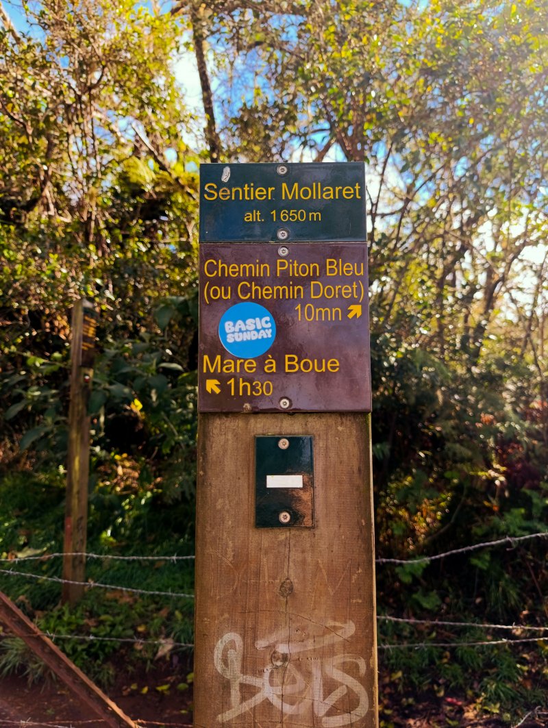 Le sentier historique a été modifié au départ. Il se trouve facilement malgré sa discrétion en suivant les conseils suivants : Marcher jusqu'au petit pont métallique qui enjambe une courte ravine, affluent du Bras de Sainte-Suzanne. On ne peut pas manquer la canalisation qui est parallèle au pont. A une dizaine de mètres, une marche d'escalier a été créée par des cailloux enfermés dans du grillage. Utiliser cet assemblage pour enjamber le tuyau et débuter sur le sentier Mollaret.