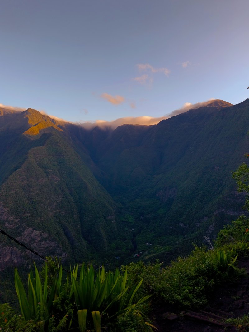 Du belvédère de Bois Court, on a du mal à imaginer, en observant Grand Bassin situé 700 m plus bas, que plus de 200 personnes vivaient là au siècle dernier de la récolte de fruits et légumes ou de la cueillette du café. Désormais, c'est une quinzaine de familles qui s'accrochent encore à cette vallée encaissée, vivant principalement du tourisme. L'école a été définitivement fermée en 1995 et se transforme lentement en ruine. Un monte-charge permet de transporter les matériaux lourds et le ravitaillement plusieurs fois par jour. Les très nombreux randonneurs qui empruntent ce circuit parmi les plus classiques de l'île, descendent à Grand Bassin et remontent en général par le même sentier, le jour même ou le lendemain après avoir passé la nuit au village. Mais la partie la plus sportive se trouve de l'autre côté, lors de la remontée sur les flancs du Piton Bleu par le Sentier Mollaret. Il a été très correctement remis en état même si la vigne marronne tend à reprendre ses droits et une nouvelle portion a été créée le long des prairies pour éviter de longer le Piton Bleu et Lepervanche avant de revenir vers Bois Court par près de 6 km de route. De la route, il y en aura pourtant, mais elle est étroite, bucolique, pastorale et offre par beau temps de magnifiques vues en direction du Volcan.