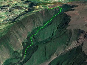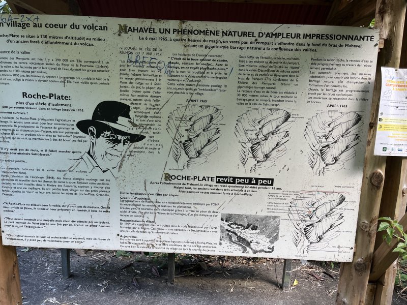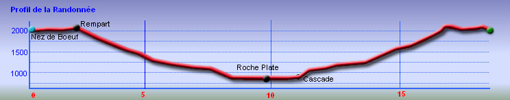 La randonnée est assez longue ; elle débute ici au Nez de Bœuf pour pouvoir profiter au passage du belvédère qui permet de deviner le sentier qu'on utilisera bientôt, 600 mètres plus bas. Cela présente également l'avantage de préparer un peu les jambes à la très longue descente vers la vallée. Les randonneurs moins entraînés ou plus pressés s'approchent au plus près du départ du sentier de Roche Plate où quelques emplacements permettent de stationner. On rejoint le point de vue du Nez de Bœuf depuis le parking et les tables ou kiosques de pique-nique. Le spectacle est grandiose si le soleil est levé. Pour mieux voir le fond et Roche Plate, il faut arriver en milieu de matinée mais pas pour randonner car le retour s'effectuerait en fin de journée. On longe ensuite le bord du rempart parmi les brandes d'altitude et hélas des traces encore visibles de certains incendies. On profite encore de très beaux panoramas sur la vallée et le Cratère Commerson au-dessus, facilement reconnaissable aux lèvres du cratère qui dépassent à l'horizon. Magnifique spectacle si la mer de nuages qui recouvre la vallée n'est pas encore dissipée (Photo 1). Le sentier descend rapidement par quelques lacets caillouteux dans une végétation qui va en s'épaississant au fur et à mesure de la descente (Photo 2). Le regard plonge vers la forêt qui recouvre le haut de la vallée de la Rivière des Remparts (Photo 3). Le sol est correct malgré les hautes marches, bordé souvent d'herbe humide qui mouille les chaussures. Petits tamarins des Hauts, ambavilles, fleurs jaunes ou branles constituent l'essentiel de la végétation. Certaines portions plates sont agréables et seront très appréciées à la remontée (Photo 4). Quelques marches hautes se passent au ralenti pour éviter les glissades. Les à-pics sont naturellement protégés par la végétation. Le sentier est parfois étroit par moment sans que cela soit gênant (Photo 5). Il arrive bientôt en fin de descente. Les bois de couleurs font leur apparition sans que la pente change beaucoup (Photo 6). Quand on arrive dans la partie humide aux alentours du Mapou, on rencontre de très nombreuses espèces d'arbres qui ont réussi à atteindre de belles dimensions (Photo 7). La forêt est touffue et magnifique (Photo 8). Un coup d'œil dans le haut, si la végétation l'autorise, permet de voir le Nez de Bœuf séparé par un rempart vertical duquel coulent quelques cascades (Photo 9). On remarque également de belles orgues basaltiques dans la falaise verticale. La forêt reste touffue, humide et moussue ; les arbres sont beaucoup plus gros et forts mais tortueux et le sentier boueux à cet endroit arrête de descendre un moment. Les aventuriers pourront repérer pour une prochaine sortie le départ du sentier vers les souterrains de la Ravine Citron Galet. On poursuit vers Roche Plate qu'on commence à deviner dans le fond et la végétation va encore changer car la couche trop fine de terre a empêché l'installation des bois de couleurs (Photo 11). Les branles verts l'emportent sur le reste avant d'être remplacés presque en totalité par les goyaviers. C'est dans ces goyaviers serrés les uns contre les autres qu'il faut également dénicher pour une prochaine sortie l'étroit sentier qui mène à Eboulis Rouge pour y admirer de belles cascades ou des bassins d'eau fraîche. Hélas, les goyaviers sont si nombreux que le passage devient de plus en plus difficile. On passe près d'une ancienne piste qui débutait par un pont devenu dangereux et se dirigeait vers le rempart (Photo 13). Le sol du sentier vers Roche Plate est très dur car constitué exclusivement de lave, souvent glissante autant à la descente qu'à la montée (Photo 14). Il est tantôt assez large, tantôt plus étroit mais ne disparait jamais (Photo 15). Les vues sur la vallée sont nombreuses et on peut ainsi mieux estimer le temps de marche jusqu'à Roche Plate (Photo 16). Ce sentier descend de moins en moins quand on s'approche de la rivière des Remparts. On rencontre même certaines portions plates qui permettent de reposer les muscles qui freinent depuis plus de deux heures. C'est à ce moment qu'il faut regarder sur la gauche pour voir les fractures de la Rivière des remparts où coulent par temps de pluie de grosses cascades (Davedinde) qui ont creusé ici une arche naturelle, des marmites et de belles cavernes, presque dangereuses si on s'approche de trop près (Photo 17). Arrivé à 1000 m, une nouvelle pente débute sous les filaos et s'aplanit en arrivant sur les basaltes qui bordent la rivière (Photo 18). On rencontre plus bas le sentier qui part à gauche vers Fond de Sonje. Ce croisement indique la fin proche de la descente (Photo 20). Des murettes en pierres sèches de plus en plus hautes bordent le sentier (Photo 1). Il y en a de tous côtés et même en rive gauche si on prend le temps d'effectuer la visite par l'autre sentier. C'est en pente très douce qu'on parvient à Roche Plate qui débute par un gîte sur la gauche. Quelques étables typiques, entourées de murettes ne contiennent plus les biquettes ou les porcs qui vivaient là au siècle dernier (Photo 22). Si aucune autre destination n'a été programmée, il faut alors songer au retour qui s'effectuera toujours en montée. Le détour par le point de vue de l'Îlet Tommy prendra assez peu de temps et chauffera bien les mollets car la pente y est courte mais très forte (Photo 23). Mais les vues sur les remparts entrecoupés de rivières sont sauvages et splendides. En période humide, de nombreuses cascades sont visibles ou audibles dans les alentours.