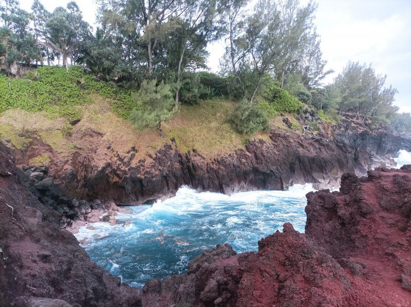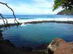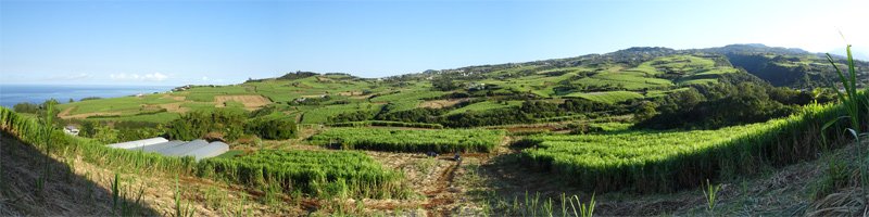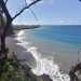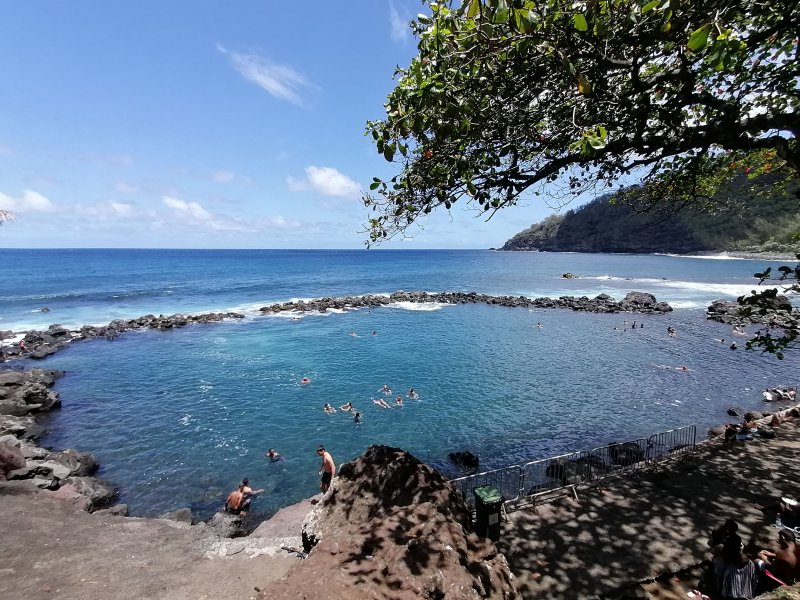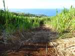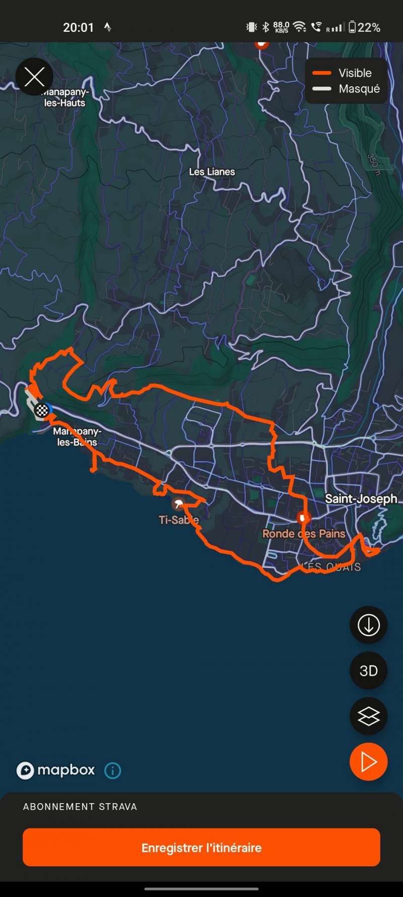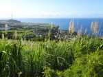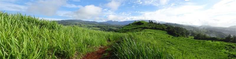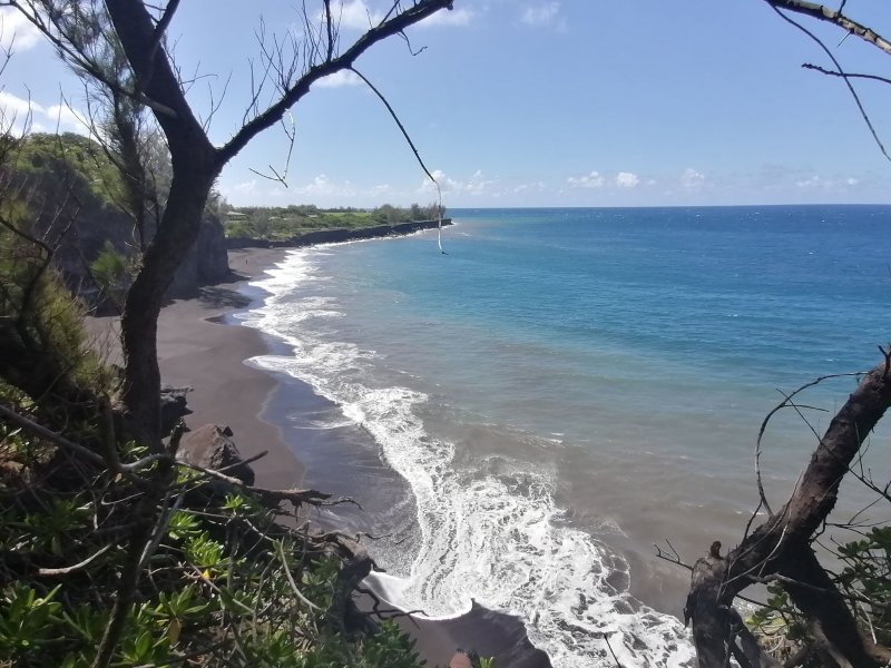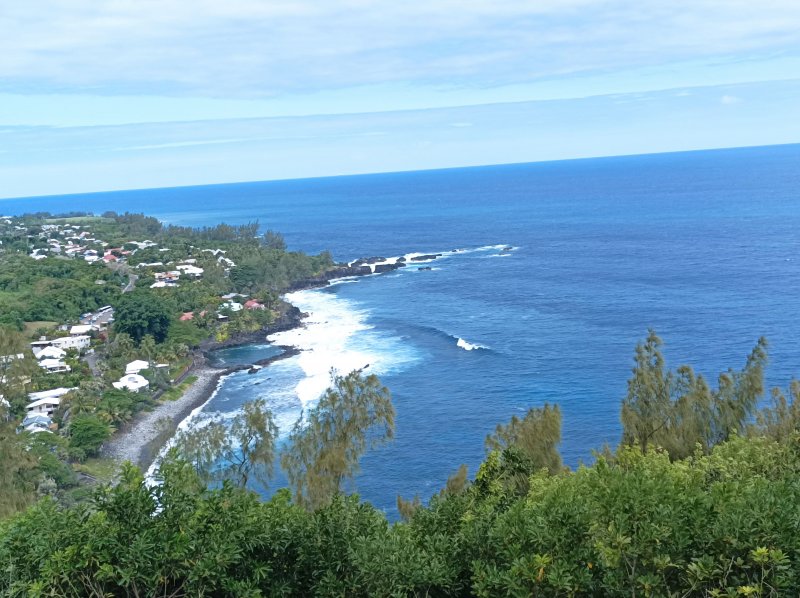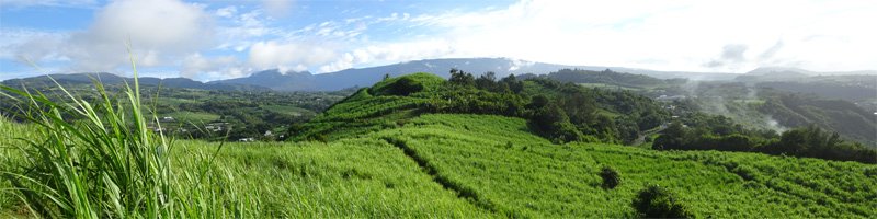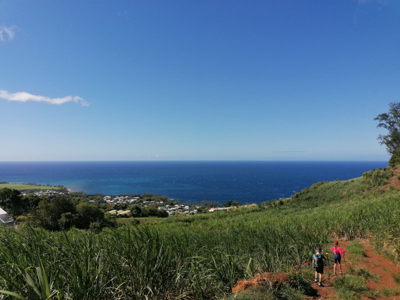 La randonnée débute au point de vue sur l'océan, très connu des touristes dans la descente vers Saint-Joseph après avoir franchi la Ravine de Manapany. Depuis le muret, le paysage est magnifique et permet d'imaginer la fin de la boucle (Photo 1). En face, de l'autre côté de la route, la Source Lucas coule en permanence au milieu de sa touffe de bananiers (Photo 2). Partir vers la Petite Île par un très court tronçon de la RN2. On attaque directement l'ascension du Piton par une piste qui débute de l'autre côté de la route entre deux maisons. C'est la partie basse du Chemin César, tantôt pavée, tantôt recouverte d'herbe ou de feuilles et bordée par endroits de grillages de sécurité en cas d'éboulement (Photo 3). Après de très longs lacets, il se transforme en route étroite bordée de bananiers et pandanus avant de parvenir à quelques habitations. On se retrouve à cheminer près de quelques cases espacées, bordées d'arbres fruitiers entre lesquels on profite de beaux panoramas campagnards (Photo 4). Poursuivre sur le Chemin César. De hautes cannes de chaque côté de l'étroite route bouchent la vue (Photo 5) mais la Ravine de Manapany apparaît si les cannes sont coupées. Quelques champs bordent également la route (Photo 6). Marcher jusqu'au Chemin des Bananiers et tourner à droite aux nouvelles habitations. Poursuivre sur la piste qui file plein sud dans de nouveaux grands champs de canne à sucre (Photo 7). Les panoramas verdoyants sur la droite embrassent toutes les cultures de la canne à Petite Île. La piste oblique sur la gauche et se termine soudainement, remplacée par un très agréable sentier ombragé dans les fougères (Photo 8). Il se termine lui-même pour être à nouveau remplacé par une piste qui remonte dans les maraîchages et les cannes. Cette fois, c'est sur Saint-Joseph et Manapany que porte le regard (Photo 9). On remarque aussi l'épaisseur impressionnante de terre constituant le Piton de Manapany, creusé par les agriculteurs afin de récupérer des terres planes de culture des légumes (Photo 10). La piste ondule encore sous les poivriers avant de rejoindre un lacet de la Rue des Dardanelles. Partir sur la droite jusqu'au prochain lacet. Aussitôt le virage passé, trouver la piste, sur la gauche dans les cannes, qui descend vers la mer (Photo 11). Partir à nouveau à gauche jusqu'au croisement de deux routes. Poursuivre sur l'agréable Chemin du Solitaire pour une marche à plat au début (Photo 12). Il file en direction de Saint-Joseph en longeant un rempart boisé (Photo 13). Le chemin bétonné longe des champs d'où l'on a de larges vues sur la mer et sur le nouveau complexe commercial des Terrass (Photo 14). Repérer le radier de la Ravine Carrosse, le seul important du chemin du Solitaire puis tourner à droite sur la nouvelle route qui contourne par l'ouest cette zone commerciale. Si la Ravine Carrosse est en eau, c'est qu'il y en a aussi dans la Ravine des Grègues. En profiter pour poursuivre jusqu'au radier et observer le bassin et deux courtes cascades (voir les points d’intérêt). Sinon, un large sentier bétonné longe la route entre de nombreux pieds de vétiver et des essences nouvellement plantées (Photo 15). Poursuivre jusqu'au bout sur cet agréable sentier moderne, passer sous le pont de la déviation et longer quelques rues pour se retrouver facilement à la RN2. Traverser la route : attention, pas de passage piéton mais un terre-plein central. Emprunter une courte portion de la Rue des Anones puis de la Rue François-Martin de Manapany. A la fin de la route, un sentier part en direction de Manapany. L'emprunter et bifurquer très vite à gauche en direction de la mer. Ce petit sentier très agréable se rapproche de la mer puis s'en éloigne pour revenir au village (Photo 16). Cet écart permet de se rapprocher de la mer pour apercevoir la côte vers Petit Sable depuis de hautes falaises bordant le village (Photo 17). A la fin de ce joli petit sentier, partir vers Manapany en suivant la route principale qui passe près de l'église (Photo 18). Après 800 m d'une agréable route de village (Photo 19), bifurquer à gauche pour une intéressante visite autour du Grand Cap. On rencontre tout d'abord l'office de tourisme avant de descendre par un escalier qui traverse une aire dédiée au gecko, comportant quelques panneaux. Plus bas, on peut faire le tour du four à chaux et se balader pour découvrir des arches naturelles, rechercher des blenniesPoisson de roche qui passe une bonne partie de son temps à arpenter les roches de bord de mer, hors de l'eau. et des oursins tortues sur les rochers (Photo 20). Le Cap Chevron, battu par les vagues, est très agréable et l'on peut apercevoir la suite de la boucle en direction de la plage de Manapany en s'approchant des ruines du débarcadère. Avant de reprendre la petite route, il est possible de descendre sur le bord des rochers pour apercevoir la petite île à l'horizon (Photo 22). Repartir après cette visite instructive puis regagner le bassin de baignade, toujours fréquenté (Photo 23). Poursuivre en longeant les installations et les galets de la plage (Photo 24) avant d'emprunter l'escalier permettant de retrouver la rue principale. Chercher dans les palmiers et vacoas la présence du gecko de Manapany, hélas de moins en moins visible (Photo 25). Sur la droite, repérer le Chemin des Anglais qui monte fortement par un sol bétonné surchauffé. Plus haut, l'ombre arrive en même temps que le chemin pavé qui serpente entre quelques arbres rabougris dont beaucoup de poivriers et acacias (Photo 26). Le chemin pavé est court mais encore en bon état (Photo 27). Lorsque les pavés laissent la place au béton et que les pandanus se multiplient, c'est bientôt la fin de la montée (Photo 28). On est à quelques mètres de la RN1. Partir à droite pour retrouver l'aire du point de vue sur Manapany.
