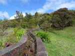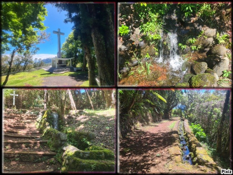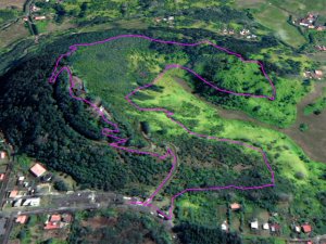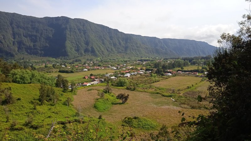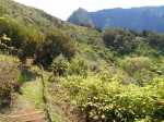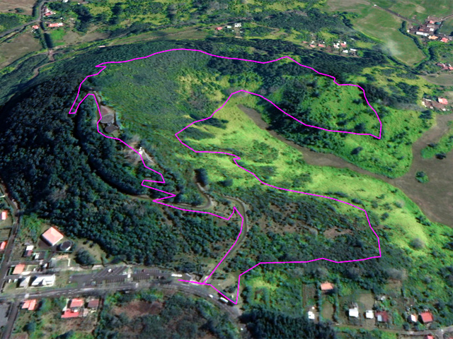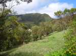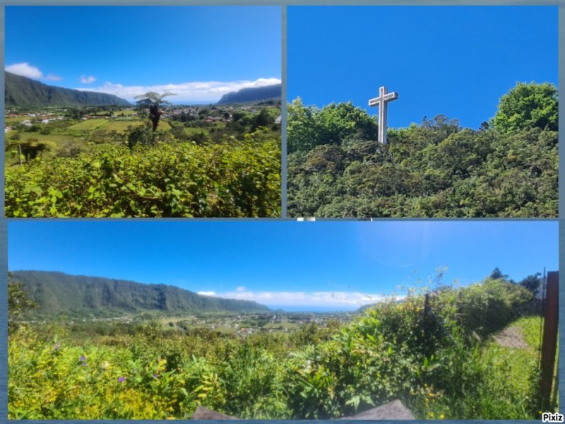 La randonnée débute au village du Bras des Calumets, sur le grand parking près de la route et de l'autel de Notre Dame de la Délivrance qui attire chaque année des milliers de pèlerins le 14 septembre (Photo 2). Avant même de commencer à marcher, on peut profiter de superbes panoramas vers le Piton Textor, le Piton des Cabris ou le Pic des Sables. Près du départ, un ruisseau artificiel donne une petite touche aquatique (Photo 1). L'eau ne coule pas toujours car elle provient du trop plein de la réserve située au sommet. Le sentier débute dans l'herbe au pied de la Vierge et rejoint en descente les premiers sous-bois de goyaviers pour une portion ombragée (Photo 3). Ces goyaviers poussent serrés et étouffent le peu de végétation qui demeure (Photo 4). Le sentier comportant des marches descend assez fortement par moments (Photo 5). Puis il s'assagit pour pénétrer dans l'ancien cratère qui perd petit à petit ses goyaviers (Photo 6). Le cœur du piton est recouvert de vigne d'un vert si particulier qu'on la devine facilement. On domine les hameaux de Bras Creux, Bras des Calumets ou de la Petite Plaine et le regard porte jusqu'à la Plaine des Palmistes (Photo 8). La marche s'effectue à plat sur un sentier large et agréable, débarrassé de toutes ces vignes qui peuvent très vite le recouvrir sans l'intervention des emplois verts (Photo 99). On distingue très bien le cratère, le sentier qui se poursuit sur l'autre face, les gros platanes et le bois de filaos dominé par le Piton des Sables (Photo 10). Pourtant, avant de rejoindre l'autre côté, il va falloir affronter une pente courte mais sérieuse offrant de nouveaux panoramas sur les habitations (Photo 11). On croise et on délaisse le sentier qui file directement à gauche vers la croix. Une forte descente tout en marches et lacets, bordée de fascines de goyaviers, amène doucement vers quelques filaos vite remplacés par d'énormes platanes (Photo 12). Ces platanes, qui poussent surtout dans la région de la Plaine des Palmiste perdent leurs feuilles durant l'hiver austral et dénotent par rapport à la verdure constante des autres essences. Leurs troncs énormes les rendent impressionnants (Photo 15). Le sentier se poursuit en créant une boucle qui contourne la clairière occupant le fond du cratère dont les flancs sont entièrement recouverts de vigne (Photo 16). Puis c'est au tour des cryptomerias de procurer de l'ombre. Le sentier effectue quelques montées et descentes successives avant de parvenir à un petit bois de filaos accueillant quelques ancêtres (Photo 17). Les quelques cryptomerias qui subsistent ont étendu leurs racines à fleur de terre allant jusqu'à boucher le sentier (Photo 18). On retrouve les filaos dans une courte descente sur les aiguilles glissantes (Photo 19). Le sentier remonte à nouveau en direction du sommet en traversant une petite zone de branles (Photo 20). Puis on se retrouve sans transition en plein cœur d'une petite forêt de bois de couleurs. Le sentier serpente entre les arbres. On marche encore sur des racines et on rencontre ça et là quelques panneaux, vestiges d'un ancien sentier botanique (Photo 21). Le sentier franchit un petit pont de bois (Photo 2222) avant de continuer, toujours dans les bois de couleurs en direction du parking (Photo 23). On peut donc terminer en redescendant au point de départ ou emprunter un sentier partant vers la gauche en direction de la petite route qu'on atteint en quelques secondes. Partir vers la gauche, marcher devant les deux grandes réserves d'eau puis rejoindre la Croix Glorieuse (Photo 24). Le toit de l'autel est incurvé vers le centre et donne à l'édifice l'allure d'une ancre de marine. On profite, depuis les barrières, des paysages vers la mer ou le Piton Textor avant de repartir vers le point de départ en empruntant une allée bordée d'azalées (Photo 25). On remarque sur la droite la rigole empierrée chargée d'évacuer le trop plein des réserves. Si on choisit de rester de ce côté du piton, on descendra la piste qui se transforme en sentier et frôle quelques stations du chemin de croix (Photo 26). Le retour est rapide au milieu des fleurs (Photo 27) avec vues sur le Piton des Cabris, le Piton des Fées et celui des Roches (Photo 28). On se retrouve au parking après avoir descendu une portion de route se terminant à un gros platane.