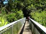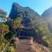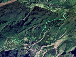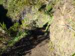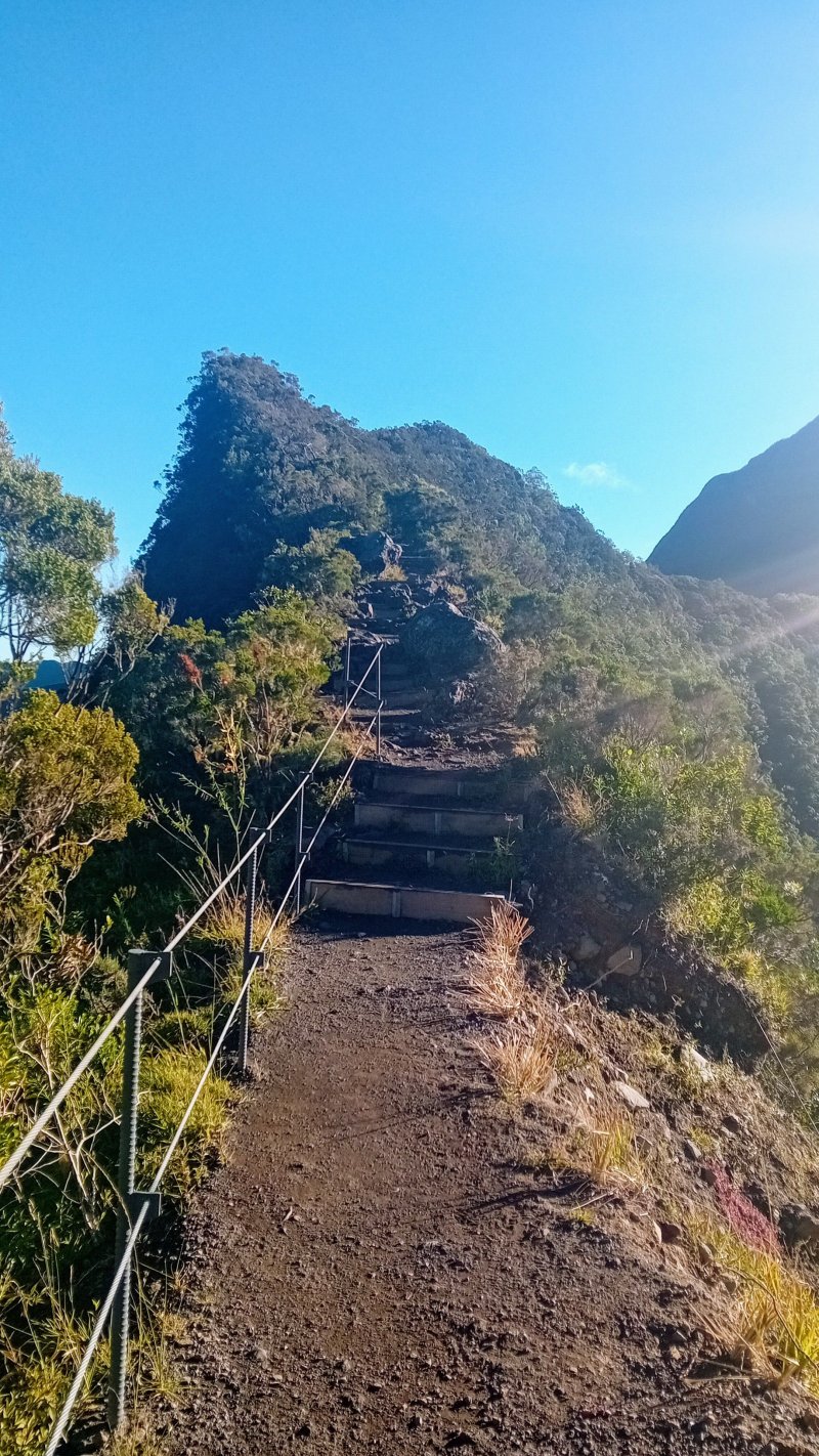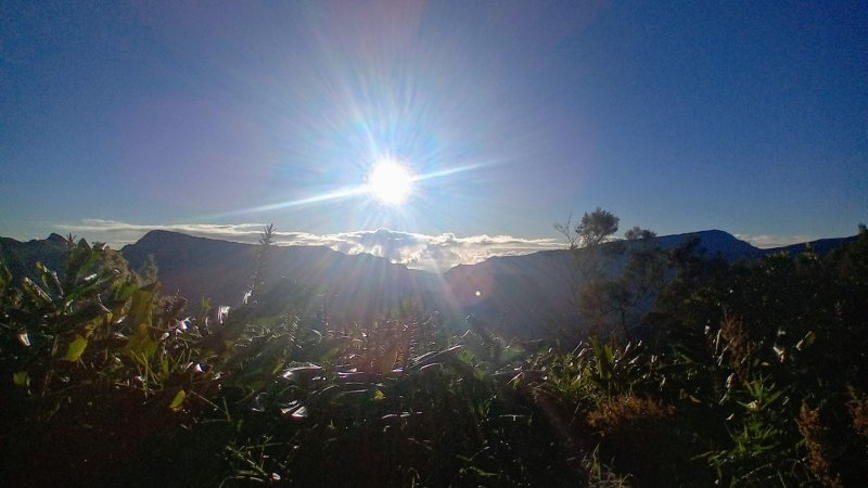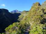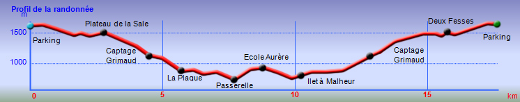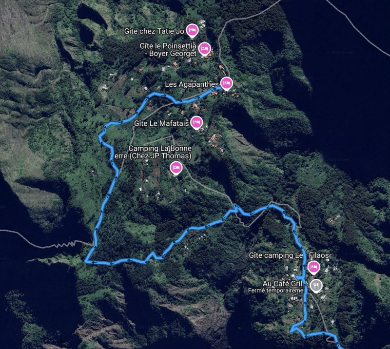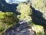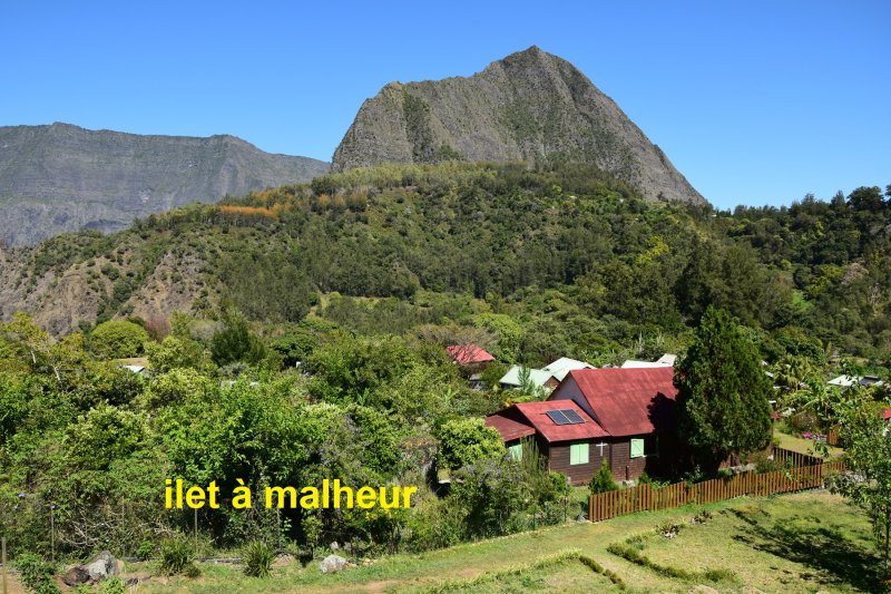 La randonnée débute au parking proche du départ du sentier. Il semble assez étroit et, avec la rosée, on peut se demander s'il en sera toujours ainsi (Photo 1). Il s'élargit très vite et s'enfonce dans la végétation constituée de mahots, fleurs jaunes, fanjans et déjà quelques longoses (Photo 2). On bénéficie de larges panoramas sur le Cimendef qui reçoit les premiers rayons du soleil (Photo 3). Le sentier part dans tous les sens pour rester le plus plat possible et pour franchir quelques jeunes ravines qui se traversent sans danger sur des gués rocheux. Il ne comporte aucun danger ; de plus il est toujours sécurisé lorsqu'il est étroit ou glissant (Photo 4). Il est parfois boueux sur de courtes distances (Photo 5). On arrive sans effort à la Ravine Bémale dont le gué est le plus empierré de gros galets. Avant de traverser, on peut admirer la profonde vallée du Bras Bémale sur la droite en direction des flancs de la Marianne et l'on peut même apercevoir le sentier Augustave par endroits. On a devant soi la pente assez forte qui monte au rein de Deux Fesses. Rien d'inquiétant quand on la voit de loin. De plus près, c'est un plus stressant pour les randonneurs n'aimant pas le vide. Les marches sont nombreuses, pas trop hautes et une main courant rassure (Photo 6). Cette montée sans garde-fou s'effectue rapidement pour finir le long de la falaise où un garde-fou est bien là mais encore plus inquiétant que s'il n'y avait rien puisqu'il penche dans le vide (Photo 1)! Une aiguille rocheuse cache à peine le Morne de Fourche qu'on verra plus loin dans son ensemble (Photo 8). Le passage de Deux Fesses est plus impressionnant par les deux canyons qui le bordent que par le vertige qu'il procure car la végétation crée deux murs de verdure (Photo 9). Les panoramas sont magnifiques sur la droite vers le sentier Augustave ou à gauche en direction d'Aurère dominé par le Piton Cabris (Photo 10). Poursuivre jusqu'au Plateau de la Sale qu'on atteint en quelques minutes. Le terrain est plat. On remarque souvent de larges plaques de boue car l'eau a du mal à s'évacuer. Le sentier est très large et encombré de racines. Un oratoire sur la droite (Photo 12) sert de repère pour trouver le sentier abrupt qui part sur la droite en direction du Bras Bémale et du Sentier Augustave ; mais il est abandonné et difficile à suivre, tout en lacets courts et raides. On côtoie de beaux arbres dont certains ont atteint le siècle d'existence (Photo 13). On quitte le plateau par un rein étroit où poussent de grands filaos (Photo 14). Le sentier est assez facile, peu pentu dans les bois de couleurs et goyaviers (Photo 16). Il est large et constamment entretenu (Photo 17). Quelques points de vue sont installés le long du sentier pour profiter très souvent de nouveaux panoramas sur le Piton Cabris (Photo 18). C'est ensuite une longue descente raide, en lacets, technique parfois quand on rencontre des racines ou de hautes marches. Il rejoint un réservoir cimenté abandonné au Captage Grimaud. Les filaos reviennent et on ne les quittera plus guère jusqu'à la fin (Photo 20). La fin de la descente est ombragée sous les filaos sur un adorable sentier couvert d'aiguilles sèches qui peuvent s'avérer glissantes lorsque la couche est épaisse (Photo 21). Certains sous-bois sont presque nus alors que d'autres sont couverts d'invasives de toutes sortes. La jonction entre les deux îlets à Malheur s'effectue presque à plat sur un agréable sentier dans la verdure (Photo 22). Après avoir traversé une petite ravine, on parvient au croisement avec le sentier filant vers l'Îlet à Bourse. Poursuivre vers l'Îlet à Malheur et ne pas manquer, par un court détour, le vieux cimetière et, plus proche du sentier, la belle petite chapelle et sa cloche à l'extérieur (Photo 24). Le Piton Cabris qu'on n'a pas quitté depuis le Plateau de la Sale, est tout proche, imposant au-dessus des habitations (Photo 23). La jonction avec la passerelle dressée au-dessus du Bras Bémale s'effectue sur de gros cailloux dans les chouchous (Photo 25). L'étroit édifice surplombe le Bras Bémale qui coule 50 m plus bas dans un étroit canyon (photo 26). La montée à Aurère peut s'effectuer par plusieurs voies bien indiquées avant ou après avoir franchi l'étroite passerelle. La montée la plus rapide à Aurère débute sous les filaos par des marches nombreuses et se poursuit dans la terre ou les gros cailloux bordés de chouchous (Photo 27). On atteint facilement Aurère d'où il est possible d'effectuer un détour vers Bord Bazar pour profiter de nouveaux panoramas sauvages. Le village est vaste et la première partie s'arrête symboliquement à l'école. Si aucune étape n'est prévue vers Dos d'Ane ou d'autres lieux de Mafate, le retour peut s'effectuer par le même itinéraire. La carte ci-dessous prévoit une descente vers l'Îlet Jardin qui offre de beaux points de vue sur la vallée du Bras Bémale en direction du Sentier Augustave. Une fois l'Îlet à Malheur retrouvé, il faut se mettre en tête que le retour à Bord Martin comportera de nombreuses montées qui paraîtront interminables ou difficiles dans la zone de lacets.
