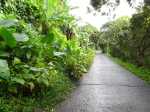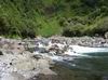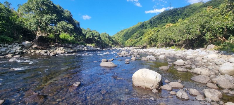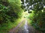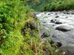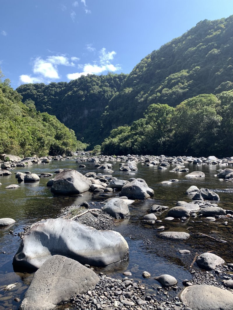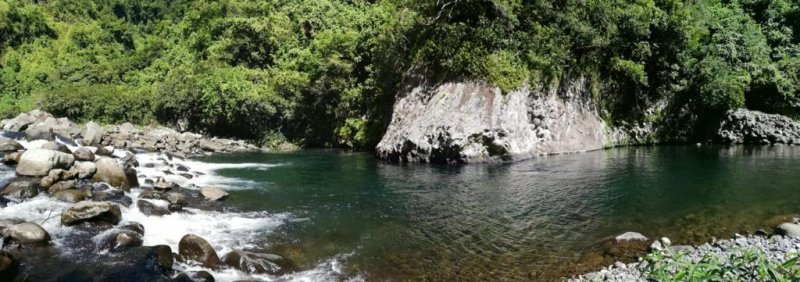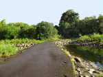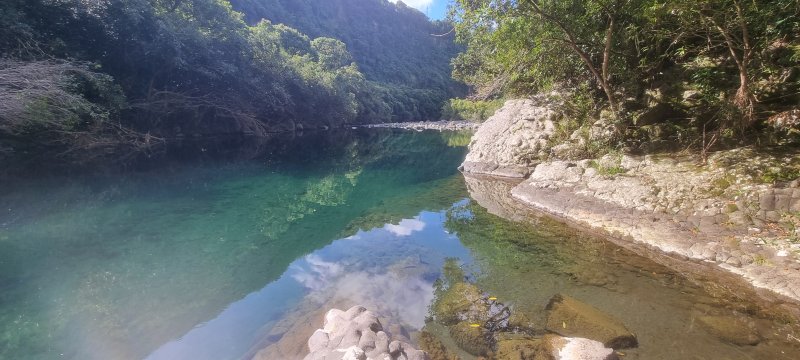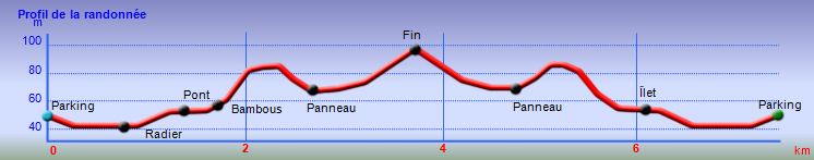 La randonnée débute à la D54 où un emplacement de stationnement se trouve immédiatement après avoir emprunté la petite route de l'Îlet Coco. On peut également stationner un peu plus loin près d'un modeste temple tamoul. Partir sur la route étroite sans grand risque avec la circulation (Photo 1). La jonction est courte avec l'Îlet Coco et permet de traverser de nombreux vergers ou une vaste plantation. On repère déjà de superbes pieds de letchis (Photo 2). Plus loin, on franchit un radier assez long qui n'est dangereux qu'en cas de fortes eaux durant les épisodes cycloniques importants (Photo 3). Prendre une minute pour lire le panneau relatant les crues importantes de la rivière. Repérer les deux marques en haut du poteau pour voir qu'il ne fait pas bon traverser à certaines périodes (Photo 4). L'îlet est composé de cases dispersées et entourées de nombreux arbres fruitiers (Photo 6). Suivre le Chemin de l'Îlet Danglas, traverser le hameau et emprunter la piste caillouteuse sous les letchis et autres arbres fruitiers (Photo 7). Elle ne présente aucune difficulté car elle est totalement plate. Elle passe plus loin un pont métallique au-dessus d'un bras de la rivière (Photo 8). On arrive plus loin à de grosses touffes de bambous situées en bord de rivière (Photo 9). L'eau y est assez calme et l'on peut même envisager une baignade (Photo 10). Une nouvelle piste commence aux touffes de bambous. Un panneau en interdit la circulation mais pas la marche. La pente est assez forte par endroits et des portions ont même été goudronnées pour un meilleur maintien du sol (Photo 11). Cette piste est souvent humide mais on peut facilement éviter la boue s'il y en a (Photo 12). On rencontre tout de même de belles flaques créées par les pneus. Puis la piste se met à descendre vers la rivière vers une bananeraie où se situe un autre panneau (Photo 13). Il demande de ne pas pénétrer dans la propriété et invite à emprunter le sentier à quelques mètres de là (Photo 14). Le sentier débute dans l'herbe et descend rapidement vers le cours d'eau par des marches et déjà de nombreux galets. La balade est terminée et il faut désormais cheminer le long des berges en cherchant le meilleur passage entre les roches (Photo 15). Ne pas marcher trop vite si elles sont glissantes. On coupe plusieurs petits cours d'eau finissant leur course dans la rivière et se passant facilement à gué (Photo 16). La marche peut être dangereuse si une chute se produit sur les galets. La trace est parfois assez bien visible mais sur de courtes portions (Photo 17). Le cours d'eau est par endroits fougueux (Photo 18), en d'autres très calme (Photo 19). Après le petit plateau en rive gauche qui entoure l'îlet Bethléem, c'est une haute falaise infranchissable qui prend le relais. La rivière est très calme en général, mais on passe parfois près de certaines parties transformées en torrent en raison de la pente ou de l'étroitesse du lit (Photo 23). Chaque torrent est suivi d'un bassin souvent large et profond qui incite à la trempette (Photo 24). La rivière fait un peu plus haut un virage sur la gauche et devient trop difficile à remonter en famille. La vallée devient de plus en plus étroite vers l'amont et se réserve aux professionnels. Il faut dire que depuis sa naissance sur les hauteurs de Bébour, la rivière a eu le temps de grossir de dizaines d'affluents malgré tout ce qu'elle offre au passage à l'usine hydroélectrique de Takamaka. S'approcher du gros rocher près duquel on peut prendre un bon casse-croûte (Photo 26). Eviter d'emprunter ce sentier en fin d'année afin de ne pas être tenté par les fruits rouges qui pendent des arbres ! La cueillette en est d'ailleurs interdite et de nombreuses pancartes sont constamment là pour rappeler le caractère privé de ces plantations.