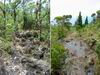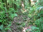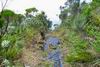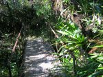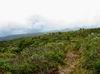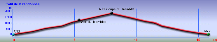 La randonnée débute au parking près du kiosque qu'on rencontre peu après la route qui redescend au Quai de Sel et vers la Pointe du Tremblet. La montée est agréable au départ sous les goyaviers jusqu'au panneau qui marque la limite du Parc National (Photo 1). Cette borne de bois marque le début d'une magnifique forêt de bois de couleurs des Bas où fort heureusement il reste encore quelques arbres à travers les goyaviers (Photo 2). Le sentier passe plusieurs fois au plus près de la Ravine Pont Rouge. Ne pas hésiter à y descendre, au moins au retour, pour dénicher les cassés, parties moussues, gouffres ou grottes (Photo 3). Le parcours, un peu encombré mais toujours visible, serpente entre d'énormes troncs de tans rouges, bois de rempart ou bois maigres (Photo 4). Plus on monte, plus ils se recouvrent de mousse et d'épiphytes. Le cheminement s'effectue à l'ombre en suivant constamment la Ravine Pont Rouge sur un sentier constamment recouvert de cailloux moussus ou de racines (Photo 5). Certains tronçons montent peu sur de gros cailloux glissants (Photo 6), d'autres sont en fortes pentes sur d'anciennes marches en bois (Photo 7). Ce sont surtout les racines qu'il faut surveiller de près car le pied glisse plus vite qu'ailleurs (Photo 8). Après 500 mètres d'altitude, les goyaviers ont diminué et on frôle de magnifiques arbres aux troncs imposants (Photo 10 et Photo 11). L a troisième passerelle au plateau aluminium marque quant à elle le début des premières difficultés (Photo 12). Des marches de plus en plus hautes font redoubler d'efforts. Les mains sont souvent nécessaires pour éviter les glissades. Les quelques trouées dans entre les arbres permettent de voir la forêt qu'on s'apprête à traverser (Photo 13). On rencontre encore la Ravine Pont Rouge qui est aussi chaotique qu'en bas (Photo 14). Les fougères bordent le sentier. On rencontre ça et là des palmistes et, beaucoup plus nombreux, des pimpins, ces pandanus des hauts qui poussent ici en véritables petites forêts (Photo 16). Les fanjans sont aussi nombreux mais se voient mieux qu'en forêt des bas car le reste de la forêt diminue en taille (Photo 17). En revanche elle ne diminue pas en nombre d'espèces qui, ici, se recouvrent de mousse (Photo 18). Après une douzaine de passages sur passerelles d'aluminium, on arrive au départ du sentier vers le Piton de Takamaka et la Coulée de 1986. Quelques trouées permettent des points de vue sur l'océan en contrebas. Une fois franchi l'ancien emplacement de l'abri du Tremblet (Photo 20), décider ou non de remonter un peu la Ravine Pont Rouge pour une aventure différente. Plus loin, le sentier devient souvent une véritable pataugeoire glissante (Photo 21). Entre les cailloux qui précédaient et ces longues flaques où le pied s'enfonce, on a vite fait le choix (Photo 22). Plus on s'élève et plus on voit la côte reconnaissable à ses longues vagues blanches (Photo 23). La végétation diminues encore autour du sentier spongieux (Photo 24). A 1700 m, si le brouillard ne cache pas tout, on a sous les yeux une grande partie du Sud Sauvage (Photo 26). La pente a diminué depuis un kilomètres mais la marche n'est est pas plus facile pour autant. Heureusement que les points de vue sur le brûlé font oublier les chaussures remplies de boue (Photo 27). Comme elles sont crottées, inutile de chercher à éviter les nouvelles plaques de boue pour les 500 m qui restent à parcourir. On termine au Nez Coupé du Tremblet qui permet de beaux panoramas sur le Piton de la Fournaise et la caldeira jusqu'au Pas de Bellecombe. Une option permet de poursuivre, toujours dans la boue, vers le Piton de Bert puis de manière très agréable vers le Piton Rouge et la Plaine des Sables. Le retour, beaucoup plus rapide car en descente ne doit pas être sous-estimé en raison de la hauteur des marches et des glissades possibles sur la terre boueuse.