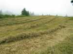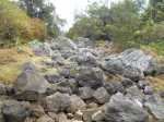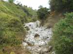 La boucle débute sur la rue Alexandre Bègue, près de la chapelle et de l'école, afin d'entamer la traversée de Notre Dame des Champs avec une circulation moyenne mais des trottoirs assez larges pour marcher sans danger. Marcher et chercher sur la gauche le départ du Sentier Roullin qui débute par une volée de courtes marches entre les clôtures des habitations (Photo 1). Les marches sont remplacées un peu plus haut par un sol bétonné qui traverse les jardins fleuris en longeant quelques cases entourées de grillages (Photo 2). Il est toujours agréable de prendre ces raccourcis étroits pour mieux saisir l'atmosphère d'un village (Photo 3). Heureusement, les meutes de chiens habituels sont plus rares. Il se transforme encore en sentier étroit, bordé de grands galaberts, glissant si mouillé et comportant quelques marches taillées à même la terre (Photo 4). Il rejoint des habitations qu'il faut contourner par la gauche avant de reprendre à droite en direction de la Route Emmanuel Payet sur des portions qui ont souffert de l'invasion de longoses, galaberts et vigne marronne (Photo 5). Fermer les yeux à certains endroits pour ne pas voir les ordures mais les ouvrir tout de même pour ne pas marcher dessus ! Le franchissement du Bras Mouton, étroit et rocailleux, s'effectue également au milieu des vignes marronnes (Photo 1). La route bétonnée qu'on découvre est étroite et également bordée de ces plantes souvent piquantes (Photo 7). Elle est tout en lacets courts qui traversent les prairies, longent les petites fermes, champs ou cases sur une pente raisonnable (Photo 8). Les panoramas sur l'océan sont nombreux surtout en direction de la Saline et de l'Ermitage (Photo 9). Les acacias noirs bordent le plus souvent le chemin lorsqu'il n'y a pas de prairies et leur odeur agréable se repère de très loin (Photo 10). Le regard porte aussi vers Saint-Leu, au-dessus des champs (Photo 11). Les troupeaux sont partout et ne semblent pas effrayés par le passage des randonneurs (Photo 13). Il faut dire qu'à 1000 m d'altitude, la température est idéale pour l'élevage et qu'ils vivent ici sereinement. La route devient plate à un moment, avant de rencontrer la Route Vaudeville qu'on emprunte en partant à gauche au croisement. La pente n'en est pas terminée pour autant. On se retrouve en face d'une pancarte de rue indiquant le Chemin des Cryptomerias. Prendre à gauche et passer plusieurs fermes ou un centre équestre ainsi que des ravines dont celle des Colimaçons (Photo 16). La pente cesse, longe encore quelques prairies et la route descend doucement dans un bois de cryptomerias (Photo 17). Une aire de pique-nique constituée de tables et kiosques occupe le couvert des arbres autour d'un croisement, lieu idéal pour une pause après cette longue montée de 600 m (Photo 18). Prendre la première route sur la gauche (Photo 19) qui descend vers quelques fermes puis se transforme en deux bandes de roulement bordées de pelouse plus ou moins haute en fonction de la saison (Photo 20). La pente est faible, les troupeaux sont nombreux dans les prés (Photo 22), l'herbe est omniprésente (Photo 21) et les panoramas très larges sur la Saline les Bains. Les bandes de roulement sont parfois soulevées par les racines des cryptomerias poussant à leur côté et le passage des véhicules en dehors des bandes a tendance à abîmer cette belle route. Mais en règle générale, ce long tronçon de route pastorale est un vrai plaisir de calme et de solitude (Photo 23). Quelques cryptomerias et de longues clôtures bordent cette route originale (Photo 24). Les lacets sont nombreux et les raccourcis rares mais on ne fournit aucun effort hormis celui de regarder autour de soi les belles prairies vallonnées (Photo 27). Ne chercher aucun raccourci car toutes les pistes rencontrées se terminent en terrain privé sauf une en fin de parcours dont l'état n'est pas toujours excellent. Guetter seulement la grande réserve d'eau circulaire située dans un lacet vers la droite. C'est là que commence le Chemin Auguste Bourdon qui ramène sans problème à la Route Hubert Delisle à deux pas de la Ravine des Colimaçons au fond constitué de larges plaques de basalte (Photo 28). Il ne faut que deux minutes pour rejoindre véhicule garé dans le village de Notre Dame des Champs.