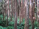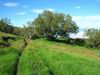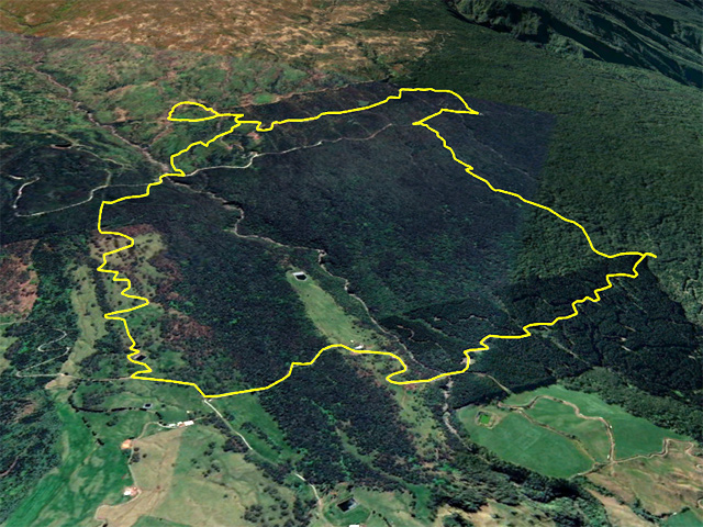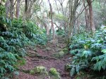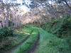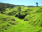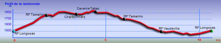 La randonnée débute dans les cryptomerias en bordure de la Route Forestière du Tévélave, au croisement de la Piste Forestière des Longoses. Le début du Sentier de Grande Terre qu'on rencontrait officiellement 200 mètres plus loin a petit à petit été abandonné pour être remplacé par un raccourci qui est devenu aussi large que le précédent (Photo 1). La montée est agréable dans la fraîcheur des sous-bois de tamarins malgré les racines omniprésentes ou quelques pierres moussues (Photo 2). Plus haut, on grimpe régulièrement sous les tamarins des Hauts envahis de longoses sur un tapis d'herbe (Photo 3). Quelques fougères arborescentes continuent à vivre malgré l'ombre des grands arbres (Photo 4). Les portions plates sont rares mais bienvenues (Photo 5). A peine deux kilomètres plus loin, on rejoint la route forestière des Tamarins dont les fossés sont rougis par de vastes tapis de renouées (Photo 6). Il faut alors partir vers le Tévelave sur le béton pour retrouver le beau sentier Mario qui commence juste à côté d'une grande aire de pique-nique très fréquentée en fin de semaine (photo 7). Il chemine lui-même sous les tamarins, toujours dans les longoses et sur un tapis d'herbe et de feuilles (Photo 8). Il coupe à deux reprises la RF du Haut Tévelave. Après un raccourci d'un important lacet, obliquer à gauche pour emprunter la piste qui part à plat plein Nord-Ouest (Photo 10). Elle coupe tour à tour les Ravines Laforge, Creuse et de l'Echelle, toutes les trois envahies de longoses. Cette piste change d'aspect un peu plus loin où les arbres sont moins nombreux (Photo 11). La dernière partie descend légèrement dans les fougères, bois de couleurs et de rares cryptomerias (Photo 12). L'odeur de la fumée peut attirer l'attention. S'arrêter au passage près des fours des charbonniers pour mieux comprendre le fonctionnement de ces cloches fumantes avant de repartir dans la même direction jusqu'au départ de la RF de la Caverne Tabac. Cette piste comporte quelques portions bétonnées à l'endroit des radiers (Photo 14). Suivre cette piste qui coupe plus haut le Sentier des Tamarins. Partir sur la gauche et effectuer une boucle autour de la Caverne Tabac sur des sentiers assez peu visibles mais dans une végétation rabougrie qui ne cache jamais l'horizon et empêche un éventuel égarement (Photo 15). La caverne est en réalité une bouche d'un très ancien tunnel de lave un peu caché par les herbes, fougères et autre plantes poussées à la suite des incendies (Photo 16). Elle n'est pas très vaste mais peut accueillir quelques personnes pour abriter de la pluie ou durant une pause ombragée (Photo 17). De la caverne, on voit très bien le radier bétonné de la piste un peu plus bas qu'on rejoint facilement en marchant sur les coulées de lave anciennes (Photo 18). De là, il faut repartir par la droite vers le Sentier des Tamarins et le suivre jusqu'à la Ravine du Trou lorsqu'il rejoint la route. Les longoses, fougères et bringeliers envahissent le sentier qui a beaucoup de mal à résister (Photo 19). Fort heureusement il est assez pratiqué mais mériterait de l'être un peu plus. Une petite descente amène vers le gué à sec de la Ravine Nono et on entend déjà les premiers véhicules (Photo 20). Un passage un peu abrupt est facilité par un escalier rustique en planches de tamarin appuyé sur une barre rocheuse verticale (Photo 21). A la route, partir à droite et stationner une minute pour apprécier l'important trou de la ravine éponyme. Par fortes pluies le spectacle est assuré à cet endroit. Poursuivre jusqu'à une citerne et emprunter aussitôt la Piste des Camélias (Photo 23). Elle est fermée d'une barrière qui réglemente le trafic des véhicules. Elle descend en lacets jusqu'à un long coupe-feu qui disparaît petit à petit dans la végétation mais on peut prendre un superbe raccourci nommé Ligne des Eucalyptus qui mène à une clôture de barbelés destinée à arrêter les troupeaux des prairies voisines. En face, une autre barrière ferme la piste des Camélias mais une échelle permet de passer la clôture. On retrouve alors la piste qui longe une réserve d'eau et serpente ensuite dans une très grande prairie très verdoyante (Photo 24). De magnifiques tamarins qui procurent de l'ombre aux bovins, bordent cette piste (Photo 25). Des barrières et la présence proche de troupeaux peut faire penser à un passage privé mais il n'en est rien. Le propriétaire des lieux, rencontré lors de cette boucle le confirme. Il ne supporte plus les chasseurs qui ne referment pas les barrières et espère que les randonneurs agissent différemment. Merci d'avance de bien refermer une clôture si elle était fermée à notre arrivée. La fin de la descente est un plaisir pour les yeux, pour les amoureux de la campagne (Photo 26). La dernière partie de la boucle s'effectue sous les cryptomerias de la Route Vaudeville qui finit à la Ravine du Trou (Photo 27). La fin emprunte la Piste des Longoses au bout de laquelle attend sagement le véhicule. Là encore, les cryptomerias changent des prairies, des landes sauvages et des forêts de tamarins (Photo 28).