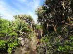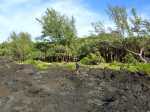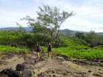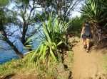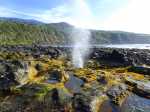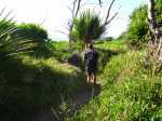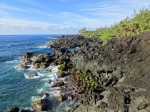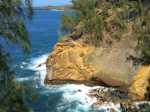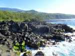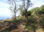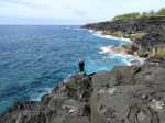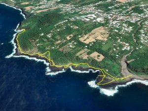 La randonnée débute à la fin du Chemin de la Marine près d'une statue de la Vierge et de la vallée de la Ravine Vincendo (Photo 1). De l'autre côté de la ravine, se trouve une plage qui a la particularité de disparaître en hiver. En période chaude, la plage de sable gris ressemble à toutes les autres. Quelques mois plus tard, le sable est emporté par les houles australes. Il est possible de remonter le fond très caillouteux de la ravine jusqu'au grand cassé accueillant de belles cascades en cas de crues du cours d'eau. Tout près, quelques tables accueillent les pique-niqueurs à l'ombre des nombreux vacoas (Photo 2). En prenant garde à la chute qui pourrait être douloureuse sur les basaltes acérés, se diriger en premier vers le souffleur du Cap Poisson d'Ail en contournant quelques petits bassins tout en visant le petit geyser qui jaillit par intermittence (Photo 3). Le souffleur, qui peut éclabousser si l'on se trouve face au vent est moins dangereux que la profonde faille dans laquelle s'engouffrent les vagues. Prudence avec les enfants. Classée ZNIEFF (Zone Naturelle d'Intérêt Ecologique Faunistique et Floristique) l'endroit abrite une faune littorale variée (Photo 4). Rejoindre le sentier en effectuant une nouvelle halte à la marine, une bande de béton pénétrant dans la mer destinée à mettre les bateaux à l'eau ou à les ramener à terre de manière souvent sportive (Photo 5). Rejoindre le couvert des vacoas après cet écart très minéral et aquatique en prenant garde à l'endroit où poser les pieds (Photo 6). La petite route bordée de tables pour le casse-croûte du retour n'est qu'à quelques mètres s'il n'est pas possible de fouler le Récif (Photo 7). Entamer la balade en bord de mer qui se terminera à Cap Jaune. Un sentier très bien marqué passe souvent au plus près des falaises. On peut à tout moment quitter ce parcours pour se rapprocher du bord et admirer la mer et les rochers. Par temps de houle, attention aux vagues qui peuvent être projetées très haut. Par mer calme, les pêcheurs s'adonnent calmement à leur loisir favori (Photo 8). La progression s'effectue à plat. La seule difficulté consiste à éviter les roches au sol (Photo 9). La végétation est assez pauvre le long de ce littoral aéré par les vents venant du large, chargés de sel. Seuls les maniocs marrons, les pandanus et les filaos résistent assez bien à ce climat particulier (Photo 10). Avant le Cap Chien, les rochers dominent dans le paysage et l'espace entre la végétation et la falaise diminue (Photo 11). Par fortes houles, le lieu est arrosé d'embruns. Un écart est possible dans les terres par un sentier passant dans la verdure. La promenade se poursuit sur un sentier toujours bien marqué, non balisé mais impossible à perdre des yeux (Photo 12). On rencontre de larges zones couvertes de manioc marron (Scaevola taccada – Photo 13) mais c'est surtout le gazon bord de mer, endémique, (Zoysia matrella) qui l'emporte par d'imposantes surfaces couvertes (Photo 14). Ce gazon est constellé de pierres sculptées par l'érosion. Certaines peuvent prendre des formes très caractéristiques (Photo 15). Les amateurs de curiosités minérales chercheront en bordure de falaise ou dans les broussailles qui les bordent les deux sorties de tunnel de lave de plus en plus cachées et menacées par les vagues (Photo 16). La côte déchiquetée au Cap Chien accueille souvent des pêcheurs ne craignant pas de descendre au plus près de l'eau (Photo 17). Le sentier pénètre à nouveau sous les vacoas pour de courtes distances (Photo 18). Il retrouve très vite le bord de falaise entre les filaos (Photo 19). On s'approche ainsi du Cap Jaune par une marche toujours aussi agréable à la portée de tous (Photo 21). Le sentier se rapproche de plus en plus de la falaise mais la végétation protège du vide (Photo 22). Après une courte traversée sous le couvert d'arbres plus nombreux longeant une petite propriété protégée par un grillage, on parvient au point de vue sur le Cap Jaune. Le spectacle des hyaloclastites jaunes de l'autre côté de la petite anse vaut à lui seul le déplacement (Photo 23). Le sentier se poursuit en longeant le grillage vers le Piton de Vincendo, les champs et le village du Plateau. Un arrêté interdit la descente vers la mer par le sentier escarpé. Il faut donc faire demi-tour en direction de la marine de Vincendo en empruntant le même sentier ou les nombreuses variantes en direction des falaises. Les "contrevenants" devront se préparer à freiner souvent dans cette rude descente rendue terreuse par les multiples passages (Photo 24). On parvient à une crique au fond rempli de roches jaunes détachées de la falaise battue par les vagues (Photo 25). Mais quel plaisir pour les yeux que de contempler cette curiosité géologique qu'on retrouve également à quelques kilomètres de là vers le Piton de Grande Anse (Photo 26). Le spectacle est bien moins impressionnant par ciel nuageux qui empêche les jaunes et ocres de s'exprimer.