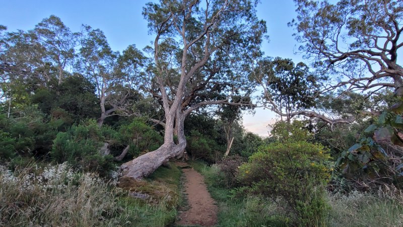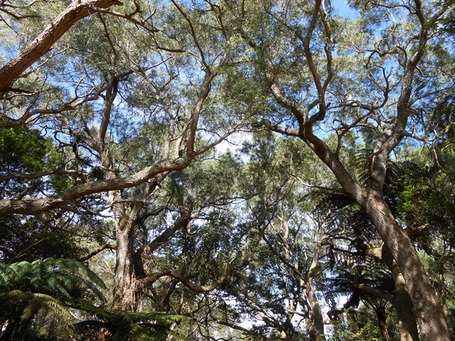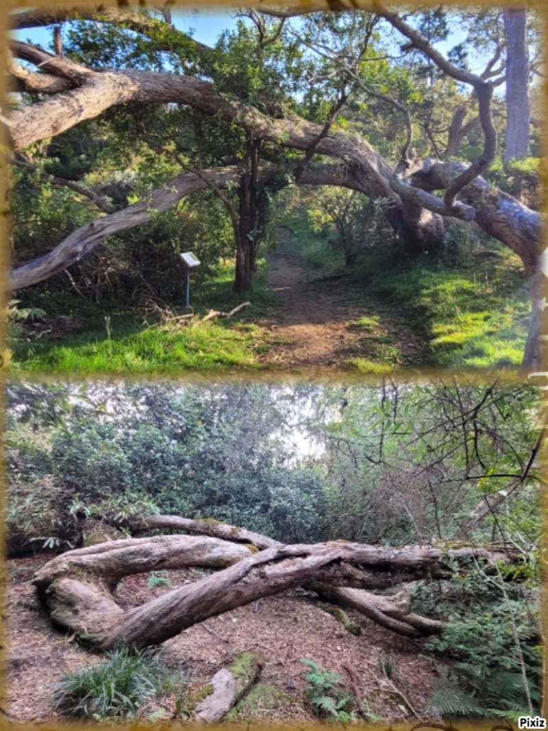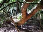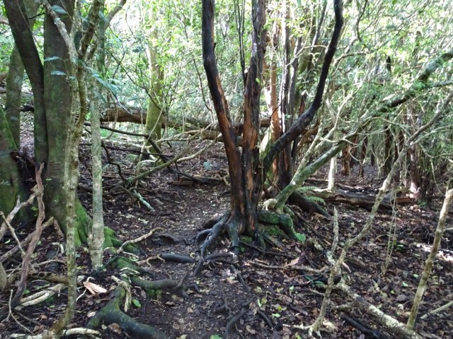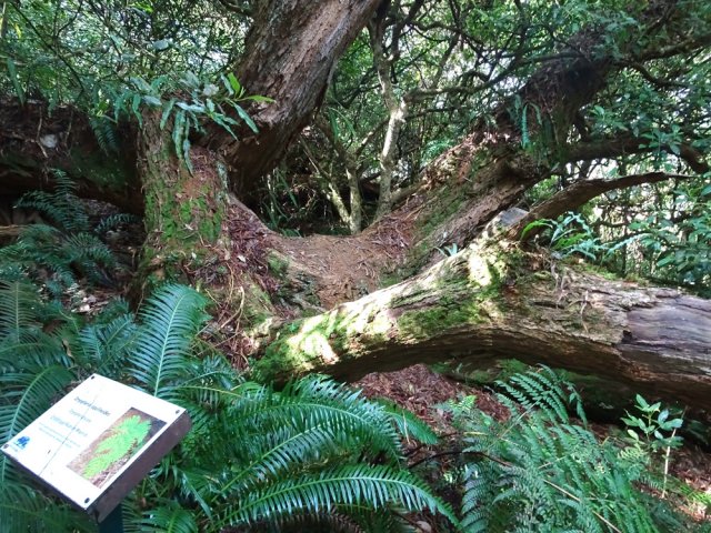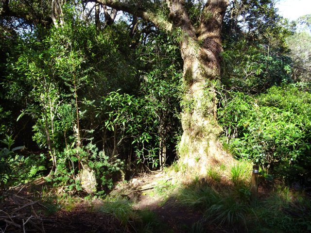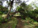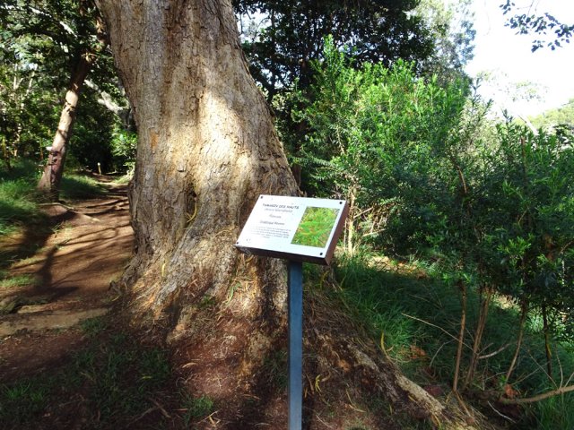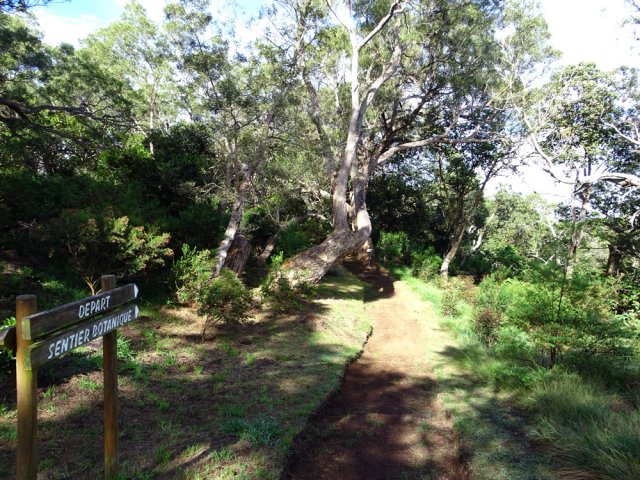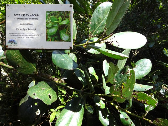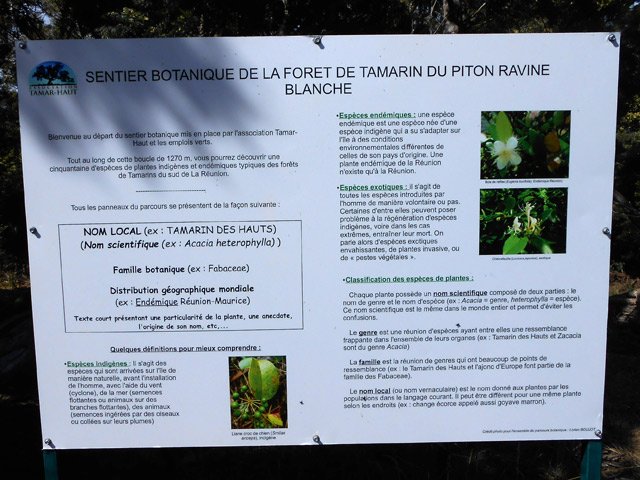 Il est toujours difficile de présenter un sentier botanique car il est très vite saccagé et les descriptions d'un moment ne sont plus valables peu de temps après. Souhaitons que celui-ci, situé assez près des habitations du village de la Ravine Blanche, gardera encore longtemps ses petites pancartes descriptives. La région est pauvre en essences de bois de couleurs car c'est le tamarin des hauts qui domine. On comprend d'ailleurs que si le sentier est autant tortueux par moments c'est qu'il a fallu zigzaguer de plante en plante afin de mieux les présenter. C'est ainsi qu'une trentaine de pancartes très claires bordent le sentier étroit. Insuffisant pour se cultiver sur la flore réunionnaise mais un pur plaisir de balade en sous-bois après une boucle plus aérée sous les tamarins du circuit pédestre, marmaille ou de santé de la forêt de tamarin du Piton de la Ravine blanche.