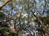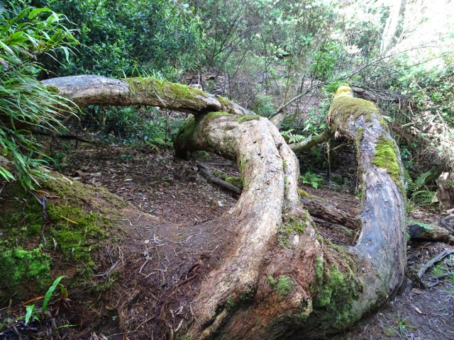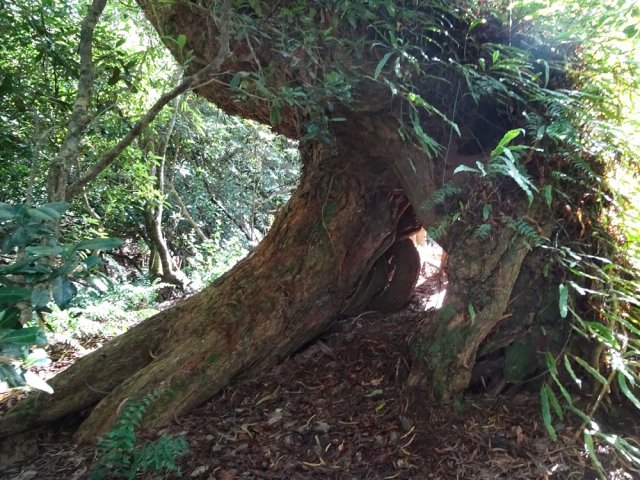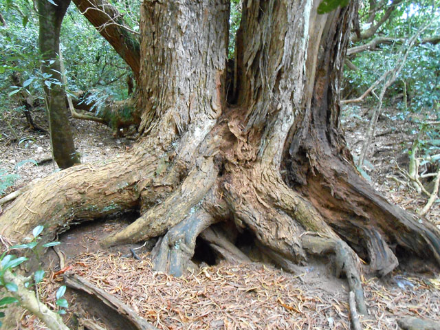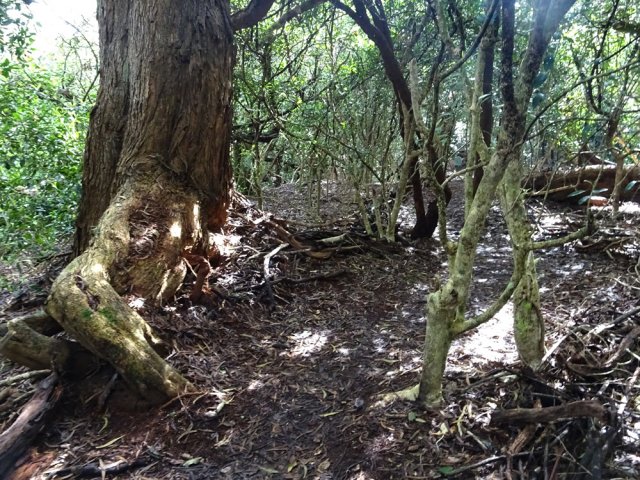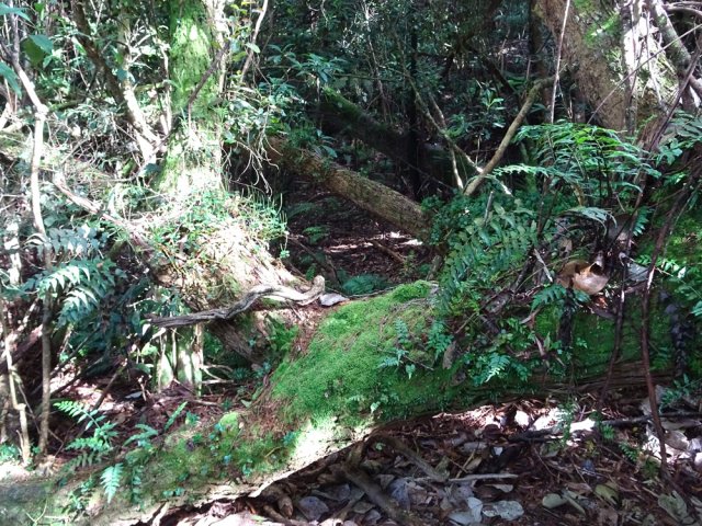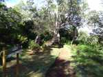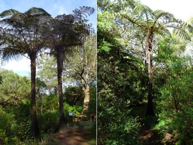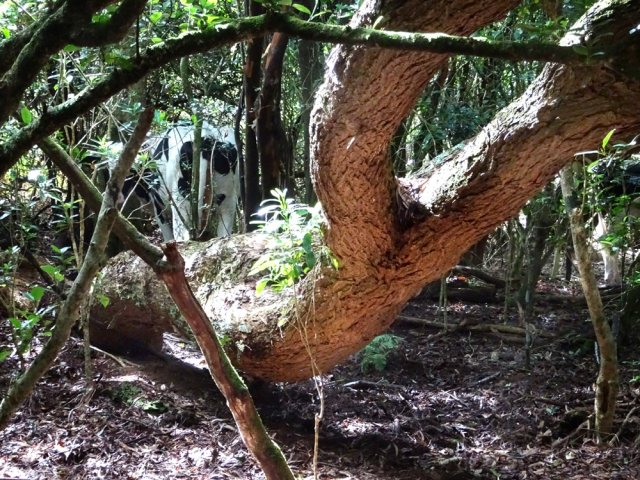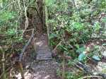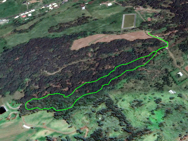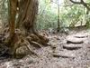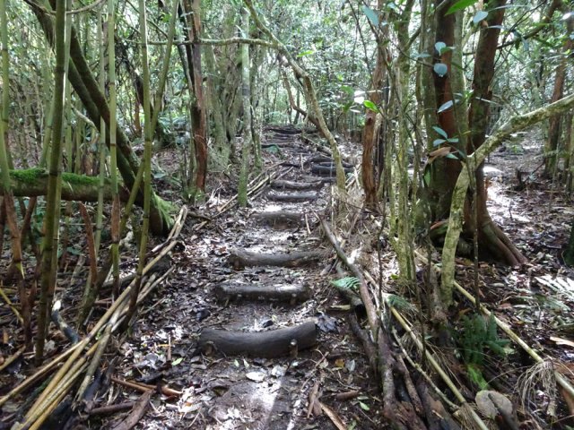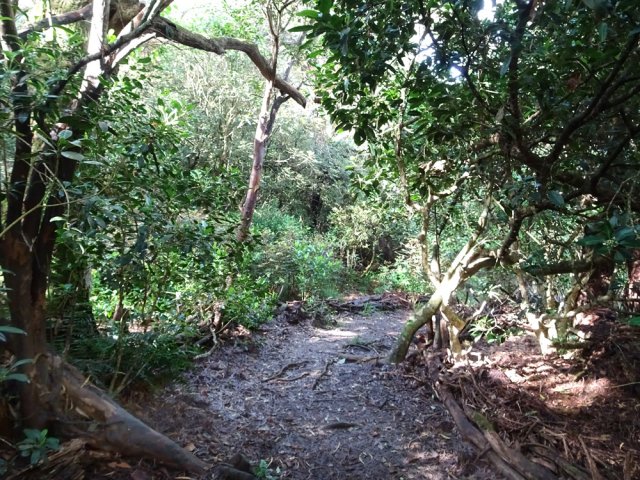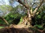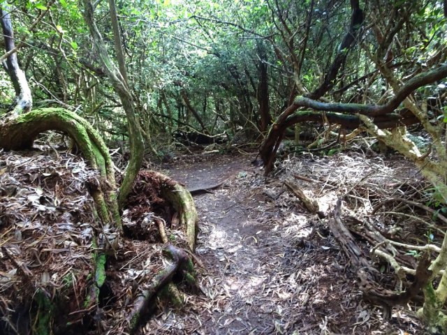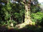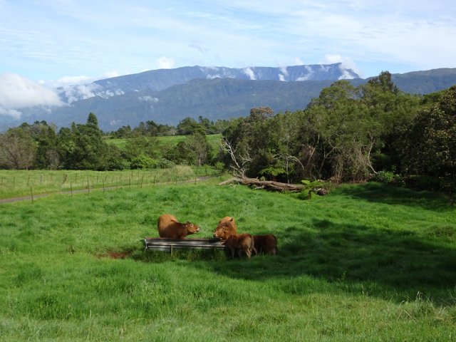 La randonnée débute sur l'un des parkings de la tamarinaie de la Ravine Blanche. Celui proche de la réserve d'eau permet déjà de beaux points de vue sur l'océan et les cirques (Photo 1). Suivre plein sud la petite route qui se termine rapidement en cul de sac, fermée par une barrière. Le sentier qui part à droite est commun sur une dizaine de mètres au circuit pédestre et au sentier botanique. Lire les indications sur le grand panneau situé en début de boucle (Photo 2). Il donne de très bonnes explications sur la différence entre plantes exotiques, indigènes ou endémiques ou sur leur classification. Rejoindre la pancarte indiquant sur la droite le départ du sentier botanique (Photo 3). Très vite, le premier panneau explicatif arrive près d'un tamarin des Hauts (Photo 4). Ils se multiplieront durant le trajet et permettront de différencier les essences rencontrées, dont certaines sont peu communes (Photo 5). Le sentier est beaucoup plus végétalisé que les autres parcours autour de la Ravine Blanches (Photo 6). Comme toujours en sous-bois, on marche sur des racines ou de la terre, plus rarement dans la boue (Photo 7). La descente est faible et comporte peu de difficultés. Il faut franchir parfois quelques ravines si petites qu'elles ne figurent même pas sur les cartes IGN (Photo 8). Leur lit rocheux au fond moussu suffit pourtant à les classer en ravines (Photo 9). Le sentier est le plus souvent tortueux, sans doute pour se rapprocher de certains spécimens remarquables (Photo 10). Les petits panneaux sont de plus en plus fréquents près de grosses touffes de fougères (Photo 11). On pense souvent qu'elles se ressemblent mais en y regardant de plus près, on distingue très bien les différences. De plus, elles diffèrent souvent en fonction de l'âge pour une même variété. Les fanjans (fougères arborescentes) sont très reconnaissables à leur hauteur qui peut être impressionnante dans certaines régions humides (Photo 12). Le sentier frôle à un moment un énorme tronc de Tamarin des Hauts entouré de verdure (Photo 13). C'est le plus intéressant du circuit ; il comporte même une cavité entre deux de ses troncs principaux (Photo 14). Après une longue descente, le sentier fait une épingle à cheveux vers la gauche pour remonter vers le point de départ. Ne pas hésiter à emprunter le petit sentier qui mène au Chemin Tamar'Haut situé à moins de 10 mètres. Depuis la route, on profite d'un superbe panorama verdoyant sur les prairies et massifs (Photo 15). Reprendre le sentier et entamer la remontée sous quelques tamarins (Photo 16). Ils se raréfient et l'on en rencontre de plus en plus couchés sur le sol (Photo 18). Le phénomène est connu. Si presque tous les arbres meurent une fois au sol, le tamarin a cette particularité de pouvoir vivre des décennies après la chute si une partie des racines subsiste. On en rencontre un peu partout. Certains sont là depuis si longtemps qu'on ne voit plus leur tronc recouvert d'épiphytes, de mousses et de fougères (Photo 19). La pente est par moments un peu forte sur marches en rondins (Photo 21). Les calumets morts ont été laissés là pour mieux délimiter le sentier pourtant très visible. On retrouve quelques tamarins âgés toujours debout (Photo 22). Une famille de tangues a élu domicile dans les racines de l'un d'entre eux (Photo 23). La fin du parcours s'annonce lorsque le sentier devient plus plat entre les branches couchées au sol (Photo 25). On longe depuis le bas une clôture grillagée qui garde le troupeau de bovins dans les prairies bordant le parcours. Quelques vaches restent à l'ombre des tamarins ou des broussailles de l'autre côté du grillage (Photo 27). L'arrivée au panneau s'effectue en légère descente passant sous un tamarin (Photo 28).