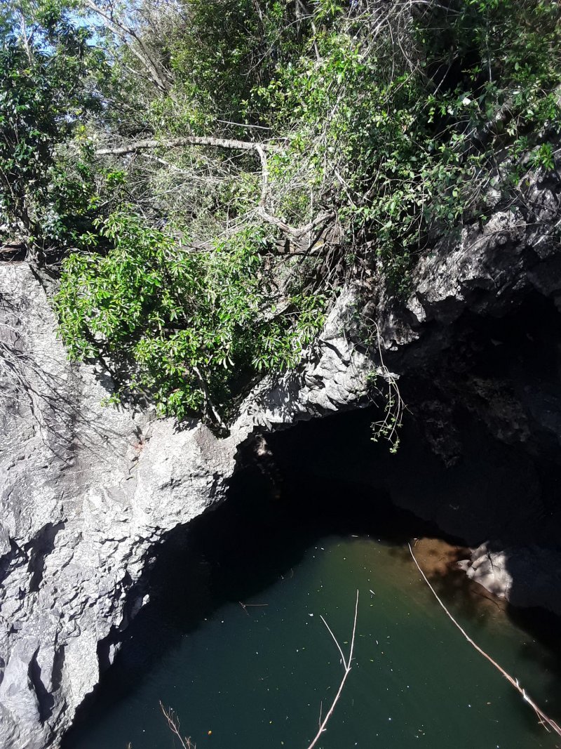 Nous devons cette remontée sportive à l'Association des Petits Tamponnais Ruraux. Le sentier, créé ou remis en état il y a quelques années était tombé dans l'oubli, aidé en cela par les cyclones, la frénésie de la vigne marronne et des fougères à s'approprier les lieux. Totalement remis en état début 2019, c'est le moment ou jamais d'y aller et surtout d'y revenir. Il remonte la rivière d'Abord, le plus souvent en rive gauche et comporte une cinquantaine de petites montées et descentes qui usent et peuvent fatiguer. Pour effectuer la boucle, un entraînement sérieux est nécessaire. Voir le texte vert ci-dessus pour y trouver d'autres idées de balades plus faciles. On peut ainsi suivre de plus ou moins près la rivière à sec ou utiliser le fond rocheux sur quelque centaines de mètres pour y admirer des arbres remarquables, des grottes, bassins et arches naturelles. Profiter, lorsqu'il y en a, des faux plats avant de grimper parfois violemment sur des marches, des racines et des roches souvent glissantes. Attention, les quelques bénévoles qui ont œuvré pour rétablir le sentier n'en ont pas fait un GRR. On y trouve des portions étroites, d'autres glissantes et si les balises venaient à disparaître, il pourrait même y avoir des hésitations pour trouver le sentier. Le GPS reste serein durant la montée et le téléchargement de celle proposée ici est l'assurance de ne pas s'égarer. Une fois n'est pas coutume, l'arrivée à la route est un réel soulagement. Les allergiques au goudron feront demi-tour par le même trajet pour reprendre à l'envers les montagnes russes, garantissant ainsi un excellent entraînement aux Grand Raid. Les autres se baladeront dans la campagne autour de la Petite Ferme pour descendre le Chemin Tamar Haut en direction du Tampon qu'on domine en larges panoramas tout au long de la route. Ce chemin est tellement agréable que l'on projettera certainement d'y revenir avec un vélo ou un pique-nique à consommer sur les tables de la Ravine Blanche.