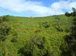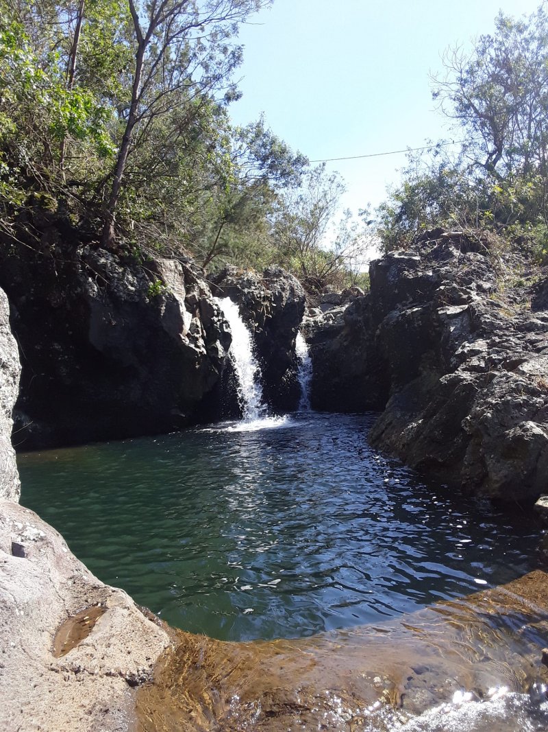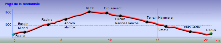 La randonnée débute au Chemin des Pétréas, un peu après la passerelle qui enjambe la rivière à sec et le fond rocheux. Contrairement à bien d'autres rivières, il faut être un sportif un peu "fou" pour la remonter, tant les bassins profonds, à sec ou remplis d'une eau noire ou croupie et les grottes en constituent le fond et les abords. En revanche, il est possible de s'approcher de toutes ces merveilles de la nature en longeant le sentier et en effectuant des écarts de quelques mètres à travers la végétation. La pente est faible, le sentier en très bon état (Photo 3), et on frôle les nombreux bassins de la région indiqués par de discrètes pancartes clouées aux arbres. On passe ainsi les bassins Pirogue, Samuel, Michel, Ti Feuilles ou Croisade et bien d'autres non baptisés (Photo 1). La montée du sentier familial s'achève au premier gué sur des galets ; les autres l'ayant été sur des plaques de basalte (Photo 4). Avant de poursuivre, profiter du bassin à gauche alimenté par une petite cascade et de l'énorme bassin en amont. Ce dernier résume à lui seul la difficulté de remonter la rivière par son lit. Franchir le gué sans chercher à marcher dans le lit et remonter un peu fortement pour trouver plus haut un champ de canne. Longer la piste sur une courte distance et retrouver le sentier qui repart en rive gauche puis éviter les gros galets qui jonchent le lit de la Rivière d'Abord que l'on suit sur près de 200 mètres. Le sentier repart en rive gauche et monte graduellement en sous bois pour surplomber la rivière d'une cinquantaine de mètres. Les jouvences et rochers bordent le sentier (Photo 7). On a parfois des trouées dans la végétation qui permettent d'apercevoir l'autre rive dont le rempart est couvert d'une forêt assez touffue (Photo 5). Plus loin, c'est la Grand Bénare qui domine le panorama sur Le Tampon (Photo 10). La descente est graduelle jusqu'à la ravine qu'on longe sur quelques mètres avant de repartir dans le même type de végétation ou le long de nouvelles barres rocheuses (Photo 11). On est à quelques mètres du cours d'eau que l'on rejoint près d'un cassé de cascade à sec. Traverser pour attaquer en rive droite une portion assez sportive dans les bois de couleurs, de courte durée car elle ne sert qu'à éviter la cascade et à la contourner. Nouvelles montées sur d'anciennes marches que l'on devine. Les poivriers et goyaviers envahissent les lieux. La montée est très raide par endroits et on apprécie les anciennes marches encore en place (Photo 14). Plus haut, on bénéficie de nouveaux panoramas sur les montagnes en marchant sur une crête couverte d'un peu de fougères et de bringeliers. Plus loin, le sentier oblique à nouveau vers la rivière que l'on rejoint par un sentier étroit et vertical où les arbustes s'avèrent utiles pour ralentir et éviter les chutes. Il n'y a pas d'autre passage que la ravine qu'on remonte longuement en suivant les tâches sur la roche. Attention par temps humide car certains galets sont glissants (Photo 12). Plus haut, on parvient à un bassin alimenté par des toboggans (à sec) et surmonté d'un gros bois de rempart. On approche du Bassin Sainte-Thérèse, situé en amont près du bois de rempart, fin de la montée proposée à partir de Bel Air (fiche en cours de refonte). Nouvelle montée très forte, nouvelle descente en s'accrochant aux branches et l'on revient en fond de ravine pour en effectuer une partie. C'est reparti plus haut pour les montagnes russes mais le sentier est moins pentu et longe la rivière à quelques mètres. Sur la gauche, on devine une grosse grotte qui est en réalité le bas d'une cascade. On la rejoint en 30 secondes et l'on peut voir la cavité qui contient un tronc d'arbre transporté par les crues donnant l'impression d'un tuteur qui empêcherait le plafond de tomber (Photo 13). Après de nouvelles dents de scie, barres rocheuses, marches parfois hautes, on descend encore dans la ravine, aidé par les troncs de goyaviers. On traverse pour marcher sur une courte distance en rive droite, remonter la ravine et gagner la rive gauche. Le sentier est bordé par endroits de vigne, de fougères, de beaux tans rouges et bois de rempart. On arrive à la ravine pour un nouvel épisode de sauts sur des galets tous plus gros les uns que les autres. Plus haut, c'est une zone totalement recouverte de fougères, vigne et bringeliers au milieu des acacias noirs qu'il faut traverser (Photo 20). Les volontaires de l'association ont créé un passage très large mais attention à la repousse rapide de ces pestes. On parvient bientôt à un semblant de mur et à un trou circulaire où siégeait l'alambic depuis des décennies avant de disparaître mystérieusement. L'endroit est le point de demi-tour proposé pour le circuit venant de la D36 pour les amateurs de beaux troncs. On termine les deux derniers kilomètres dans une végétation magnifique où les mousses, fougères, troncs centenaires vont se multiplier mais où les dents de scie ne disparaîtront pas. L'avantage ce sont les arrêts fréquents, non pour se reposer mais pour admirer ce que la nature peut nous fournir comme beautés respectables. On traversera de nouveau la rivière près d'une cascade à sec entourée de ses trois grottes (Photo 22) avant de poursuivre dans de magnifiques sous-bois moussus (Photo 23). La fin de la montée, après le dernier gué où le sentier n'est pas évident à deviner, se poursuit en rive droite sur un sentier très facile à suivre entre les arbres moussus (Photo 24). Il arrive à une barre rocheuse très proche de la rivière avant de se terminer à la RD36. Il aura fallu près de cinq heures à monter, descendre, marcher sur les galets de la rivière, éviter les ronces, escalader les marches dont certaines atteignent 60 cm pour atteindre cette route, fin de toutes les difficultés.