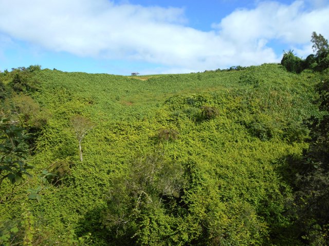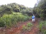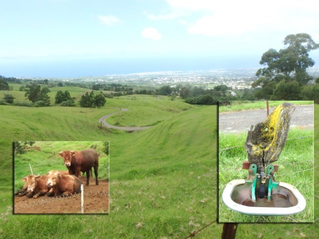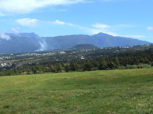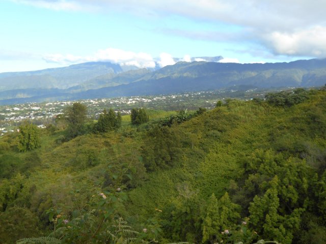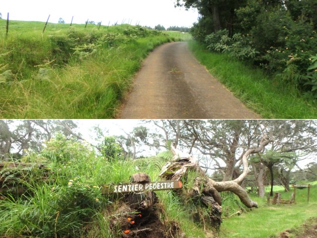 Rejoindre par la gauche la Petite Ferme puis encore à gauche la Ravine Blanche après une longue descente bordée d'acacias. Afin de ne pas rallonger la boucle et filer vers le terrain de sport de la Ravine Blanche, ne pas manquer après les stocks de bois coupés en bûches, le chemin goudronné du Père Favrot qui part sur la gauche. On arrive très vite au Piton de la Ravine Blanche puis au parking du domaine sportif du village. Prendre à droite le Chemin Tamar Haut qui débute par de jolis massifs plantés par l'association du même nom (Photo 26). Reprendre à droite à la grande réserve d'eau et ralentir le pas dans toute la descente car ce chemin pastoral est une pure merveille de calme et de verdure. La pente y est parfois un peu forte mais de nombreux lacets permettent de ne pas emballer le pas. Profiter des 180° de paysages tout au long de la descente (Photo 28). Vers la droite, le Dimitile ne cache pas le Grand Bénare ou le Piton des Neiges. A gauche c'est Le Tampon et ses milliers d'habitations qui constituent le paysage. Des prairies à perte de vue comportent quelques troupeaux de vaches limousines. C'est à regret que l'on arrive au croisement qui marque la fin du Chemin Tamar Haut. On peut à partir d'ici emprunter le trajet que l'on souhaite à condition d'avoir le sens de l'orientation car les rues sont nombreuses.