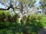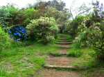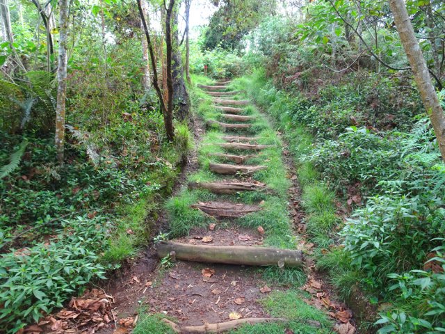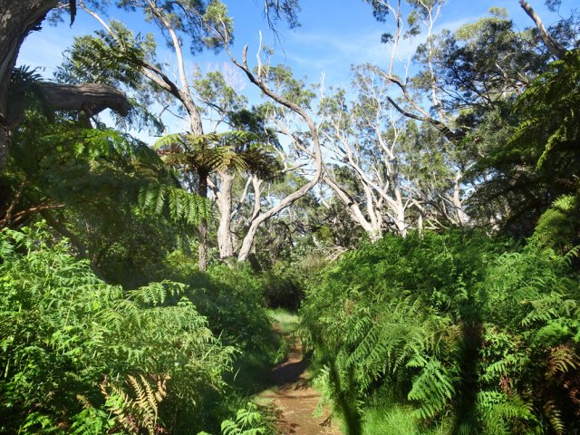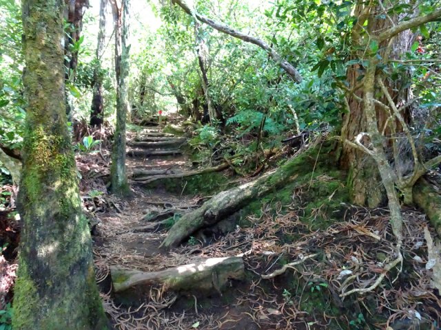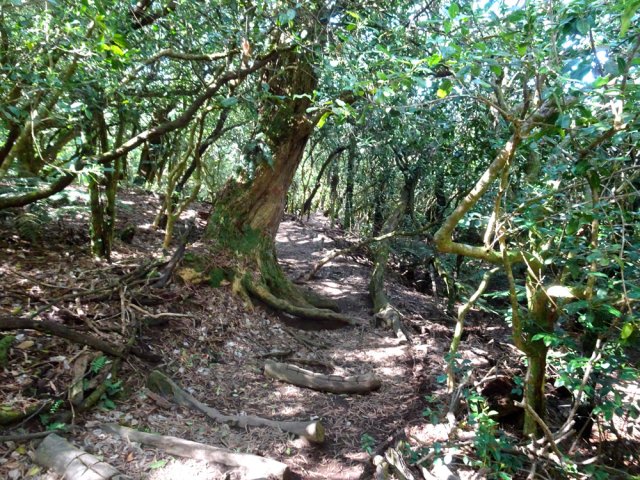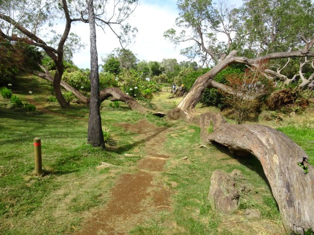 La randonnée débute au parking de la zone aménagée à la Forêt du Piton de la Ravine Blanche. Se diriger vers le grand panneau explicatif, qui donne le plan de quatre circuits. Des pancartes implantées un peu partout indiquent les points de départ, d'arrivée, de croisements. Il suffit donc de trouver le premier poteau rouge et de ne jamais quitter cette couleur jusqu'au retour. Des parties de la boucle sont communes et certains poteaux peuvent avoir trois couleurs. Privilégier le sens antihoraire pour la première boucle et le sens horaire pour la suivante. Quelques mètres après le départ, on a quelques points de vue sur l'océan et la réserve d'eau (Photo 1). La zone du point de départ abrite déjà de magnifiques tamarins des Hauts (Photo 2). Le sentier devient très vite tortueux. Il traverse des clairières, de belles plantations de tamarins et quelques zones où la végétation est moins domestiquée (Photo 3). Certains tamarins qui poussent dans les clairières sont pourvus de longues branches contrairement à ceux vivant dans les bois touffus (Photo 4). On en rencontrera plusieurs avec ces caractéristiques (Photo 5). Ils méritent tous une courte halte pour en faire le tour ou admirer leurs ramures. Le terrain monte régulièrement sur une pente faible. Les parties plus pentues comportent des escaliers qui facilitent la marche (Photo 7). Après maints virages et une pente régulière en direction de la lisière, le sentier oblique sur la gauche pour suivre de loin la clôture proche d'une étendue plantée d'eucalyptus (Photo 8). Les arbres sont nombreux et le sous-bois propre autour du large sentier qui les traverse (Photo 9). On longe les installations de la station photovoltaïque. Plus bas, les clairières sont plus nombreuses et surtout peuplées d'acacias noirs, mais on retrouve très vite les tamarins (Photo 10) et quelques portions bordées de plusieurs espèces de grandes fougères (Photo 11). La première boucle se termine assez rapidement. On retrouve le paysage du début avec de nouveau des grands tamarins (Photo 12). Descendre sur un autre petit parking et rejoindre la route. On peut longer au plus près la route, regagner le début de la deuxième boucle ou flâner autour du terrain de pétanque pour de belles vues sur les cirques, le village et sur la retenue d'eau (Photo 13). Un court détour rapproche d'une aire destinée à la production de charbon de bois (Photo 14). Plus loin, après avoir passé la ravine, c'est une aire de pique-nique aménagée pour personnes à mobilité réduite qui peut s'emprunter pour un court détour (Photo 15). Le sol bétonné et plat donne accès à un kiosque bien équipé offrant également les mêmes panoramas (Photo 16). Si l'on effectue un petit détour en direction des massifs de fleurs qu'on devine au loin, on passe près de nouvelles tables de pique-nique (Photo 17). L'écart prend fin après avoir longé un curieux tamarin allongé sur le sol et qui semble ne plus finir (Photo 18). Traverser la route et entamer une longue descente dans une forêt presque identique à la précédente mais plus touffue (Photo 19). Les tamarins sont toujours présents mais plus rares. On trouve aussi de beaux bois de couleurs et des touffes de calumets (Photo 20). On traverse sans difficulté une ravine au fond rocheux (Photo 21). Très vite, on parvient au Chemin Tamar'Haut qu'on traverse, avant de retrouver le sentier de l'autre côté (Photo 22). C'est reparti pour quelques zigzags dans les bois de couleurs sur terre humide ou racines (Photo 23). La remontée, toujours aussi facile, s'effectue sur un terrain humide mais peu glissant. Là aussi, les marches facilitent la marche sur les pentes les plus fortes (Photo 24). Le bruit des quelques voitures qui passent annonce la fin de la deuxième boucle. Le sentier, toujours propre, s'élargit sous de magnifiques tamarins (Photo 25). On frôle les prairies qui entourent le village de la Ravine Blanche. On a même de beaux panoramas sur les montagnes et le piton de la Ravine Blanche (Photo 26). Une fois sur la route, rien de plus facile que de la suivre en direction du parking de départ ou de repartir de l'autre côté pour une exploration de nouveaux sentiers. On peut ainsi remonter un long escalier dans les tamarins bordés d'ambavilles et de fleurs jaunes (Photo 27) ou s'approcher de ravines moussues, affluents du Bras Creux. La fin de la boucle est toujours aussi agréable dans les ambavilles ou hortensias (Photo 28). Après ces nouveaux sentiers, rejoindre le parking que l'on devine entre les arbres.