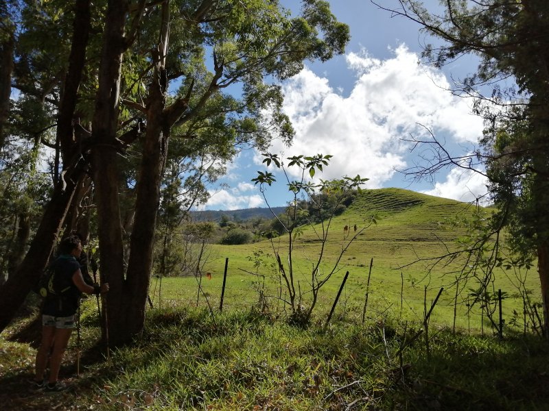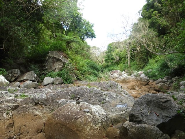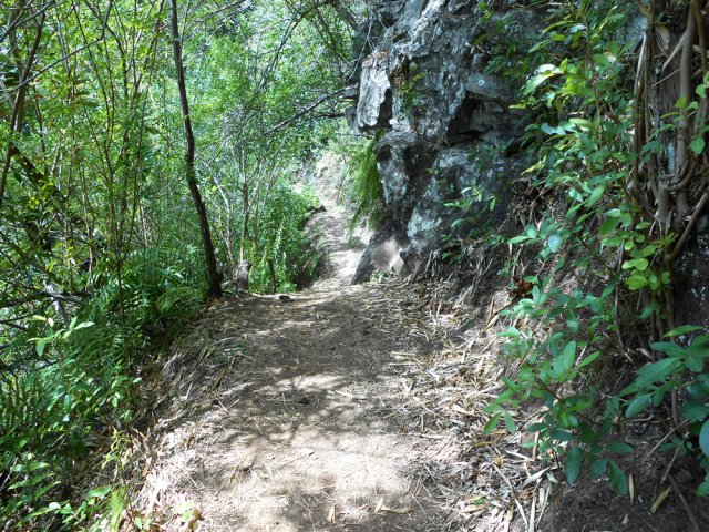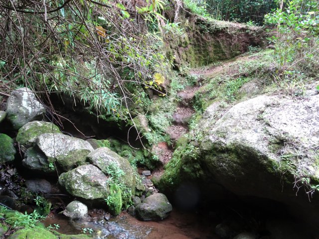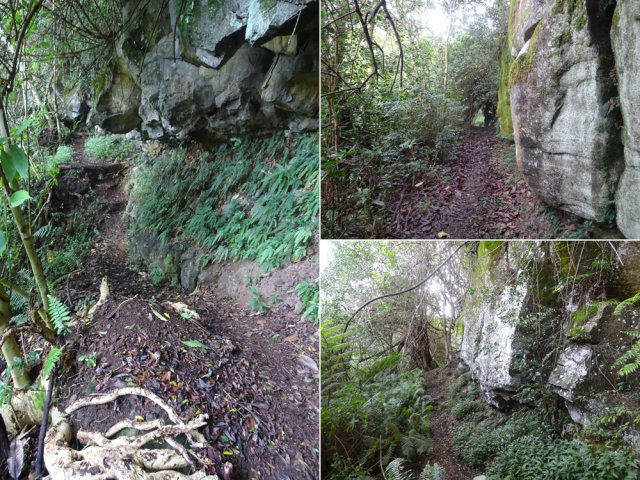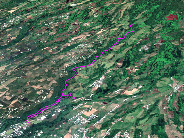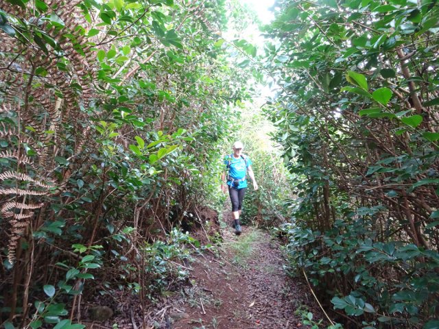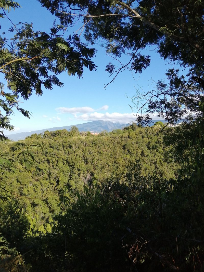 Si on connait bien le circuit de la Foulée de la Fraise à partir du Domaine Vidot, une partie de celui présenté ici est beaucoup moins fréquenté. Il longe la Ravine des Cafres presque jusqu'à sa source. En regardant la carte on remarque qu'entre l'Espace Vidot et le haut du circuit, il n'y a que 400 mètres de montée. Hélas, c'est sans compter sur la quinzaine de dents de scie qui parcourent le flanc de la falaise, doublant facilement le dénivelé (la dénivelée pour les puristes). On rencontre peu de panoramas tout au long du parcours et une bonne partie du cheminement s'effectue à l'ombre. On voit les bois de couleurs quand le regard porte sur le fond de la vallée mais c'est parce qu'ils dépassent des immensités recouvertes de goyaviers, bringeliers, galaberts ou vigne marronne. On remarque surtout de très hauts champacs (Magnolia chapaca) dont certains atteignent des tailles respectables. Le sentier est souvent de bonne qualité, bordé de rochers imposants, et semble régulièrement entretenu, surtout à l'époque de la course de la Fraise. Pour les randonneurs non arachnophobes, guetter sous chaque rocher rencontré, et il y en a beaucoup, les bibes rouges (Nephilingis borbonica) qui peuvent attendre des jours entiers l'insecte qui viendra faire vibrer les fibres de sa toile. Attention toutefois au venin nécrosant et aux toiles de ses concurrentes pouvant encombrer le sentier au petit matin !