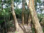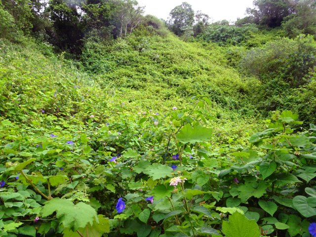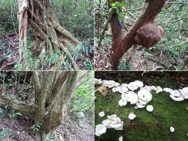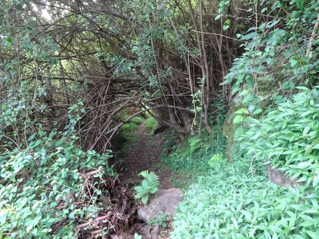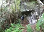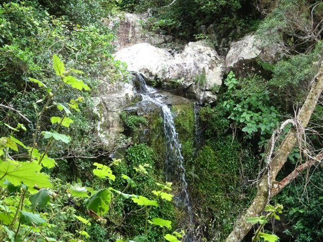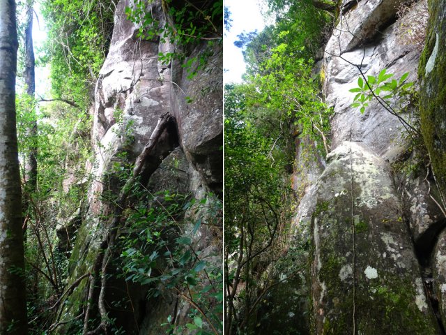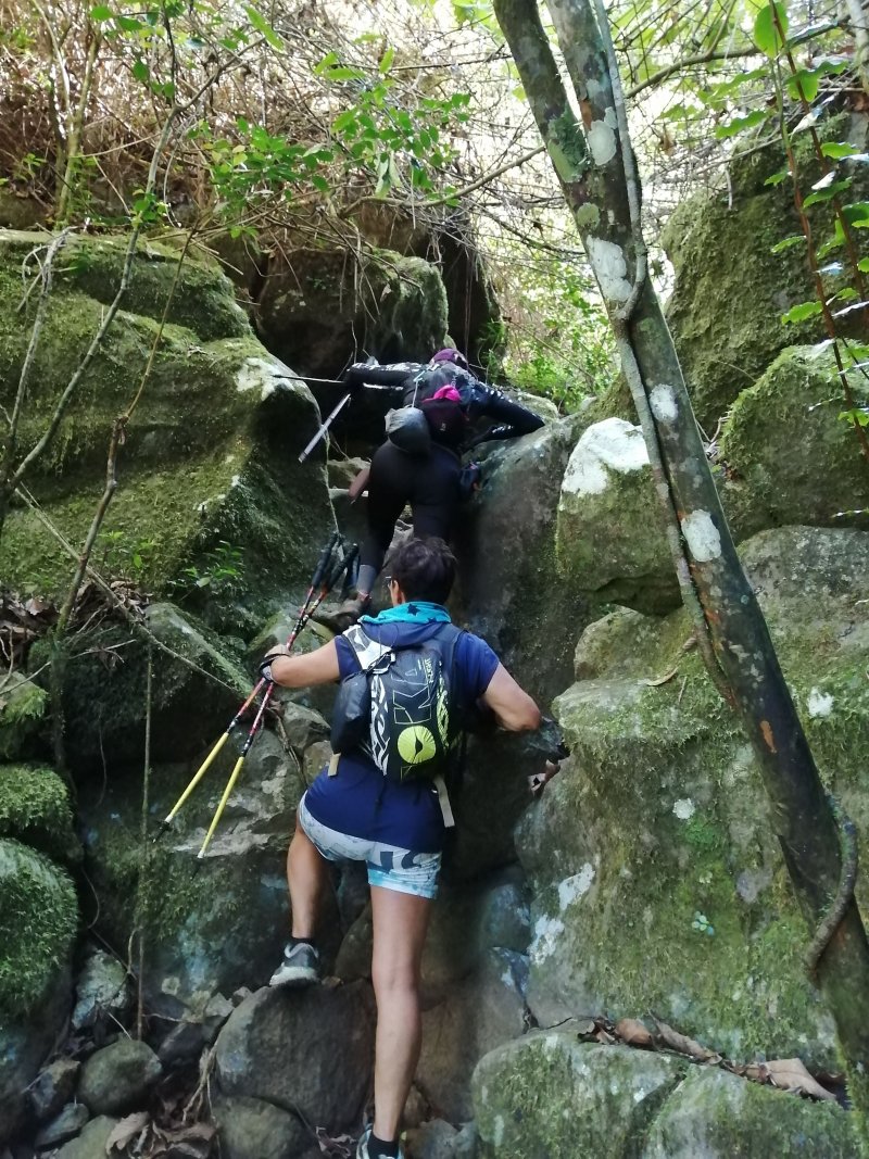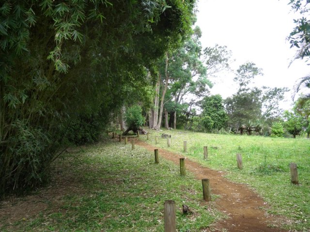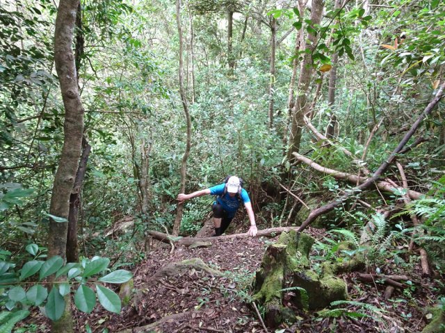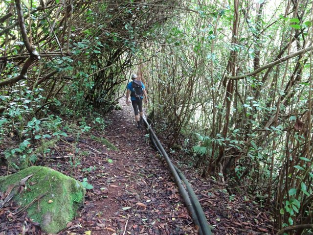 Si on connait bien le circuit de la Foulée de la Fraise à partir du Domaine Vidot, une partie de celui présenté ici est beaucoup moins fréquenté. Il longe la Ravine des Cafres presque jusqu'à sa source. En regardant la carte on remarque qu'entre l'Espace Vidot et le haut du circuit, il n'y a que 400 mètres de montée. Hélas, c'est sans compter sur la quinzaine de dents de scie qui parcourent le flanc de la falaise, doublant facilement le dénivelé (la dénivelée pour les puristes). On rencontre peu de panoramas tout au long du parcours et une bonne partie du cheminement s'effectue à l'ombre. On voit les bois de couleurs quand le regard porte sur le fond de la vallée mais c'est parce qu'ils dépassent des immensités recouvertes de goyaviers, bringeliers, galaberts ou vigne marronne. On remarque surtout de très hauts champacs (Magnolia chapaca) dont certains atteignent des tailles respectables. Le sentier est souvent de bonne qualité, bordé de rochers imposants, et semble régulièrement entretenu, surtout à l'époque de la course de la Fraise. Pour les randonneurs non arachnophobes, guetter sous chaque rocher rencontré, et il y en a beaucoup, les bibes rouges (Nephilingis borbonica) qui peuvent attendre des jours entiers l'insecte qui viendra faire vibrer les fibres de sa toile. Attention toutefois au venin nécrosant et aux toiles de ses concurrentes pouvant encombrer le sentier au petit matin !
