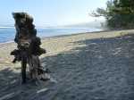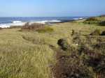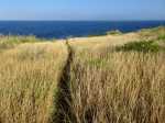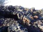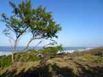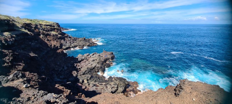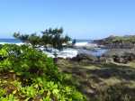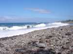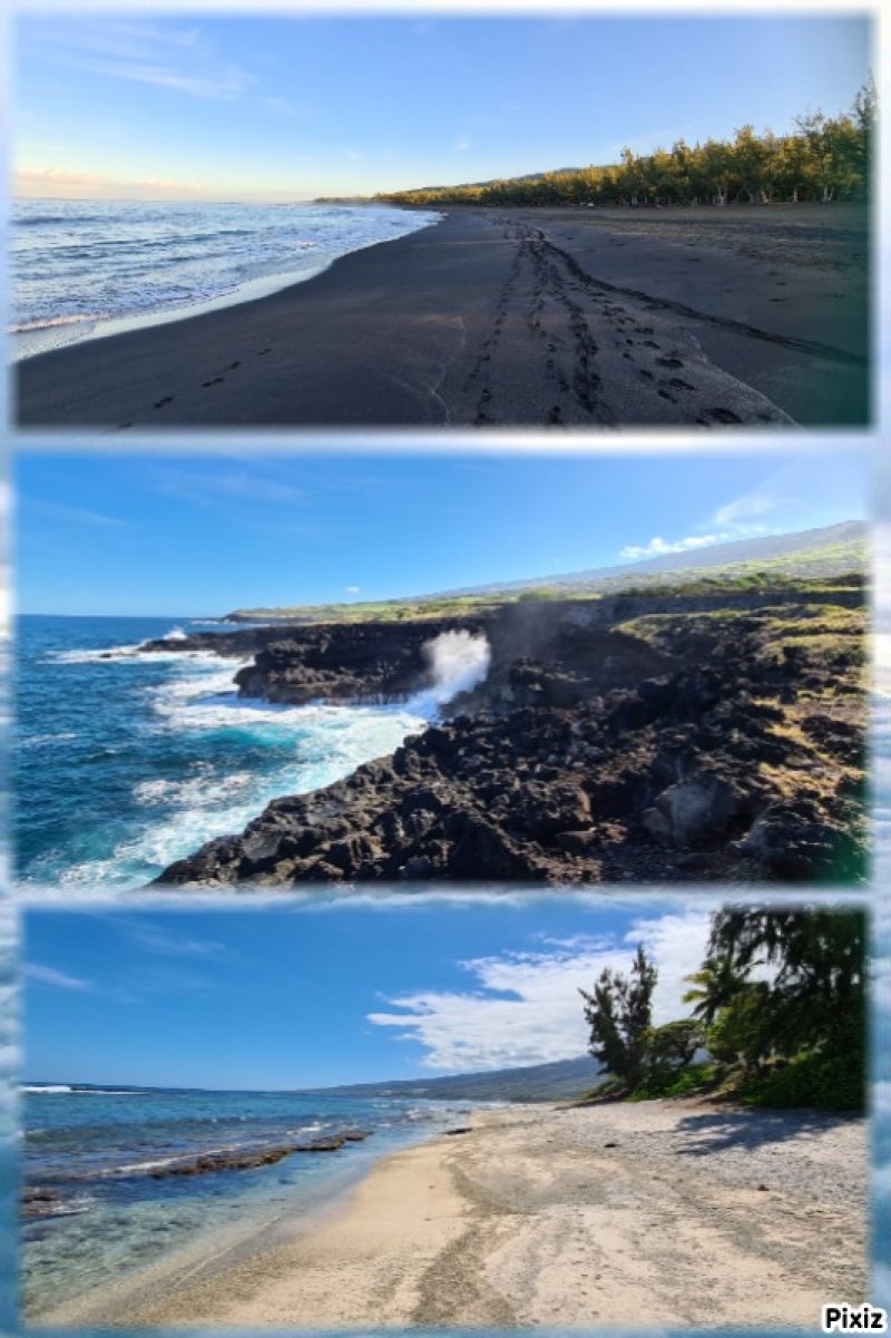 Voici une courte étape totalement plate afin d'avoir le temps de flâner et d'explorer toutes les merveilles que la nature offre à nos yeux. Choisir un jour avec un léger vent ainsi la mer instable permet de belles vagues qui s'écrasent sur les rochers de basalte et donnent plus de puissance à la demi-douzaine de souffleurs rencontrés tout au long du circuit. Aucun arbre pour se mettre à l'ombre si ce n'est quelques filaos, principalement au début et en fin de sortie. On foule du pied, tour à tour et dans le désordre, du sable noir très fin, des galets, des herbes, des basaltes de lave acérée, des champs de corail mort, d'autres de lianes de patates à Durand et souvent hélas, de nombreux détritus laissés par l'homme ou transportés par les vagues et les courants. Les embruns salés sont omniprésents et il faut faire attention à ne pas trop laisser les appareils photos à l'air libre. Le sentier est bien marqué parfois, plus difficile à deviner à d'autres moments mais il est impossible de s'égarer car l'espace entre mer et route nationale est étroit. Lorsque le sentier devient trop dangereux en bordure de falaise, il est préférable de se rendre sur la nationale et la longer sur quelques dizaines de mètres en prenant garde toutefois à la circulation, bien moins dense depuis la construction de la Route des Tamarins. Ce ne sera pas une aventure que de réaliser cette rando sans emprunter la route mais prudence tout de même aux passages étroits. Attention aussi aux chiens qui sortent de certaines cases modestes implantées en bord de plage et qui foncent sur tout ce qui bouge ; un bâton de marche rassure.