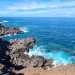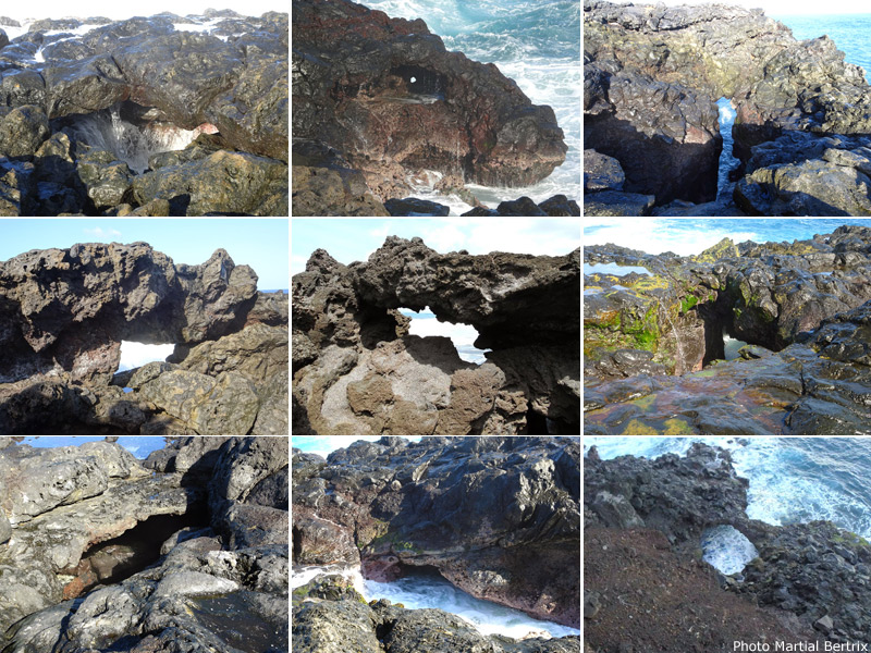 Plus difficiles à repérer que les souffleurs, les arches minérales parsèment le littoral entre l'Etang Salé et la Saline. Pour les trouver, il faut s'approcher du bord des falaises et parfois descendre vers la mer. C'est le plus souvent la lumière passant par l'ouverture qui permet de les découvrir. C'est aussi, comme ici, l'eau qui éclabousse à chaque vague. Il faut toujours être très prudent pour s'en approcher. Des croix, un peu partout, sont là pour rappeler que même les pêcheurs se font emporter par la vague qu'ils n'attendaient pas. De nombreuses autres arches sont réparties sur ce circuit au nord de Saint-Leu.