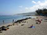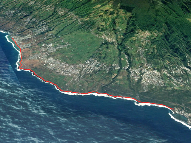 La randonnée débute au village de l'Etang Salé où de nombreux parkings sont disponibles mais peut commencer au petit rond point situé à la fin de la route qui longe la plage. De l'Etang Salé à Saint-Leu, il n'y a pas à réfléchir pour éviter de se perdre car c'est impossible. Plus des deux tiers s'effectuent sur le sentier du littoral entre les vagues et la route. Le reste est partagé entre des portions de galets, de sable ou de goudron si le passage est devenu trop délicat ou si le sentier est rendu invisible par l'excès de végétation. On débute à la plus longue plage de La Réunion (Photo 1). Le matin, elle est déserte hormis quelques marcheurs ou joggers qui viennent effectuer l'aller-retour sur le sable humide. Lorsque le soleil chauffera ce sable gris, les baigneurs envahiront le sud de la plage, le seul endroit où il est possible de se baigner grâce à une petite barrière corallienne. Trois possibilités pour longer cette plage : marcher sur le sable lui-même (Photo 2), sur la petite route se terminant plus loin par un rond-point ou sous les filaos entre les deux (Photo 3). C'est la meilleure solution car on évite le sable dans les chaussures et la circulation de la nationale après le rond-point. Un semblant de sentier emprunte le haut du talus. A la fin du talus, on est obligé de marcher un peu sur le sable. Le soleil du matin fait ressortir la couleur jaune de l'olivine (Photo 4). On traverse la Ravine du Ruisseau puis on longe une nouvelle plage de gros galets instables avant d'arriver à la Ravine des Avirons. Marcher sur les cailloux n'a rien d'agréable ou de sécurisant (Photo 5) et la meilleure solution consiste à trouver des petites sentes de pêcheurs pour éviter de marcher sur la route. On trouvera partout ce ces étroits sentiers bordés d'herbes sèches (Photo 6). Si l'on dispose de temps, il est parfois intéressant de suivre d'autres traces en direction de la mer. Les pêcheurs les ont créées et l'on découvre ainsi de nombreux souffleurs, grottes et arches battues par les hautes vagues. Jusqu'à la route de Bois de Nèfles Piton, la côte alterne plages de galets et de sable et les basaltes sont plus rares. La dernière plage avant la ravine des Sables est un petit coin ravissant, entouré de roches mais interdit à la baignade (Photo 7). Quelques filaos sur le bord de mer souffrent des vents dominants et des embruns salés (Photo 8). Près de l'arrêt de bus de la ravine des Sables, une autre plage, bordée de grosses roches basaltiques déchiquetées abrite un temple usé par les vagues (Photo 9). En prenant son temps ou en cherchant dans les roches, on trouve ça et là des grottes qui attirent des fidèles venant y déposer des offrandes, le plus souvent sous forme de plateaux de fruits (Photo 11). Attention car certaines cavités sont profondes. En face du hameau de la Veuve, on dénombre plusieurs arches et tunnels où la mer se précipite, créant d'immenses geysers ou écoulements (Photo 12). Quand les roches et laves diminuent, on marche toujours dans les herbes d'une sorte de savane où ne dépassent que quelques arbres et des croix en souvenir des pêcheurs morts sur les falaises ou en mer (Photo 13). Ne pas manquer, en marchant sur les laves parfois glissantes ou acérées, une descente au gouffre sans fond donnant sur la mer par une haute arche minérale. C'est sans doute ce lieu impressionnant qui lui a valu son nom d'Eglise, où seuls les requins peuvent se rendre à l'office (Photo 14). Tout près, les pêcheurs semblent peu impressionnés par les hautes vagues qui en surgissent en rugissant (Photo 15). Très proche de la route, ces falaises déchiquetées attirent les photographes qui viennent immortaliser la vague la plus haute (Photo 16). Avant cette falaise, il est plus prudent d'emprunter la route sur une cinquantaine de mètres afin d'éviter la chute. On retrouve très vite le sentier qui court en haut de la falaise et permet d'admirer grottes, petits souffleurs bruyants ou formes animales créées par la lave érodée (Photo 19). Poursuivre jusqu'au souffleur le plus connu de La Réunion en raison du parking tout proche (Photo 17). Il est encore possible de poursuivre par le haut de la falaise en direction de la Pointe au Sel mais certaines portions sont dangereuses, surtout avec des enfants. Il faut alors sauter la murette, emprunter la route en guettant le sentier qui repart dans les herbes vers la falaise aussitôt l'écueil franchi. On arrive en vue de la Pointe au Sel reconnaissable à ses bâtiments proches des salines. Là encore, des souffleurs s'aperçoivent de très loin, dont un plus gros que les autres qui offre de magnifiques arcs-en-ciel (Photo 20). Attention en marchant sur le haut de la falaise, les effondrements en disent long sur les chutes possibles. Remarquer, en descendant vers le musée, les tuyaux destinés à recueillir l'eau de mer mise ensuite à évaporer pour récupérer le sel (Photo 21). La grande saline n'est plus exploitée qu'à titre folklorique et seuls quelques bassins permettent d'étudier le principe de récolte du sel (Photo 22). S'il est ouvert, la visite du musée est rapide et la randonnée presque terminée. Là encore, on peut s'approcher prudemment du bord de mer pour voir quelques souffleurs et de très beaux bassins (Photo 23). A partir de la Pointe au Sel, le sable gris est remplacé par du sable blanc et l'on devine au loin la ville de Saint-Leu (Photo 24). Des sentiers sont toujours présents et se devinent facilement. On frôle des "beach rocks", une curiosité géologique en fin de plage (voir icône rouge sur carte et photo 25). En face, le cimetière fleuri de Saint-Leu mérite quelques minutes de détour (Photo 26). A partir du cimetière, on traverse une succession de plages bordées de filaos, calmes vers le Chemin Canal (Photo27) ou plus fréquentées vers la ville (Photo 25). La fin du parcours s'effectue au port d'où il est facile de partir vers le cent