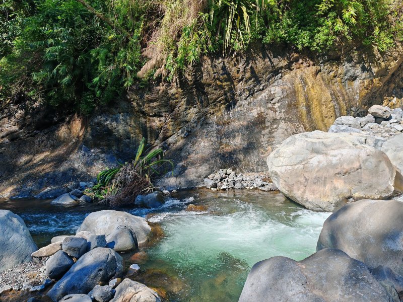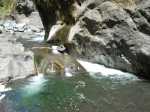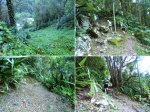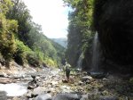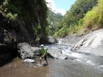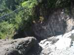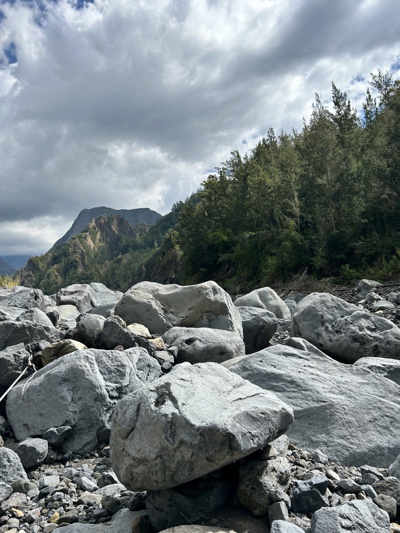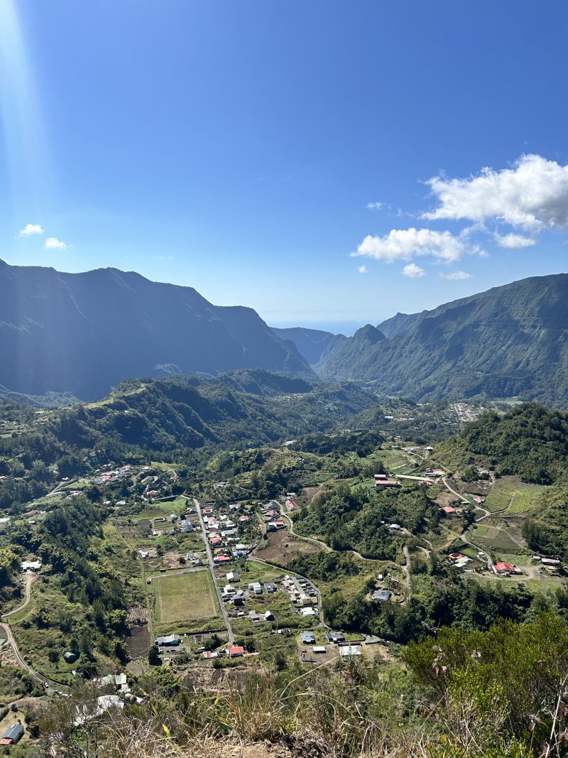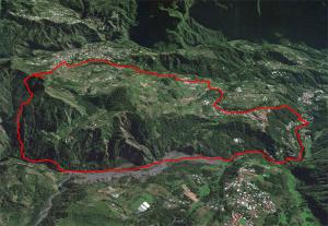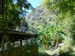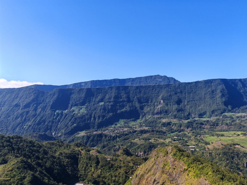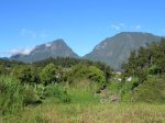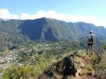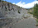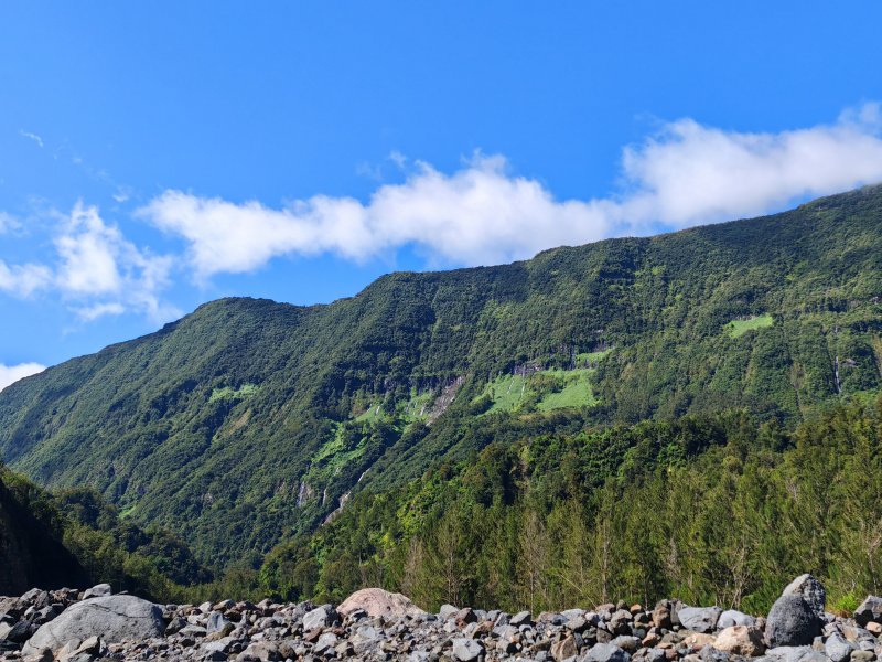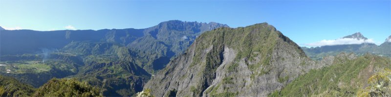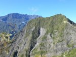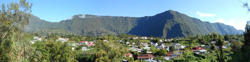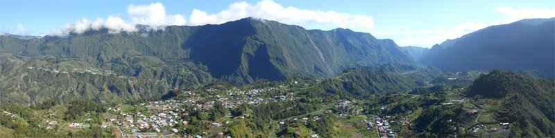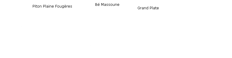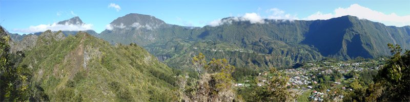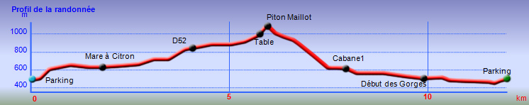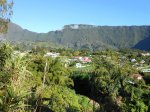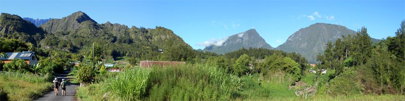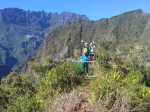 La randonnée débute près de la petite route qui permet de trouver le sentier menant à l'Îlet Bananiers en passant la passerelle au-dessus de la Rivière du Mât, près de l'arrêt de bus Château d'eau. En face, un sentier en forte pente mais en très bon état rejoint par un bon effort le premier lacet de la route de Grand Îlet (Photo 1). Un tronçon de route, inévitable, permet de flâner dans le village de la Mare à Citrons à la recherche de jardins fleuris ou cases typiques. Bifurquer à droite à la première rue pour rejoindre la Mare à Citrons. Cette mare d'eau sombre, entourée de barbelés et de bambous mériterait d'être un peu mise en valeur. Elle a donné son nom au village mais ne doit guère y attirer de touristes. Après avoir passé les bambous et atteint une magnifique propriété sur la droite, prendre le Chemin des Epices vers la droite. On traverse quelques cultures (Photo 3) et on trouve très vite un premier poteau en bois qui sert de balise au trail numéro 3. Suivre cet itinéraire qui passe toujours dans les cultures, emprunte routes, pistes ou sentiers pour se finir à la D52, un peu avant la Ravine Grosse Roche. Un sentier part sur la gauche et rejoint une nouvelle route au village du Plateau. Un lotissement récemment construit sert de repère pour poursuivre en direction du Piton Maillot qu'on aperçoit depuis quelques temps. Contourner ces maisons colorées par le chemin de gauche. En haut du lotissement, une grosse touffe de bambous abrite le début du sentier en direction du Piton Maillot. Le sol caillouteux comporte quelques pierres et racines (Photo 7) mais on atteint très vite une petite clairière où trônait une table de pique-nique désormais démontée, près d'un croisement. Prendre à gauche sur la montée courte et un peu raide vers le sommet du Piton Maillot. De là, on peut admirer un panorama de 360° sur tout le cirque de Salazie (Photo 8). Le Piton, d'Anchain, tout près n'est pas encore impressionnant (Photo 9). Il le deviendra lors de la descente où on frôlera ses pans abrupts. Après avoir deviné le nom de tous les îlets ou villages à nos pieds, entamer la descente qui peut également s'effectuer sur un petit sentier parallèle au premier. A la clairière, obliquer sur la gauche et entamer la longue descente dans les branles verts, goyaviers et bois de couleurs entourés de fougères (Photo 11). Certaines parties ombragées, humides et pentues peuvent être glissantes. On longe dans la descente une courte portion de ravine verdie par les mousses et du plus bel effet (Photo 12). Plus loin ce sont d'anciennes parties sans doute habitées au siècle précédent où poussent toutes sortes de fruitiers. Le terrain s'assagit fortement à l'approche de la Rivière du Mât qu'on aperçoit à quelques mètres en-dessous mais surtout qu'on entend très bien. On arrive pour une halte ombragée à une clairière avec barbecue près de laquelle coule une source pétrifiante (Photo 14). L'eau a été dirigée par quelques "tuyaux" en bambou. Il est facile de remplir les réserves d'eau avant de repartir en direction d'un deuxième emplacement un peu plus bas. On croise le sentier qui remonte vers la civilisation de Bras Sec. Poursuivre à droite et retrouver un abri en tôle dans ce qui pourrait être un superbe camp de repos, idéal pour aller passer deux jours au calme, bercé par le bruit de l'eau. Les infrastructures ont beaucoup souffert et seul un WC rose trône au milieu de la clairière. Descendre le petit sentier et entreprendre une longue descente de la Rivière du Mât. Le sentier, très bien marqué (Photo 16) permet une agréable balade malgré le soleil écrasant. En rive droite, une colline de cendres, déchiquetée, s'use de manière inexorable, donnant au lieu un caractère sauvage (Photo 15). Plus on descend et plus les galets prennent le relais du sable (Photo 17). On marche toujours en rive gauche sans jamais traverser la rivière. Un champ de chouchous sur la droite marque la fin de la large vallée et permet d'apercevoir la route quand les véhicules passent. En cas de grosses pluies ou de fortes eaux, ce champ de chouchous servira d'échappatoire afin de revenir au point de départ par la route (Un sentier très escarpé sur la gauche rejoint en deux coups de rein la route - Possibilité de passer à droite du champ de chouchou, sur la partie en éboulis mais gare aux fourmis ! dixit Laétitia. Une fois sur la route partir à gauche). Mais 11 mois sur 12, le niveau de l'eau est suffisant pour poursuivre vers l'aval et terminer cette boucle de manière ludique et aquatique. La vallée se transforme en large canyon mais l'eau garde son débit habituel (Photo 22). Plus on descend et plus le spectacle est agréable. On passe sous le pont de la D48 et on s'approche doucement de la fin de la Ravine des Demoiselles qui se termine par une magnifique cascade (Photo 18). La cascade suivante est moins impressionnante mais très haute (Photo 20). Le clou de la randonnée arrive quelques minutes plus tard par les ultimes chutes des rivières tombant des falaises environnantes et se jetant dans la Rivière du Mât après avoir traversé les cressonnières situées plus haut. L'eau dévale les pentes verticales en fins voiles ayant donné le nom au lieu (Photo 21). Il faut parfois choisir entre la rivière un peu profonde et la pluie tombant des rochers. La fin est assez facile malgré la recherche incessante du meilleur passage dans le courant. La passerelle (Photo 27) sert de repère pour remonter en direction de Salazie par un agréable sentier caillouteux qui rejoint en quelques minutes la route.