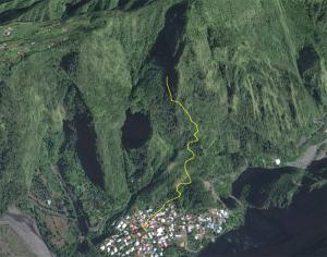 La randonnée débute au superbe village du Petit Serré, traversé lors des jonctions vers Cilaos. Quand on le traverse on pense à quelques maisons mais quand on est sur le rein qui le domine, on remarque que c'est un gros village qui possède commerces, école et grande chapelle. Un coup d'œil sur le rempart en direction de la touffe de bambous de l'Îlet Bleu peut donner l'impression qu'on y sera dans moins d'une heure. C'était le cas à l'époque où il était habité. Il en est tout autrement de nos jours. En face du parking commence le Chemin de la Place qui se termine à d'importantes touffes de bananiers ayant empiété sur l'ancien sentier. Il faut donc dénicher entre les troncs la trace qui devient immédiatement très facile à suivre même si on s'éloigne des standards d'un GRR (Photo 2). S'il était de cette qualité il y a 50 ans il était effectivement facile de rendre visite à Mémé sans trop d'efforts car ce sentier comportait une vingtaine de lacets pour grimper la falaise. Au dernier champ, on comprend vite qu'il y a longtemps qu'on ne monte plus à l'Îlet Bleu pour y cueillir mangues ou bananes. On voit depuis le village la grosse touffe de bambous qui pousse au bord mais pas les fruitiers qui sont recouverts de pestes végétales. On poursuit presque à plat dans une jungle de jouvences, de fougères et des premiers galaberts (Photo 3). Après les derniers bananiers qui deviennent sauvages par abandon, on entame la montée en cherchant des yeux le sentier (Photo 4). La montée se fait donc plus à l'instinct qu'en suivant réellement le sentier. On le rencontre de temps en temps pour le suivre sur des distances plus ou moins courtes (et non plus ou moins longues !). Il longe de manière très nette les barres rocheuses plus à l'abri de l'invasion des plantes même si tous les lieux conviennent au choca (Photo 5). Quand il disparaît dans la végétation, on reprend la montée à quatre pattes en essayant le plus possible de ne pas s'éloigner de la trace originelle (Photo 7). La comparaison des traits de la vieille carte et celle du GPS montre que c'est impossible. Il faut pourtant trouver des avantages à de telles sorties. Les panoramas sur Saint-Pierre, sur les lacets entourant le village (Photo 8), sur le Gros Morne et la Vallée du Bras de Cilaos (Photo 9) ou vers les autres îlets sur le rempart en face (Photo 10) permettent des haltes à condition de trouver un coin plat pour poser le pied. Quand on connaît tous ces îlets perdus baptisés du nom du propriétaire de l'époque, il est amusant de constater qu'on cherche à rejoindre l'Îlet Bleu en ayant en face de soi l'Îlet Rouge. Plus haut, même les portions le long des rochers ont été envahies par les bois noirs des bas ou les zépinards (Acacia farnesiana - Photo 13). Comme le long de tous les sentiers reliant un ancien îlet, on y trouve des manguiers (Photo 15). Les mangues à peine mûres donnent même l'occasion de grignoter et d'effectuer une halte pour reposer bras et jambes (Photo 16). C'est d'ailleurs au premier manguier qu'il faut retrouver le sentier qui file au sud au lieu de longer la falaise comme nous l'avons fait. Les chocas colonisés par d'énormes fourmilières a vite fait de saper le moral des participants et de contraindre à la descente sans avoir rejoint la touffe de bambous (Photo 19). Le retour s'effectue par le même trajet en prenant garde cette fois à la descente et aux cailloux tombés d'un précédent éboulis (Photo 21).