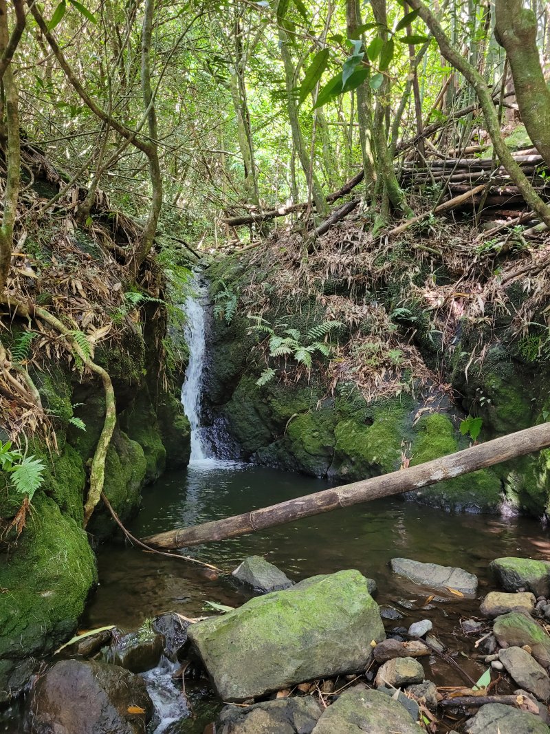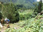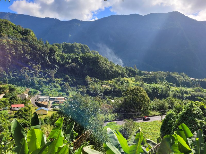 Quand on regarde la carte de Salazie, on remarque un sentier qui remonte au-dessus de Camp Lilas. On voit des petits rectangles indiquant des cases. On ignore si elles sont habitées et si la zone est privée mais on est tenté par les paysages alentour. Un des propriétaires de champs situés contre la falaise, croisé dans la montée, confirme que le sentier est accessible à tous, donne le nom des propriétaires et parle même d'Alain, un ermite vivant là-haut au milieu de sa basse-cour. L'Îlet de l'Eperon, 200 mètres au-dessus de la route, peut faire penser, avec la carte, qu'on est en ville mais confirme bien, après 30 minutes de montée, que l'endroit est très isolé. Les panoramas sur la vallée de la Rivière du Mât sont très agréables. Alain, l'ermite quinquagénaire, petit fils d'un habitant des lieux a pris le relais et élève ses quelques poules et canards dans l'isolement le plus complet. Rencontré sur les lieux, l'homme s'avère d'une extrême gentillesse. Ouvert à la discussion il nous conseille même de poursuivre sur un sentier lontan qui permettait à l'époque de rejoindre l'Îlet Bananiers en quelques minutes. Désormais envahi par les fougères, grandes herbes et goyaviers, il nécessiterait un bon nettoyage pour rendre cette boucle idéale pour des balades autour de Salazie.