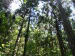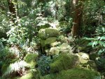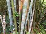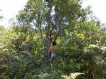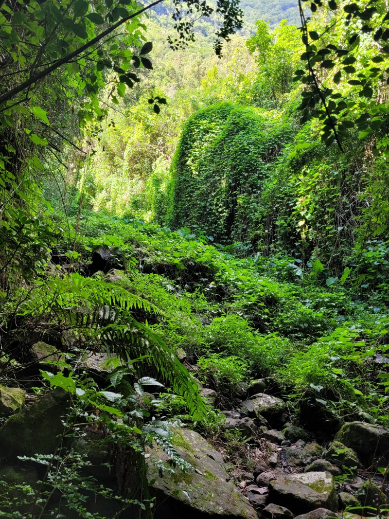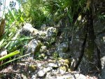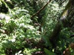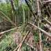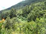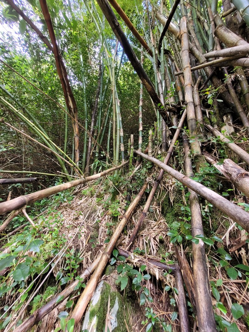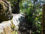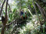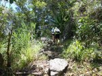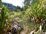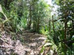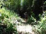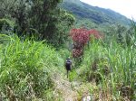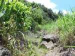 Ceux qui comme nous ont eu la chance de rencontrer Alain, la balade familiale en aller-retour s'est terminée en boucle sportive. Reprendre le sentier de gauche et retrouver les cannes à sucre. Suivre le discret sentier bordé de bois de rempart et change-écorce, recouvert d'herbes, de fougères et de "zerb vache" qui attachent si bien aux jambes (Photo 19). Zigzaguer dans les goyaviers pour franchir la zone envahie de hautes herbes coupantes. Certaines portions de sentier sont en très bon état (Photo 21), d'autres doivent se deviner, ce qui exclue obligatoirement les promeneurs du dimanche. Des vestiges de barrière de goyaviers bordent encore le sentier parfois en forte pente (Photo 22). Après quelques montées et descentes parfois très pentues, on traverse la Ravine Pavée en marchant sur les hautes herbes et taros. Le passage est délicat et il faut même se baisser sur l'autre rive pour passer sous les bambous ayant souffert de gros coups de vent. On parvient à une forêt de cryptomerias envahie de fougères et de goyaviers (Photo 23). Le sentier est toujours visible le plus souvent mais il faut parfois le chercher des yeux. Des murettes, destinées à garder les cochons à l'époque, sont écroulées et verdies par les mousses (Photo 25). Commence alors une longue descente dans les bois de couleurs, fougères et cryptomerias. Il faut parfois s'asseoir pour franchir de hauts obstacles (Photo 26) avant de rejoindre la petite route bétonnée menant à l'Îlet Bananiers. Prendre à droite et longer cette route en lacets sur près de deux kilomètres pour retrouver la route de Salazie. Le véhicule est sur la droite à quelques dizaines de mètres.