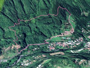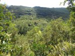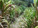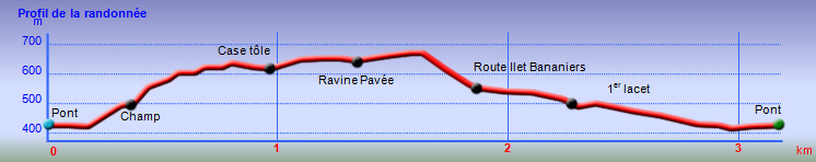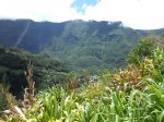 La randonnée débute à ras la route de Salazie, une centaine de mètres après la route de Bois de Pomme (Voir § ci-dessous pour les détails). Le plus difficile est de trouver une place de parking. La route de Bois de Pomme, en cas d'utilisation de l'emplacement décrit plus bas, fait également très bien l'affaire. On traverse tout d'abord des champs bien entretenus sur un sentier en pente (Photo 1). Le sentier est visible malgré de longues tiges de chouchous ou de courgettes qu'on évite absolument de piétiner. Très vite, la vue est agréable sur la vallée de la Rivière du Mât (Photo 2). A la fin des cultures, il grimpe assez fortement sur un sol très caillouteux (Photo 3). La pente est constante et les cailloux surchauffés par le soleil (Photo 4). On s'approche d'une barre rocheuse empruntée par le sentier protégé du vide par une rambarde sommaire (Photo 5). D'autres endroit sont également protégés même si le vide est caché par la végétation (Photo 6). Chocas, fougères et hautes cannes fourragères constituent l'essentiel de la végétation (Photo 7). Mais ce sont surtout les cannes aux feuilles larges qui sont les plus nombreuses (Photo 8). Après cette montée dans les bois, on se retrouve sur le plateau à imaginer la vie des gens de l'époque contemplant Salazie, si proche et si éloignée en même temps (Photo 10). Sur ce plateau, la marche est facile et le sentier bien marqué (Photo 11). Ces ont surtout les hautes herbes qui constituent l'essentiel de la végétation (Photo 13 et 14). Elles ont petit à petit remplacé les cultures suivies par les arbres et les broussailles. Il faudrait désormais une génération pour remettre en état cette zone cultivée à l'époque, ou faire monter un bulldozer ! Après avoir traversé une petite ravine à sec, on s'approche d'une case en tôle encore en très bon état à l'ombre de grands fruitiers ou des bananiers qui la bordent (Photo 16). Ce sont les seuls vestiges de l'époque et il faut hélas s'attendre à les voir disparaître avec le temps. De loin en loin, quelques pieds de maïs montrent que les poules sont granivores et qu'il faut bien songer à les nourrir. Quelques embranchements mènent à des cases en moins bon état, des champs presque abandonnés ou des bois de goyaviers. Le dernier embranchent amène à gauche à des vestiges de canne à sucre et à droite à un tuyau d'arrosage coulant en permanence et marquant la propriété privée d'Alain, qu'il faut absolument respecter. La balade prend fin ici et le retour s'effectue par le même sentier.