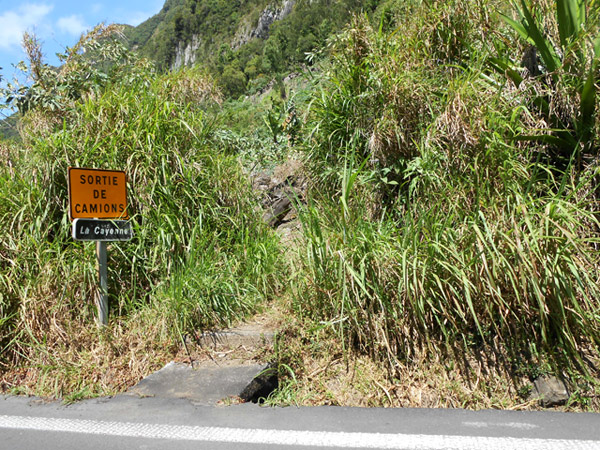 Très facile à dénicher sur la gauche de la route avant d'arriver à Salazie. Ralentir après la route de Bois de Pomme (sur la droite), poursuivre et chercher la pancarte du lieu-dit La Cayenne. Le sentier part dans les herbes pour retrouver immédiatement les premières cultures. Plus aucune difficulté pour poursuivre vers le haut en évitant les minuscules sentes qui pénètrent dans les champs.