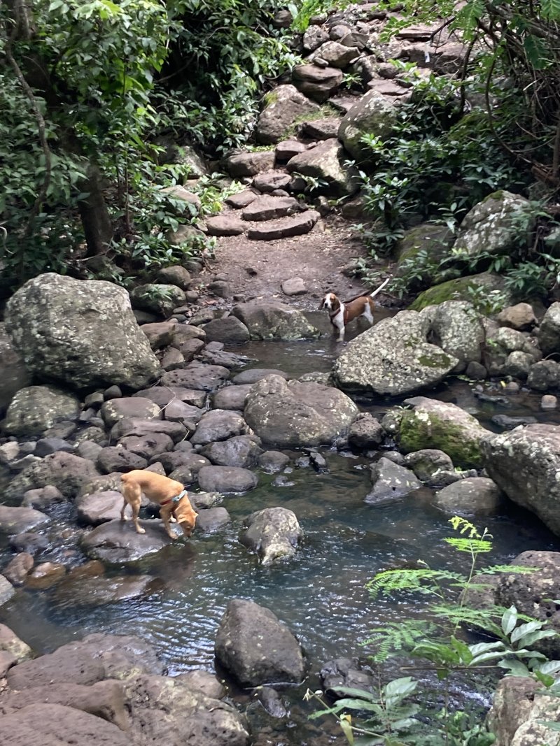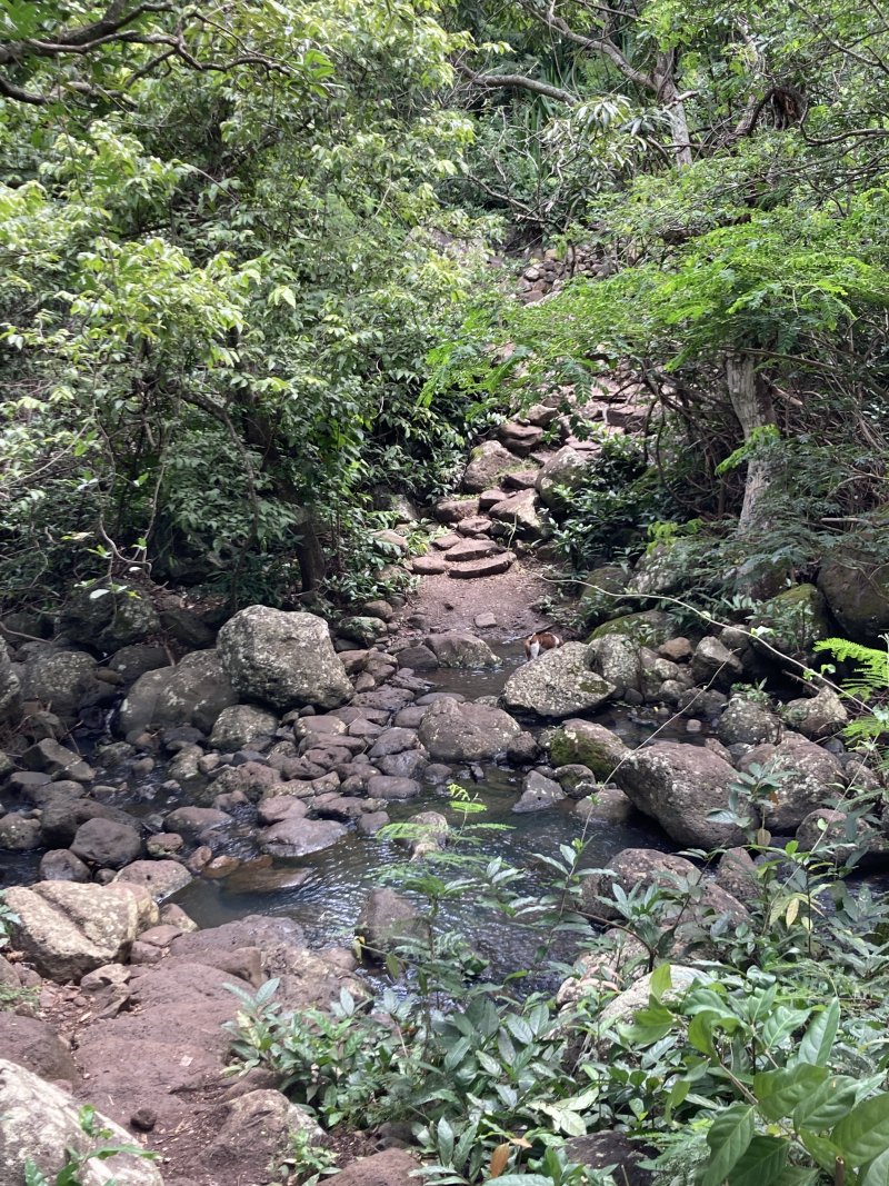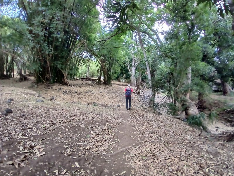 Envie du marché de St Paul, alors je valorise la route avec la découverte du Parc Rosthon et cette boucle à la végétation et paysages diversifiés. La chaleur et l’humidité, en plus des quelques écarts et pauses paysage, notamment vers la chute d'eau et le bassin cheval, feront fi du temps annoncé. Oh surprise, le bruit des voitures est remplacé par celui de l’eau qui coule à flots dans la ravine et les nombreux oiseaux. Quel étonnement d’avoir un si bel endroit si près des zones urbaines. Les vues sur le littoral, et en particulier du Port, me font rêver. A quand une rando urbaine dans le Port?