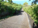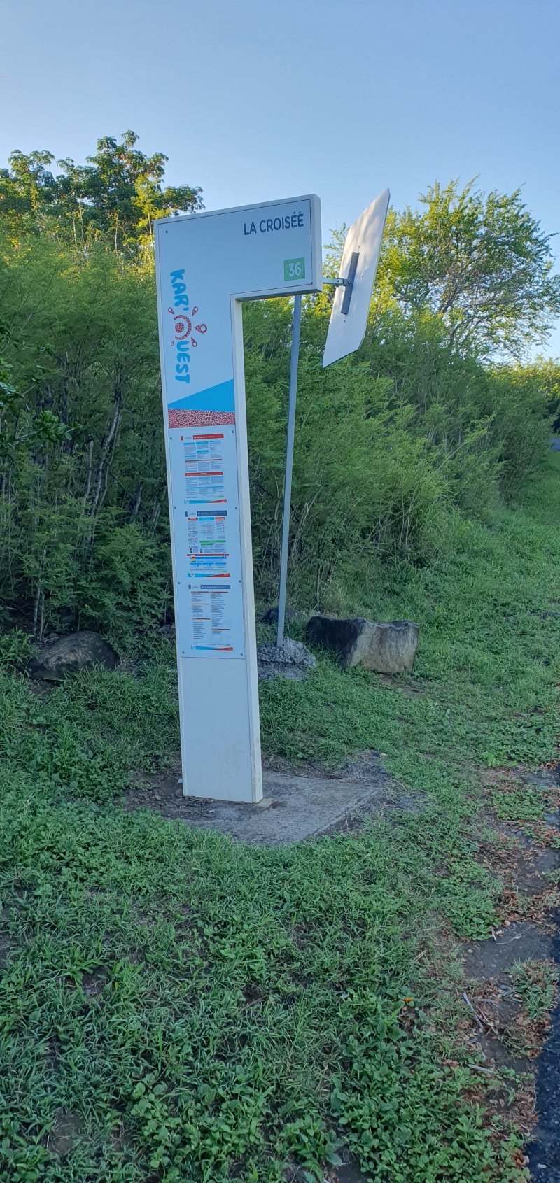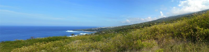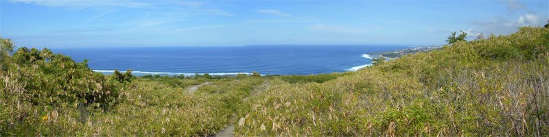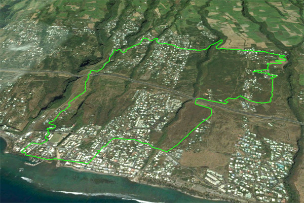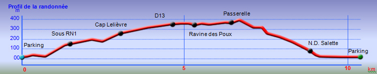 La randonnée débute en pleine ville de Saint-Leu où il est possible de se garer à peu près partout. Cette fiche propose le vaste parking de la rue Archambaud, gratuit, facile d'accès et bien situé. Remonter la Rue Saint-Michel puis prendre assez longuement le Chemin Dubuisson pour rejoindre l'escalier qui mène à Chemin Canal, quelques maisons situées entre la ville et la Route des Tamarins. L'escalier en béton est assez court et se prolonge par un sentier très caillouteux abrité de quelques tamarins des bas dont les fruits trainent au sol (Photo 1). Certains spécimens, vu la sécheresse et la température, atteignent presque des records (Photo 2). Ils procurent de l'ombre mais comme l'air est très chaud, on en profite très peu (Photo 3). La pente est sérieuse sans être trop forte. La liane corail envahit toute la végétation alentour. C'est beau pour la belle couleur de ses fleurs mais dommage pour la nature. Plusieurs sentiers partent sur la droite ; ils mènent tous à des cases où vivent des gens aimant vivre dans la solitude. On arrive au cul de sac d'une rue et le sentier repart dans la même direction, moins caillouteux et plus vert, avec une ombre agréable. Un nouveau cul de sac se présente et on poursuit, toujours dans la même direction en longeant une canalisation sur la gauche. La RN1 est de plus en plus bruyante ; le sentier tourne à gauche pour la longer (Photo 1). Remarquer sur la gauche la clôture barbelée qui est sans doute là pour qu'on ne puisse pas pénétrer dans les milliers d'épineux inextricables qui la bordent ! On franchit une petite passerelle puis on traverse la Route des Tamarins en passant sous le pont de la Ravine des Poux (Photo 5). Le sentier repart très vite sur la droite par les escaliers (Photo 6). Il longe la route dans l'autre direction en empruntant le haut du talus. Le sentier qui remontait vers l'est est désormais trop encombré pour randonner avec plaisir. Suivre alors l'itinéraire en passant entre deux propriétés protégées par du grillage. Longer une piste en terre qui rejoint le Chemin Lelièvre. Tourner à gauche et rejoindre le village en suivant la route ou en prenant les deux raccourcis (voir carte). Le premier est encombré alors que le deuxième est large et aisé. On arrive aux premières cases entourées de jardins fleuris (Photo 7). L'itinéraire se poursuit sur le Chemin Lelièvre qui traverse plus haut des cannes et prairies avant de retrouver la RD13 par un charmant itinéraire (Photo 8). Prendre à gauche et longer cette route où la circulation peut être forte à certaines heures. Effectuer un long détour pour aller passer sur le pont de la Ravine des Poux et le dépasser (Photo 1). Repérer, sur la gauche, le long du mur qui sépare du ravin, le mémorial dédié aux 28 victimes de l'accident de bus du 28 mars 1967 qui a fini sa course plusieurs dizaines de mètre plus bas (Photo 10). Un coup d'œil sur la vallée permet d'imaginer qu'il n'y avait pas de parapet à l'époque (Photo 11). Le village de l'Etang Saint-Leu est agréable à traverser en cherchant les cases ou jardins tout en profitant de larges panoramas sur Saint-Leu et la Saline (Photo 13). Une belle et grande propriété se situe sur la droite à l'entrée du village (Photo 12). Remarquer le manguier qui a poussé sous le pont de la Ravine du Petit Etang (Photo 14) et a résisté aux crues depuis un demi-siècle. Pourtant, la vallée très étroite à cet endroit doit créer des hauteurs d'eau impressionnantes ainsi qu'un courant très fort (Photo 15). Ne pas manquer, à gauche, le Chemin Crescence bordé de cases, de jardins ou de vergers (Photo 16). La route se poursuit mais repérer, à droite d'une case en bois, le discret sentier qui part sur la droite. Il est rocheux, envahi de chocas et de cactus pitayas et se termine à une route étroite qu'on emprunte vers la droite (Photo 17). Franchir un pont métallique sur la Ravine du petit Etang et entamer une longue descente sur une route bétonnée en si forte pente qu'il faut se pencher vers l'arrière pour ne pas être entraîné vers le bas (Photo 18). Plus bas, la petite route arrive à la Route des Tamarins et se poursuit vers Saint-Leu par un long tunnel (Photo 20). Dans la descente, repérer et emprunter le Chemin de la Salette indiqué par une plaque de rue bleue. La tentation de passer par la route bétonnée est grande (Photo 21) mais le sentier part sur la droite et le suit jusqu'aux premières maisons. On s'est beaucoup rapproché de Saint-Leu qu'on domine (Photo 23). L'escalier (Photo 24) qui mène à la chapelle débute immédiatement à la première maison et rejoint très vite Notre Dame de la Salette (Photo 25). Après un chemin de croix, une prière ou une simple visite d'une des petites chapelles des plus fréquentées de l'île, on se retrouve sur la route. Filer en face visiter les jardins entourant l'église de lave (Photo 27), poursuivre jusqu'à la mairie pour voir cet autre bâtiment fabriqué en lave grise donnant aux édifices un caractère austère puis flâner près du port (Photo 28) et du littoral pour rejoindre le parking à la fin de la boucle.