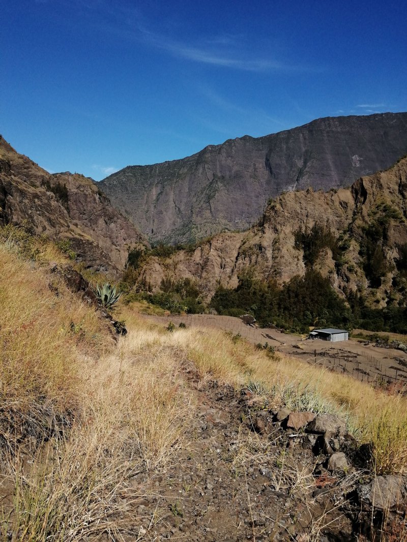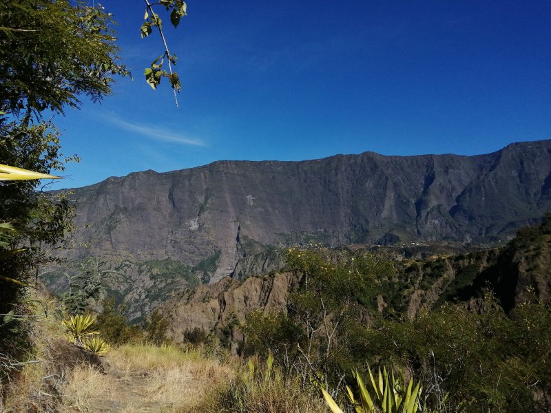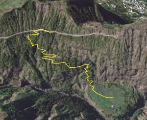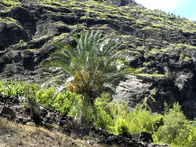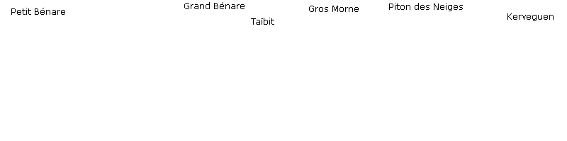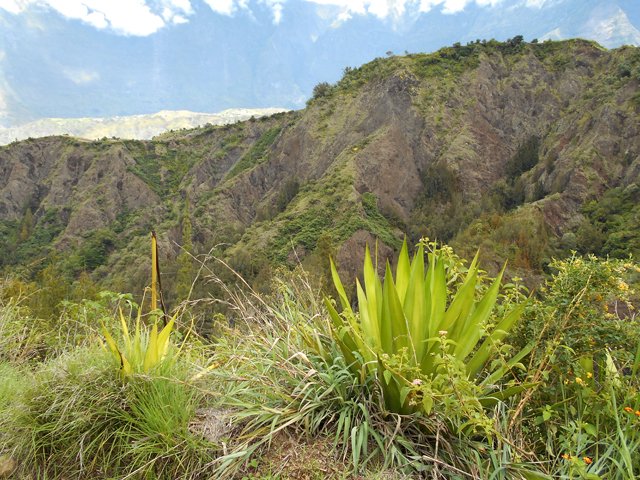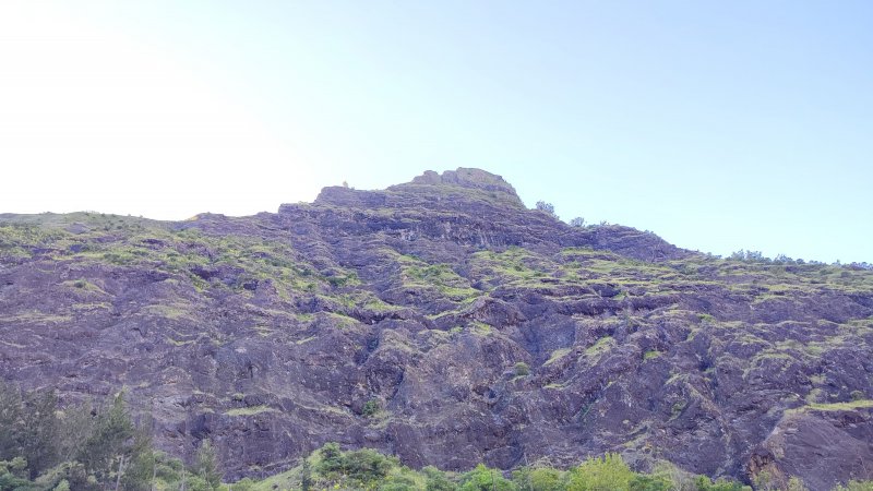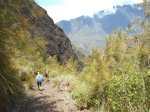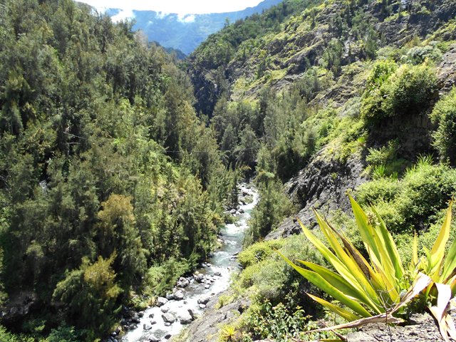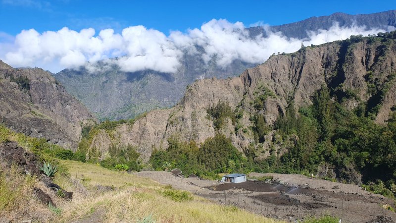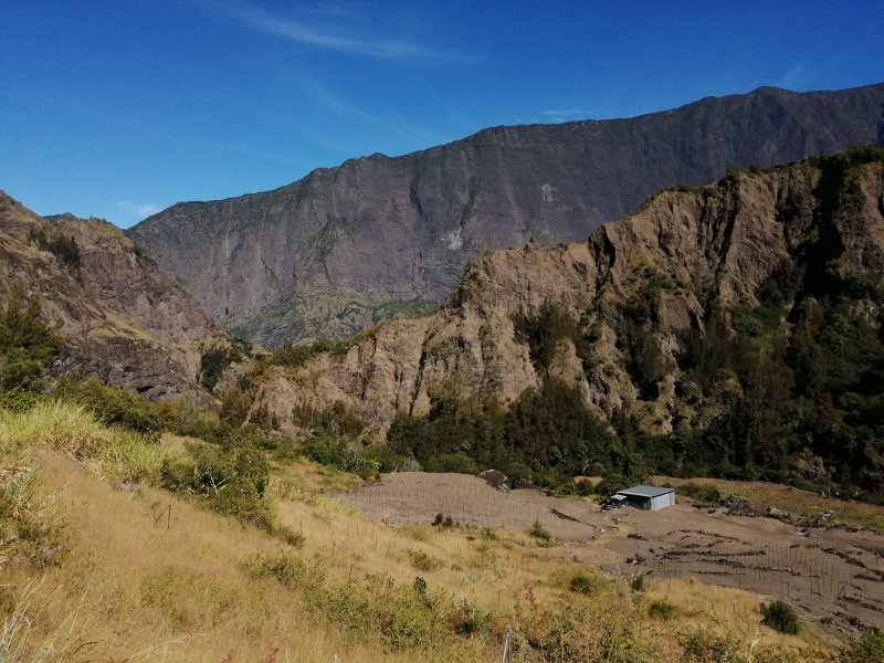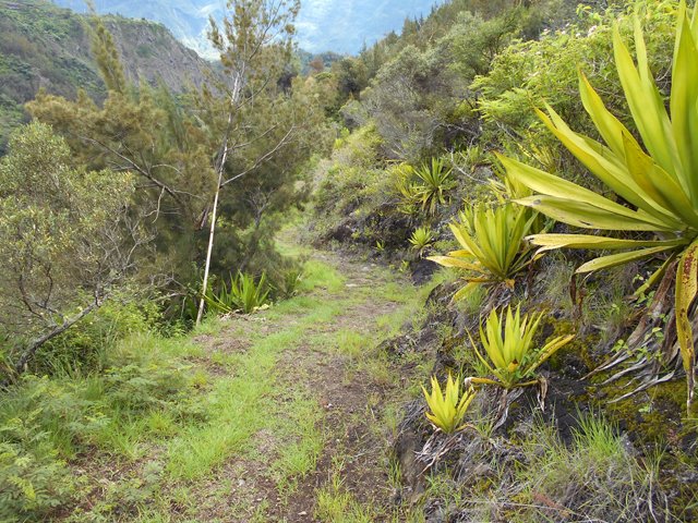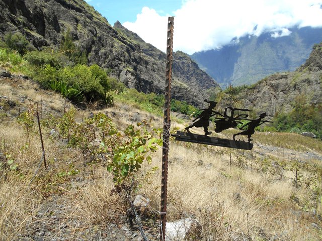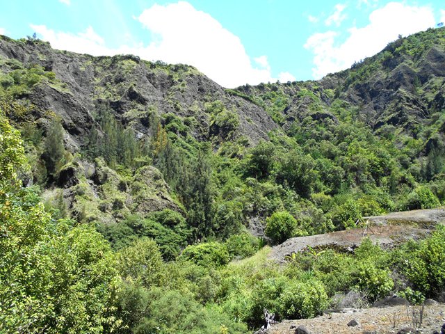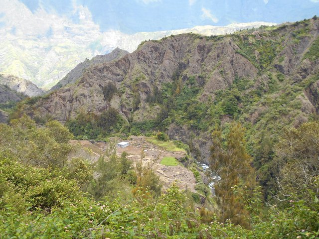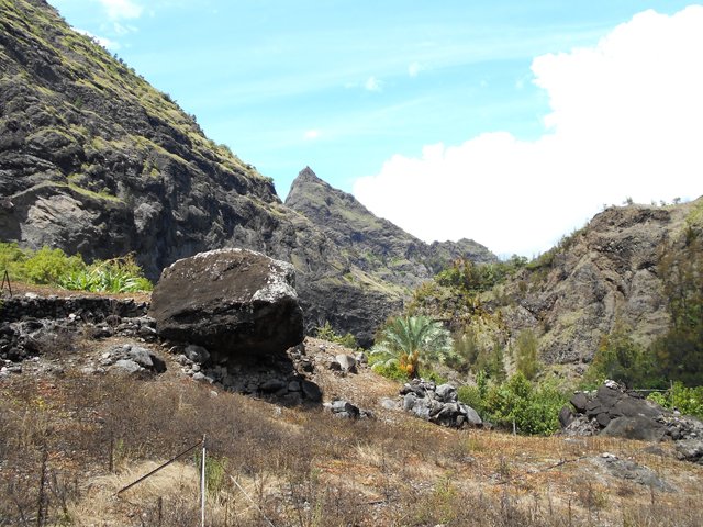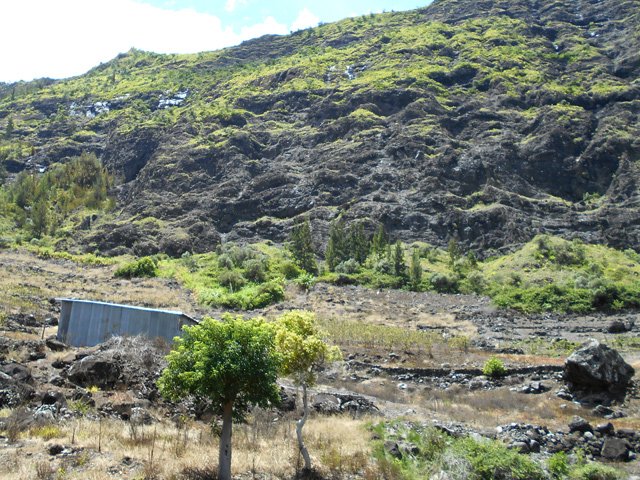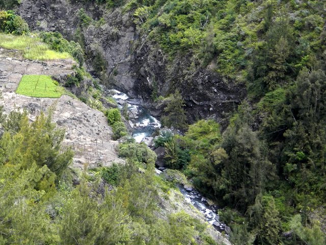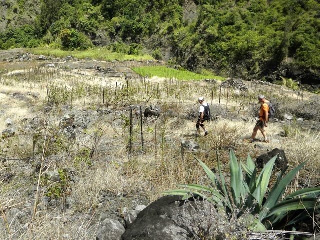 La randonnée débute à la route de Cilaos 300 mètres après le tunnel de Gueule Rouge. Les emplacements de stationnement sont rares et étroits. Bien raser la murette pour ne pas mordre sur la ligne blanche de la route. Le début de la piste est impossible à manquer dans une coupure du mur (Photo 1). La pente est assez douce et régulière et la piste large (Photo 2). L'îlet est coincé entre l'impressionnante muraille du Gros Morne de Gueule Rouge, le Bras de Benjoin et les remparts friables qui le bordent (Photo 3). La piste, creusée à même le rempart, bordé de chocas, descend sans difficulté (Photo 4). On peut voir l'étendue des cultures depuis certains virages de la piste (Photo 6). Le Bras de Benjoin qui coule tout près est fougueux et donne envie de s'en approcher, mais difficile de trouver un passage où marcher (Photo 7). A mi-parcours, ce sont les filaos qui constituent le gros de la végétation sans pour cela boucher la vue (Photo 1). Avant d'arriver dans les cultures, un regard vers le sommet du Gros Morne de Gueule Rouge donne l'impression que tout un pan de la montagne peut se détacher (Photo 10). C'est un peu le clou de cet aller-retour. On arrive très rapidement aux cultures qui évoluent en fonction du climat, de la mode ou des besoins. La vigne a été régulièrement ôtée pour être remplacée par les lentilles ou comme ici par des arachides (Photo 12). Les piquets maintenant la vigne sont encore sur place. Pas d'arbres fruitiers comme dans beaucoup d'îlets ; pas de manguier, pas de bambous, pas de cocotier mais un palmier isolé peut procurer un peu d'ombre aux semeurs lors des grosses chaleurs (Photo 13). Une case en tôle sert à entreposer les outils car on voit bien que l'endroit n'est pas habité (Photo 14). On a devant soi, sur la droite, les énormes éboulis tombant de la Plateforme. Un énorme rocher en équilibre précaire a sans doute dégringolé les pantes du Gros Morne depuis quelques siècles (Photo 17). Devant coule le Bras de Benjoin et on voit très vite qu'il est périlleux de s'en approcher à partir de ce lieu car les falaises sont très pentues et la terre est très peu stable. L'opération est faisable en passant par la petite ravine au coin des champs mais elle est trop périlleuse pour être décrite ici. Même si on ne descend pas au plus près du Bras de Benjoin, le spectacle de ce torrent au milieu des filaos est agréable (Photo 18). La remontée par la piste prendra un peu plus d'une demi-heure.
