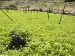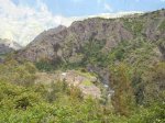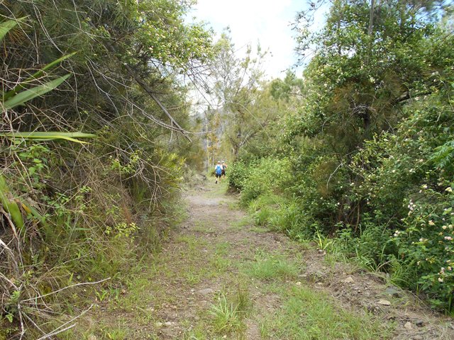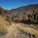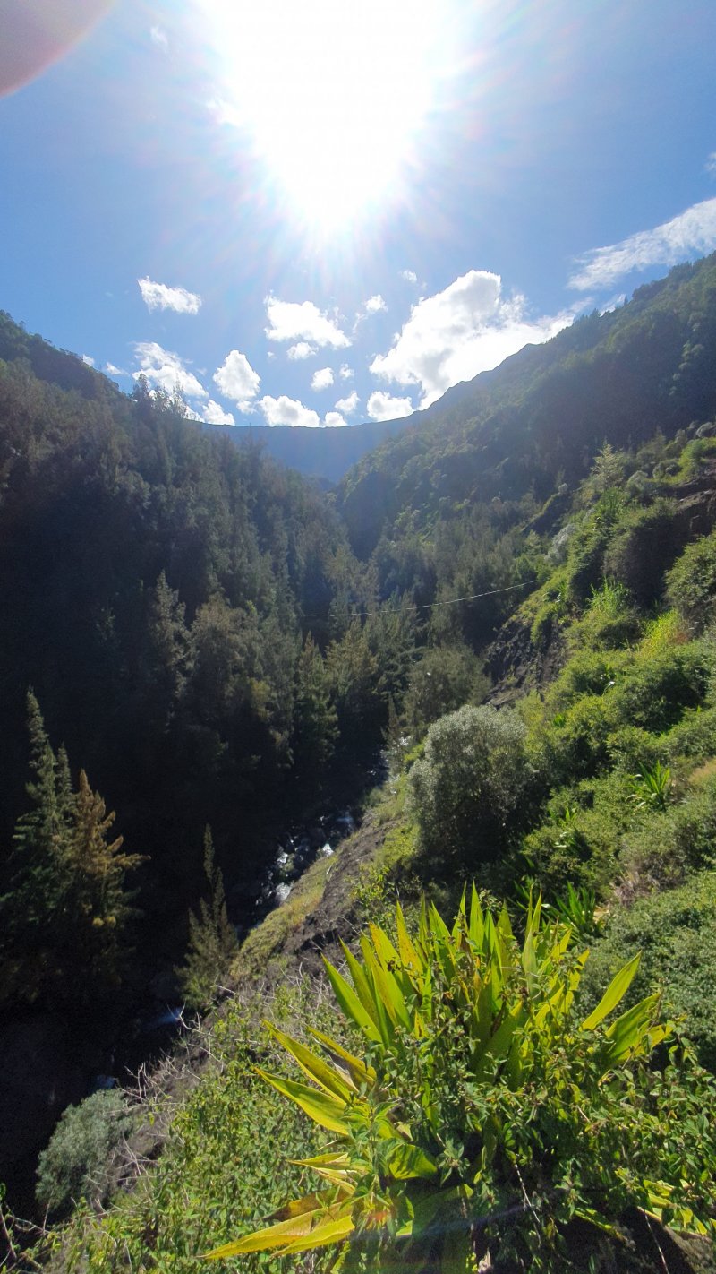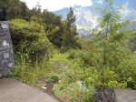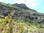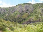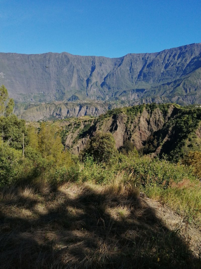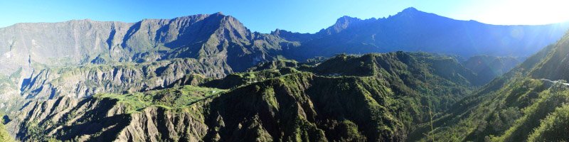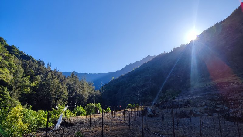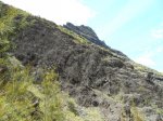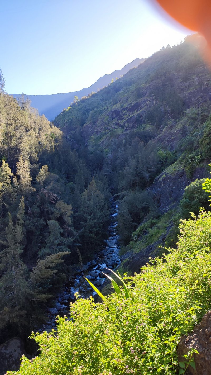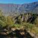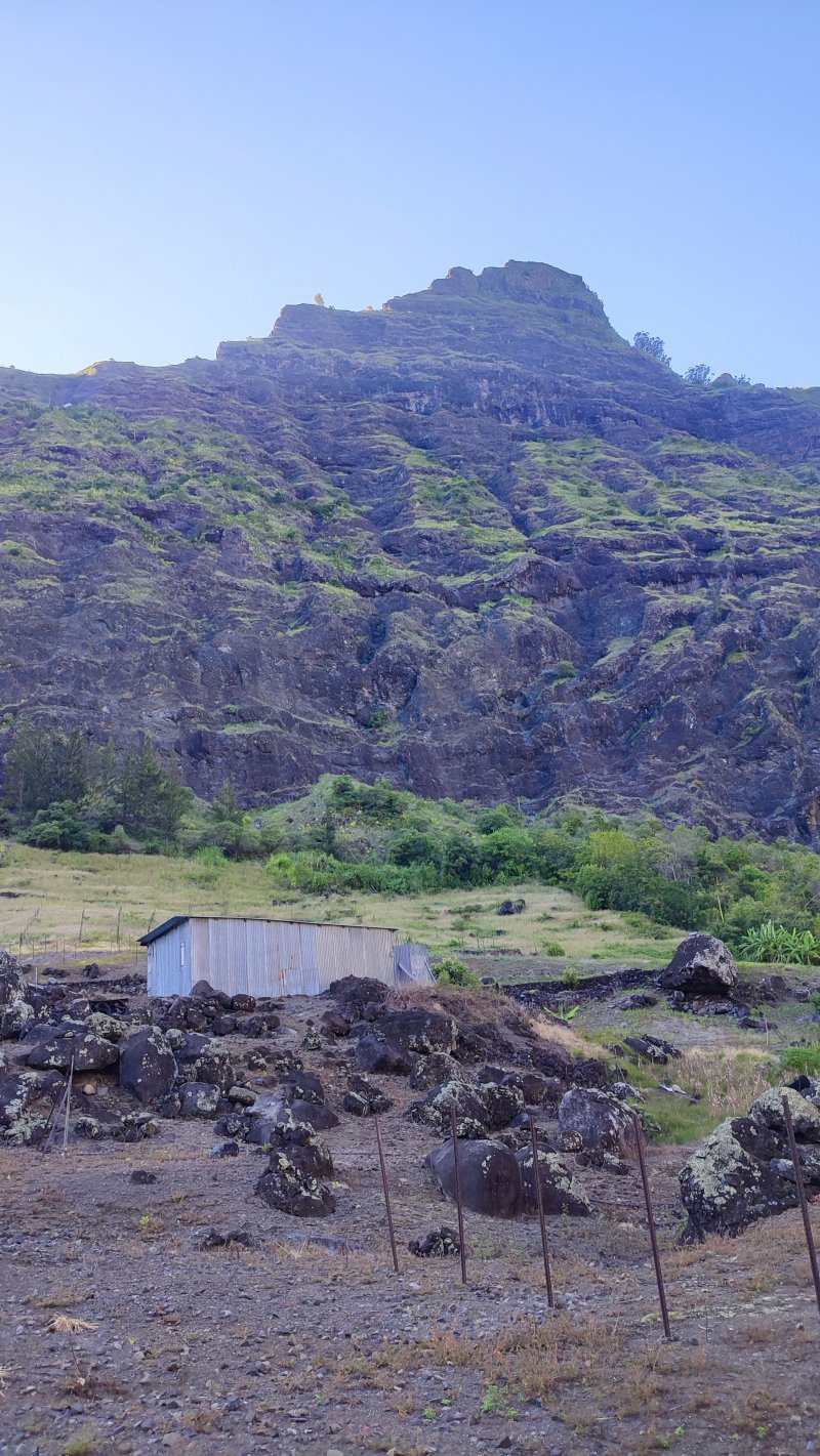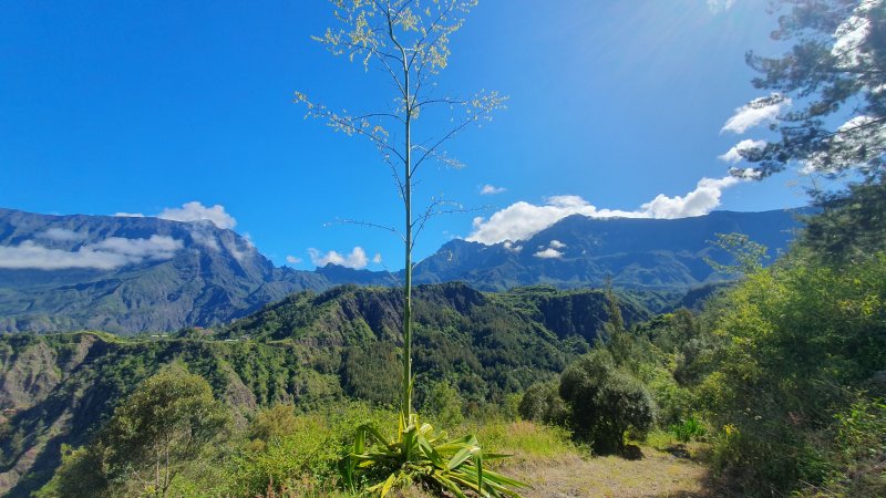 La randonnée débute à la route de Cilaos 300 mètres après le tunnel de Gueule Rouge. Les emplacements de stationnement sont rares et étroits. Bien raser la murette pour ne pas mordre sur la ligne blanche de la route. Le début de la piste est impossible à manquer dans une coupure du mur (Photo 1). La pente est assez douce et régulière et la piste large (Photo 2). L'îlet est coincé entre l'impressionnante muraille du Gros Morne de Gueule Rouge, le Bras de Benjoin et les remparts friables qui le bordent (Photo 3). La piste, creusée à même le rempart, bordé de chocas, descend sans difficulté (Photo 4). On peut voir l'étendue des cultures depuis certains virages de la piste (Photo 6). Le Bras de Benjoin qui coule tout près est fougueux et donne envie de s'en approcher, mais difficile de trouver un passage où marcher (Photo 7). A mi-parcours, ce sont les filaos qui constituent le gros de la végétation sans pour cela boucher la vue (Photo 1). Avant d'arriver dans les cultures, un regard vers le sommet du Gros Morne de Gueule Rouge donne l'impression que tout un pan de la montagne peut se détacher (Photo 10). C'est un peu le clou de cet aller-retour. On arrive très rapidement aux cultures qui évoluent en fonction du climat, de la mode ou des besoins. La vigne a été régulièrement ôtée pour être remplacée par les lentilles ou comme ici par des arachides (Photo 12). Les piquets maintenant la vigne sont encore sur place. Pas d'arbres fruitiers comme dans beaucoup d'îlets ; pas de manguier, pas de bambous, pas de cocotier mais un palmier isolé peut procurer un peu d'ombre aux semeurs lors des grosses chaleurs (Photo 13). Une case en tôle sert à entreposer les outils car on voit bien que l'endroit n'est pas habité (Photo 14). On a devant soi, sur la droite, les énormes éboulis tombant de la Plateforme. Un énorme rocher en équilibre précaire a sans doute dégringolé les pantes du Gros Morne depuis quelques siècles (Photo 17). Devant coule le Bras de Benjoin et on voit très vite qu'il est périlleux de s'en approcher à partir de ce lieu car les falaises sont très pentues et la terre est très peu stable. L'opération est faisable en passant par la petite ravine au coin des champs mais elle est trop périlleuse pour être décrite ici. Même si on ne descend pas au plus près du Bras de Benjoin, le spectacle de ce torrent au milieu des filaos est agréable (Photo 18). La remontée par la piste prendra un peu plus d'une demi-heure.
