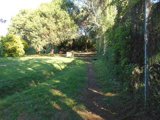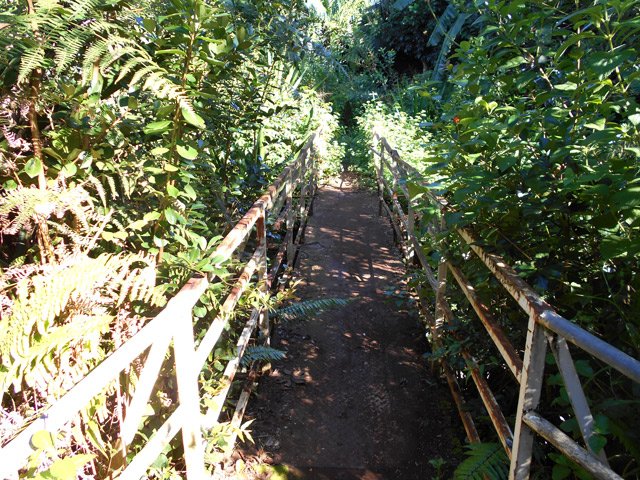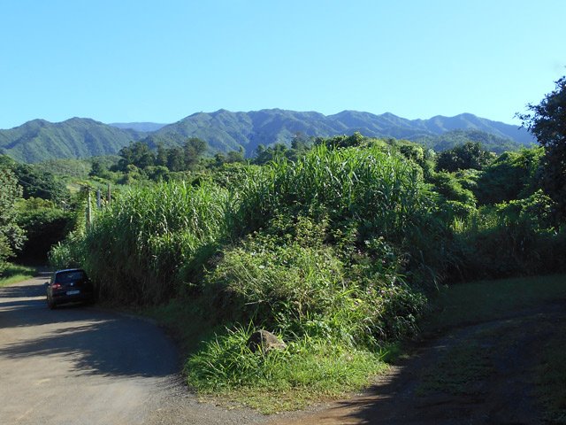 La randonnée débute près de l'école et de la réserve d'eau du Gol les Hauts. Un parking, facile à trouver près de la réserve d'eau, permet de stationner sans problème. Un sentier longe le grillage entourant la réserve d'eau. Il se poursuit par la droite et rejoint la petite route bordant le terrain de sport. Le sentier qui longe le mur d'enceinte d'une case est très envahi de végétation ; préférer, pour s'approcher du bassin, le petit sentier qui débute au coin du terrain de sport. Il descend entre des emplacements délaissés de pique-nique avant d'arriver à un bassin repérable au bruit que fait la petite chute d'eau (Photo 4). L'endroit pourrait être agréable une fois nettoyé. Faire demi-tour, emprunter la route par la gauche et bénéficier de beaux panoramas sur la chaîne des Makes (Photo 5). On poursuit en franchissant la Ravine Richard pour emprunter sur la gauche la première ruelle de la boucle. Elle se transforme très vite en sentier qui franchit plus bas la passerelle de Majeannette, un peu envahie de végétation. Le sentier qui continue en montant rejoint d'autres zones du quartier en passant devant un chien peu souriant ! Délaisser ce sentier pour prendre à gauche, longer puis traverser les cannes à sucre. On arrive à la belle route des Canots qui redescend vers la Route Hubert Delisle. Prendre à gauche et longer cette route agréable avant de retrouver une nouvelle ruelle. A partir de ce point, on alternera ruelles et rues de la ville. Difficile de se perdre car la boucle est constamment à deux pas des habitations mais il est possible en revanche de rajouter très vite des kilomètres si on ne suit pas le trajet proposé. Repérer les nombreux oratoires dispersés sur le trajet et oser le détour vers l'Eglise du Rosaire qui ne prendra que quelques minutes. Une autre boucle de 7 km part à un km de là, au Ruisseau les hauts et peut rajouter un peu de campagne a cette sortie urbaine.