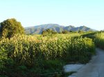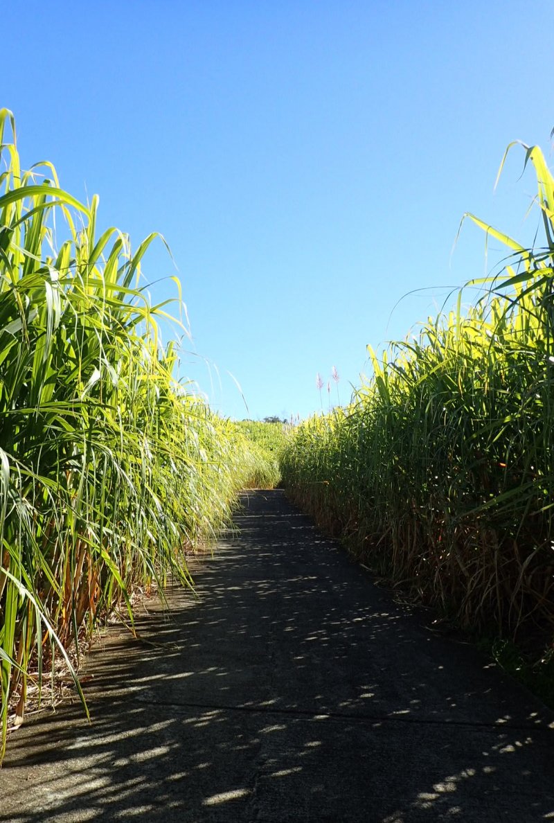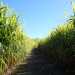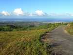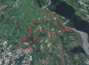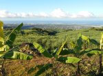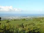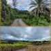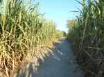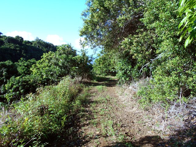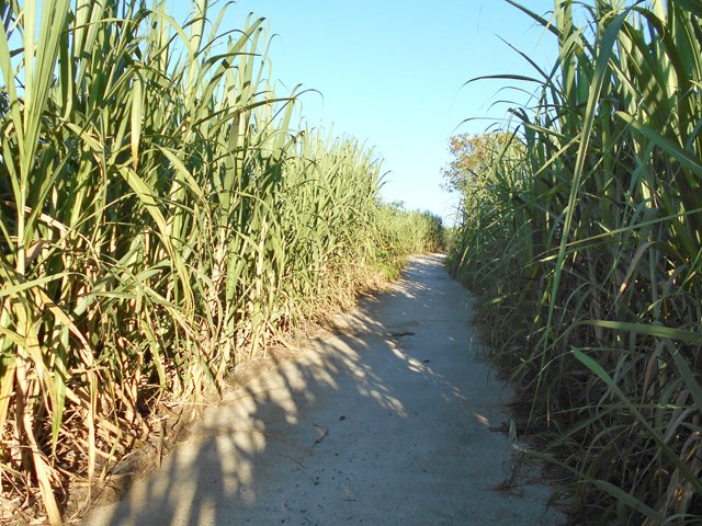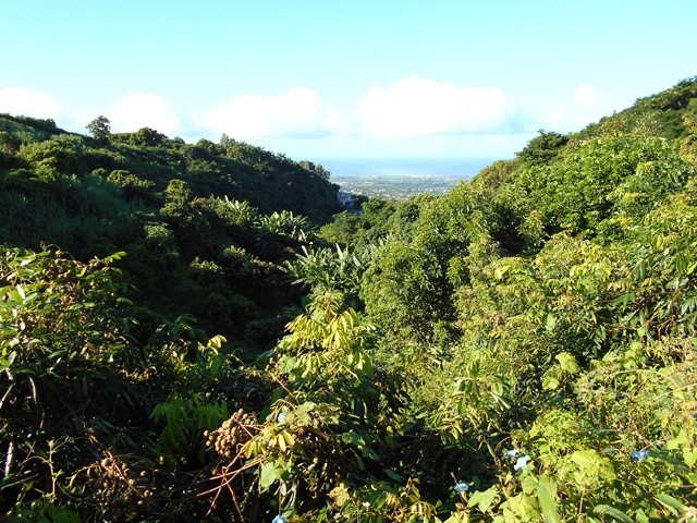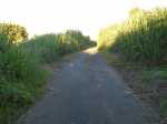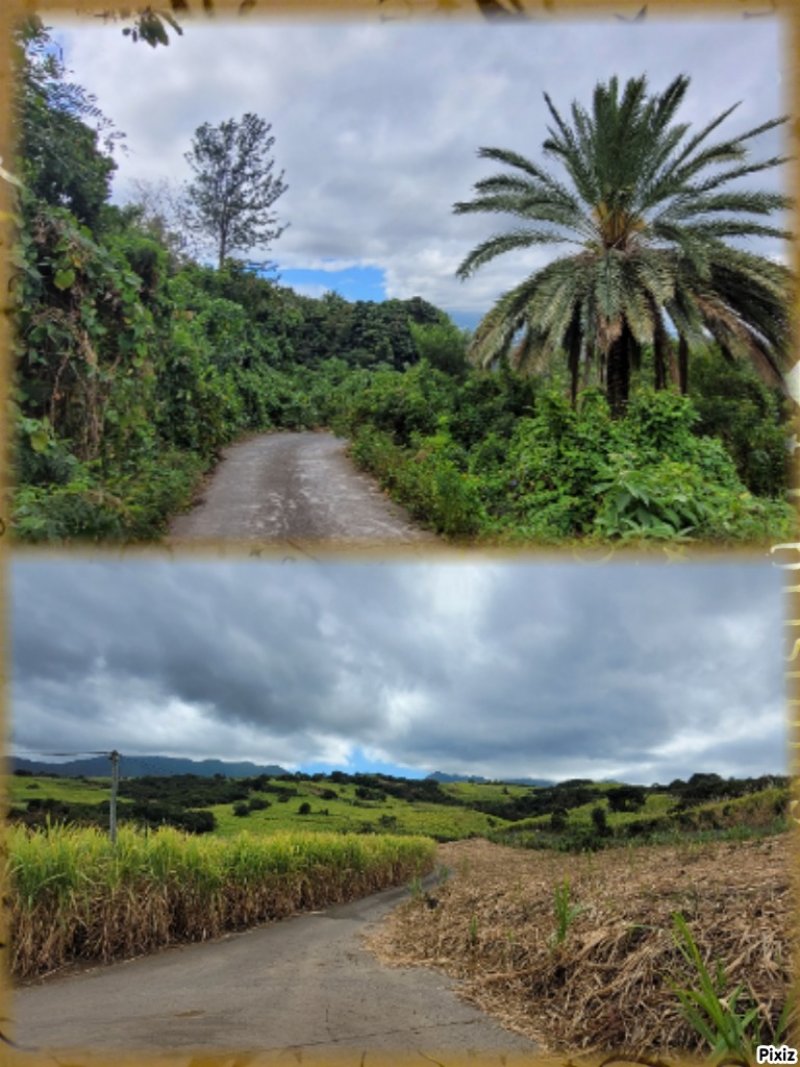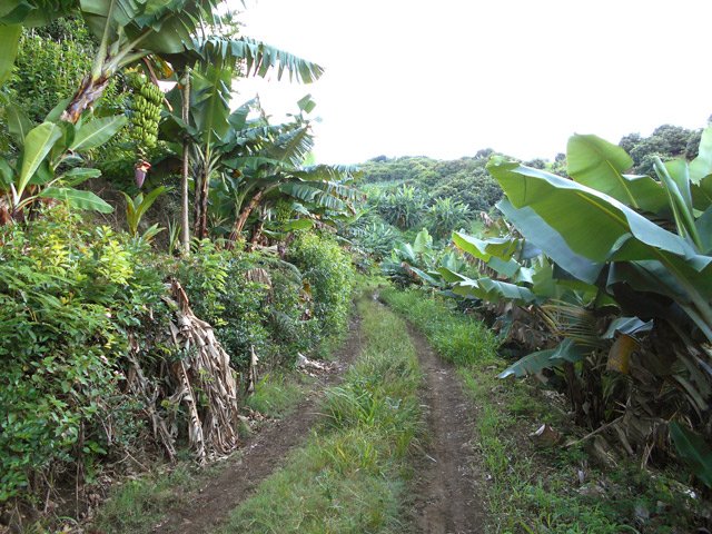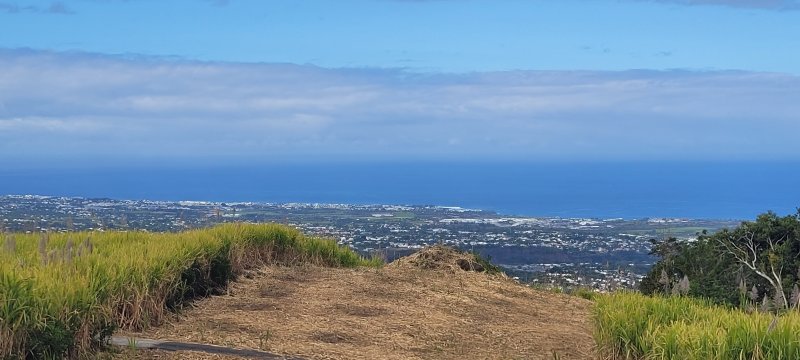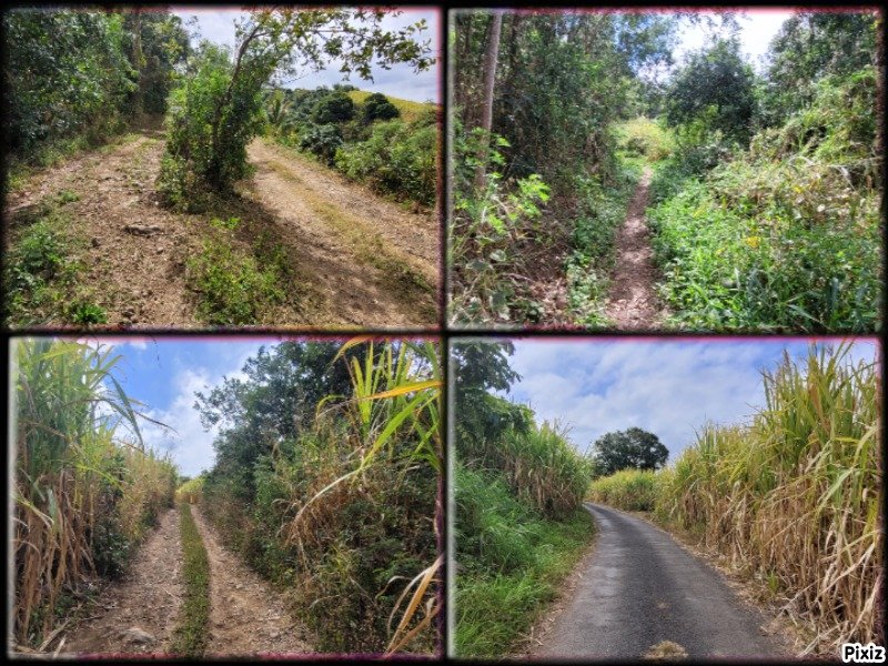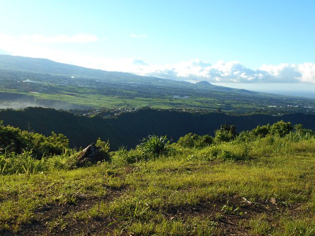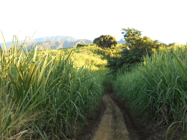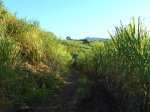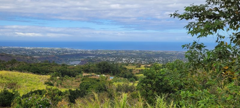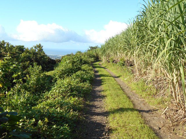 La randonnée débute sur le Chemin des Bois Noirs après avoir trouvé un emplacement de stationnement le long de la Route Hubert Delisle. Comme toutes les routes un peu perdues, celle-ci est bordée des ordures laissées là depuis la vitre ouverte d'un véhicule. En faible montée (Photo 1), elle permet de rejoindre la première piste de la boucle qui s'enfonce dans les vergers sur la droite, avant une boucle importante de la route. On se retrouve à l'ombre des poivriers, letchis, bananiers, canne et maniocs. Certains régimes doivent dépasser facilement les 20 kg. Attention, la piste se sépare en deux très rapidement. Bifurquer à gauche et laisser celle qui file dans les champs de bananiers (Photo 2). Cette piste est étroite et assez herbeuse (Photo 3). Il faut viser alors le pylône électrique qu'on aperçoit plus haut (Photo 5) et marcher dans des herbes, humides le matin. Bifurquer à gauche au portail métallique et passer près d'une bananeraie qui permet un beau point de vue sur Saint-Louis, l'océan et d'autres villes de la région (Photo 4). L'arrivée au pylône se fait après quelques lacets herbus. On rencontre alors une piste transversale de bonne qualité, étroite, en légère descente et dévorée par les cannes à sucre qui laissent tout de même assez de place pour marcher (Photo 6). La campagne aux alentours est agréable malgré l'importance de la canne. Des haies donnent à la région un petit air de bocage (Photo 7). La piste reste toujours identique et propre pour une marche agréable à l'ombre (Photo 8). La piste se finit à une route bétonnée qui remonte dans les cannes et les champs (Photo 9). Les points de vue sur le Dimitile sont nombreux malgré la hauteur de la canne (Photo 10). On a également de belles vues sur la Chaine du Bois de Nèfles vers les Makes du côté d'un champ qui pour une fois ne produit pas de canne (Photo 11). La route se poursuit en pente faible (Photo 13). Inutile de se méfier de la circulation qui est quasi nulle. On profite encore de beaux panoramas sur les villes littorales à peine masquées par les longues feuilles vertes (Photo 14). On ne tarde plus à rejoindre le Chemin du Grand Détour, étroit passage bétonné, en descente à travers les champs de canne. Les paysages sur le Bras de Cilaos permettent de voir jusqu'au Piton de Mont Vert et à l'océan (Photo 17). On aperçoit également les villes du Tampon à Saint-Louis par-dessus les bananiers (Photo 18 et 19). On a plus l'habitude de klaxonner quand on roule sur de telles routes, totalement envahies pas la canne tombant de chaque côté. Remarquer la méthode utilisée rarement par les planteurs pour regrouper la canne en grappes afin que la plante n'encombre pas la route déjà étroite (Photo 20). Ne pas manquer sur la droite la piste qui semble se terminer à une case en bois mais qui se poursuit en la frôlant. Elle descend doucement à travers les cannes ou les vergers de letchis et longanis (Photo 22). Plusieurs pistes partent à droite ou à gauche mais on suit toujours la voie principale (Photo 24). Les abords de la piste sont encombrés de véritables de forêts comportant beaucoup d'arbres fruitiers (Photo 25). A un moment, avant un "pied de bois de goyave", bifurquer à angle droit vers la gauche. La piste est plus caillouteuse que celles prises jusque là (Photo 26). On passe près d'une case abandonnée dans une zone rocheuse et très boisée un peu avant la Ravine des Fiagues. On se retrouve très vite aux premières cases qui bordent le Chemin des Bois Noirs, très proche du véhicule.