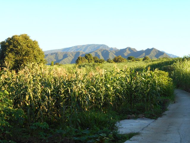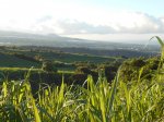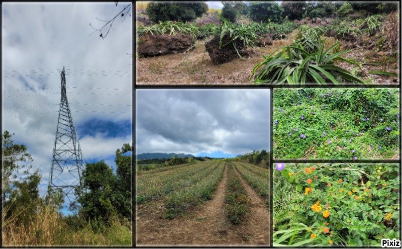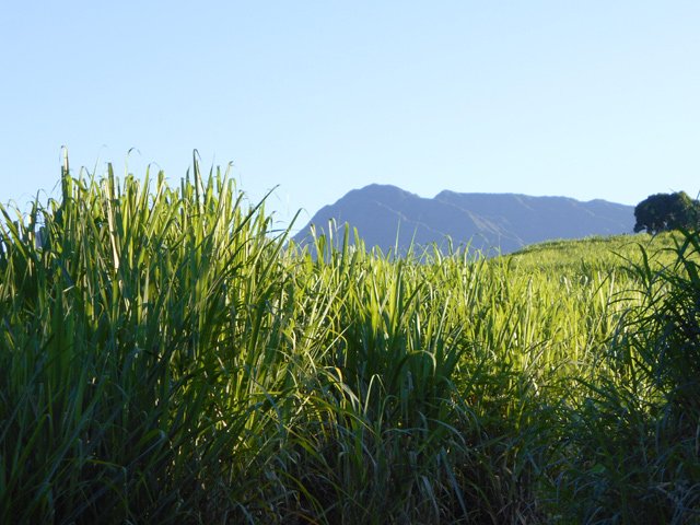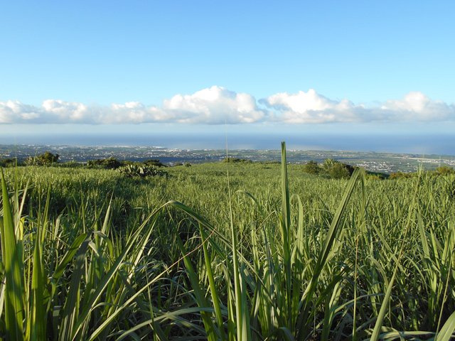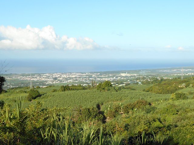 Sur une idée de François, acharné défricheur du sentier menant du Petit Serré au Tapage par l'Îlet Bleu, voici une courte boucle pour sortir les enfants dans les cannes à sucre et la région de Curepipe. Ce nom qui n'apparaît sur aucune carte peut se lire sur le château d'eau qui recueille plus bas les eaux de cette région, lors de la boucle qui fait le tour du Gol les Hauts. Cette canne, à perte de vue, permet tout de même de beaux panoramas sur le Dimitile, les pitons entourant les Makes, le quasi canyon de la Rivière Saint-Etienne et l'océan. On traverse ou on longe de vastes vergers de longanis, mangues, papayes ou letchis qu'il ne faut évidemment pas goûter ou cueillir ! Une piste, proposée par François est trop envahie de grandes herbes pour plaire à nos marmailles. Un agriculteur croisé le jour de la randonnée épandait du désherbant sur certaines pistes de la zone. A moins d'aimer ce genre de traversées, privilégier la route pour une courte distance. Voir la carte de la photo 28 pour s'aider dans le choix de l'itinéraire à emprunter.
