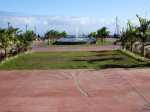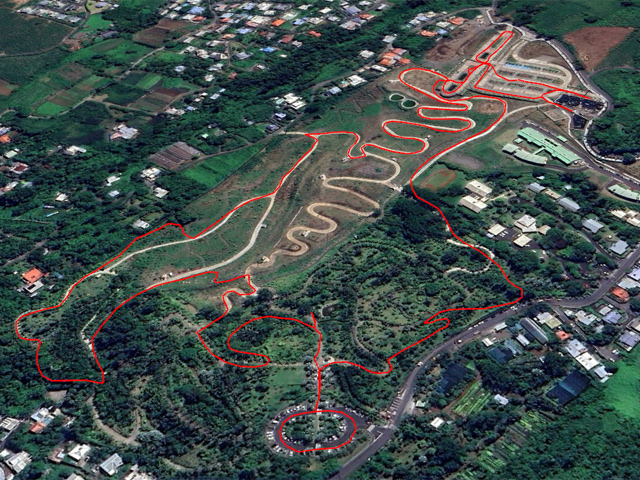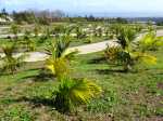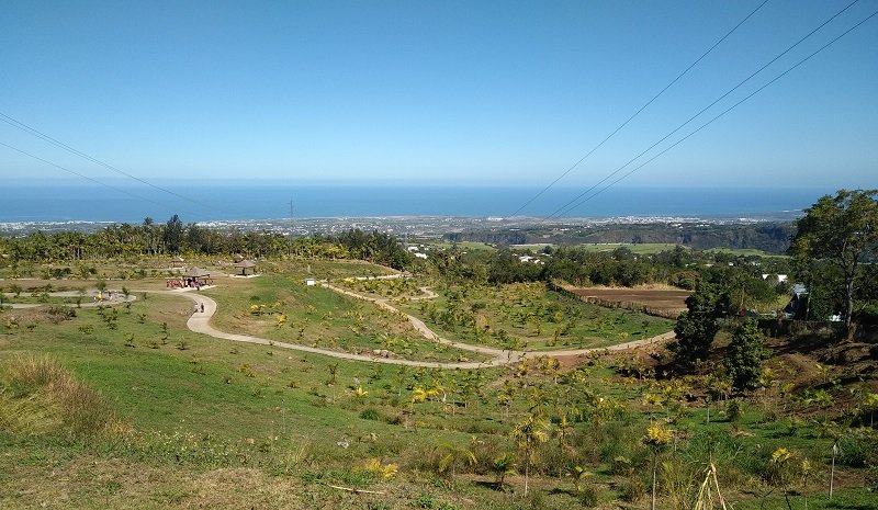 La randonnée débute au parking nord du parc mais peut tout aussi bien commencer au sud. Une fois stationné, rejoindre l'escalier dominant l'esplanade et viser le belvédère que l'on aperçoit au fond (Photo 2). Les palmiers sont déjà là auprès des bassins et des jets d'eau (Photo 3). Du belvédère qui domine le parc de quelques mètres on a sous les yeux la totalité des plantations et le long serpent de la piste bétonnée descendant en direction de l'océan (Photo 4). C'est cette longue piste sur une petite surface qui attire les coureurs à pied (Photo 5). Quitter le belvédère et rejoindre cette piste en lacets puis entamer la longue descente. Les palmiers nouvellement plantés sont très nombreux mais très souvent de la même espèce. Difficile d'imaginer ce que donneront tous ces "arbres" dans quelques années (Photo 6). Repérer, sur le sol, les indications en couleur des différents circuits de footing et les distances déjà parcourues (Photo 7). Si l'on perd en beauté du parc, on y gagne en panoramas sur le Dimitile et les sommets entourant le Cirque de Cilaos (Photo 8). Pour varier l'itinéraire, prendre la première piste à droite qui descend à travers ces nouvelles plantations. On rencontre plusieurs sentiers assez fréquentés par les coureurs (Photo 9). Un peu plus bas, il est conseillé de quitter le béton pour emprunter un de ces parcours sur la terre et l'herbe (Photo 11). On retrouve très vite les pistes en arrivant à l'orée du premier parc (Photo 12). La transition est courte mais la différence importante. On imagine plus facilement ce que sera le nouveau parc en regardant les grands palmiers poussant dans un fouillis très organisé (Photo 13). La ravine du fond se passe actuellement en empruntant une déviation créée en raison d'un éboulis des berges. Après la ravine, reprendre les chemins bétonnés en profitant de petits panneaux indiquant noms et origines des palmiers (Photo 14). Emprunter de nouveaux sentiers de raccourcis pour atteindre le cœur du premier parc en franchissant un pont (Photo 15). La balade, très instructive, s'effectue au milieu de grands palmiers de toutes les régions du monde (Photo 16). Certains atteignent des hauteurs fort raisonnables (Photo 17). En quittant le béton pour des chemins ombragés sur terre rouge, on peut atteindre aisément un petit bassin, son jet d'eau et l'autruche de David Nativel, une sculpture métallique (Photo 18). L'esplanade Sud se remarque facilement au parking tout proche. Les superbes palmiers de Bismarck se laissent facilement photographier (Photo 19). Repérer ce parking pour une prochaine visite (Photo 21). Il est plus petit que celui du nord mais on pénètre directement dans le parc des grands palmiers. Le panneau, identique à celui de l'autre entrée indique bien les circuits de marche et leur couleur (Photo 22). Prendre la direction du retour en suivant pistes bétonnées ou petits chemins ombragés (Photo 23). Même proches de la route on y marche au calme et souvent seul (Photo 24). Il n'est pas interdit de marcher sur les pelouses mais elles sont si bien entretenues qu'on n'ose à peine se rapprocher d'un panonceau pédagogique (Photo 26). Profiter de toutes les merveilles de la nature avant de revenir au nouveau parc où aucun palmier n'est en âge de produire des fleurs (Photo 27). Après l'école, on retrouve la piste montant en lacets pour rejoindre le belvédère. Avant de repartir, gagner les aires de jeux si l'on est venu avec des enfants ou pourquoi ne pas utiliser les appareils de musculation mis gracieusement à la disposition des sportifs (Photo 28).