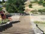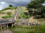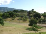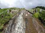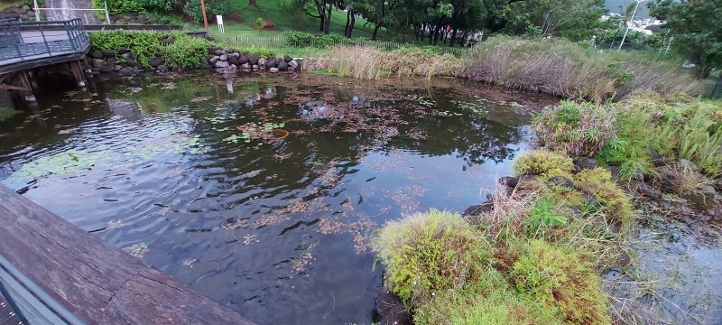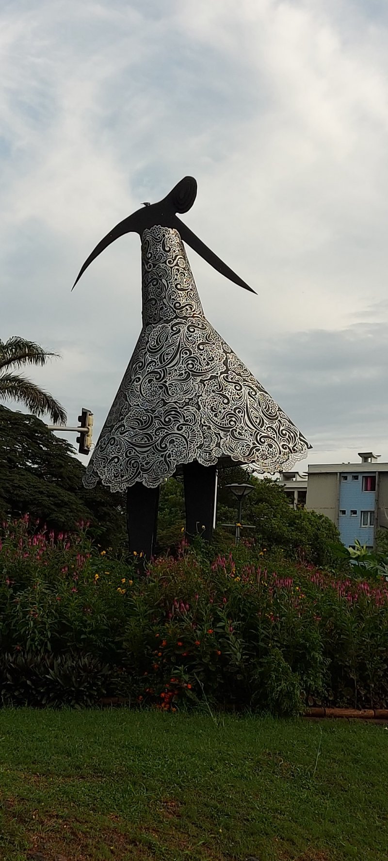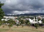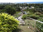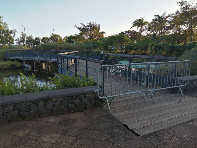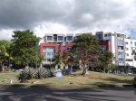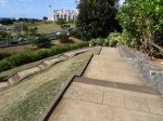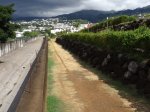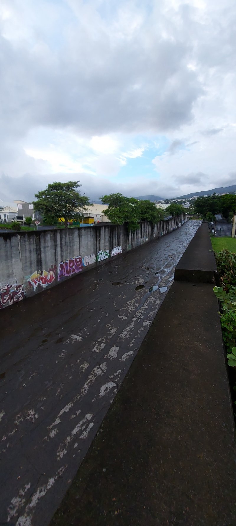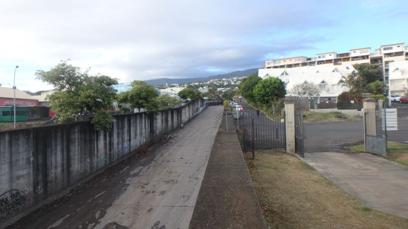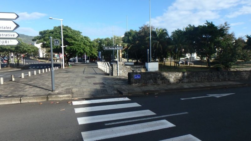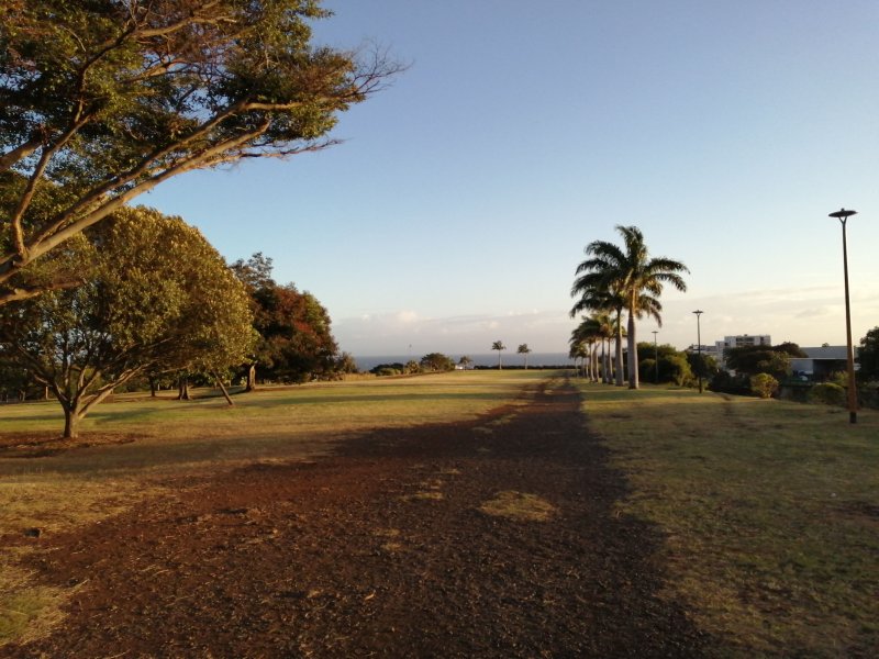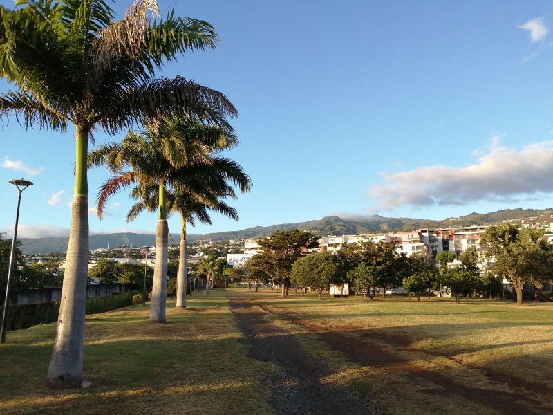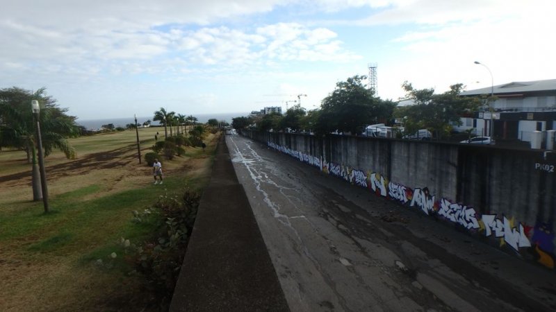 La boucle débute ici à Vauban pour rallonger la balade. Aucun problème de stationnement sur ce vaste parking situé à deux pas du Boulevard Sud. Partir vers la Ravine du Butor par une large passerelle qui surplombe cette ravine canalisée pour traverser la ville (Photo 1). Se diriger vers la gauche du Gymnase Patrick Cazal en suivant une piste un peu ombragée proche de la Ravine Laverdure (Photo 2). L'endroit, moins fréquenté que le parc de la Trinité, comporte pourtant de magnifiques arbres (Photo 3). Rejoindre la route de la Mairie par la droite, traverser le rond-point et se diriger vers le Monument à la gloire de Gandhi (Photo 4). On est tout près de quelques jeunes baobabs et du monument mémorial de l'esclavage, proches du Boulevard Sud. Emprunter la piste par la droite et rejoindre la Rue du Pape Jean Paul II. On aperçoit l'église de la trinité et son clocher très pointu à une centaine de mètres (Photo 5). Traverser au feu et entrer dans la Parc de la Trinité en débutant cette nouvelle exploration par un petit étang alimenté par une chute d'eau (Photo 6). Elle tombe dans un bassin envahi par les papyrus où nagent quelques poissons (Photo 7). Suivre alors une piste bétonnée très large qui monte légèrement vers la fin du parc, fermé cette fois par la Ravine Maduran (Photo 9). Un large chemin terreux suit cette ravine domestiquée, bétonnée, rectiligne et le plus souvent à sec (Photo 10). Tout autour, les arbres créent de l'ombre. On profite en plus de larges panoramas sur la ville ou les falaises qui dominent la Route du Littoral (Photo 12). A partir de l'entrée officielle du parc, plusieurs sentiers ou pistes partent dans tous les sens et il est possible de se créer un circuit à la carte. Cette reconnaissance suit le côté de ce qui pourrait être un terrain de sport. On voit très bien la petite colline artificielle sur la gauche (Photo 13). La pente est un peu raide pour arriver à son pied. Là également, plusieurs itinéraires mènent au sommet où l'on peut se rapprocher du haut de la chute d'eau en passant au plus près d'un long toboggan (Photo 15). Du haut de la colline, les points de vue sur la ville se multiplient (Photo 16). On passe près du grand escalier qu'il peut être bon de monter et descendre plusieurs fois dans le cadre d'un entraînement (Photo 18). Du haut de la cascade, on aperçoit l'océan du côté de Champ Fleuri et Montgaillard (Photo 19). La descente vers le petit étang s'effectue en quelques lacets bétonnés (Photo 21). Le retour à Vauban emploie le même parcours qu'à l'aller mais en changeant de côté pour frôler la Médiathèque François Mitterrand (Photo 23) ou s'éloigner un peu du gymnase en empruntant une petite piste plate et agréable (Photo 24). Bien malin qui saura lire tous les textes sculptés en plusieurs langues sur les gros galets à la mémoire des esclaves (Photo 26 et 27). La meilleure solution consiste, pour rallonger un peu, à effectuer plusieurs tours dans le Parc de la Trinité. On peut également prolonger cette boucle en arrivant à la Ravine Maduran et en prenant à gauche pour passer sous le boulevard et regagner les autres zones d'activités sportives.