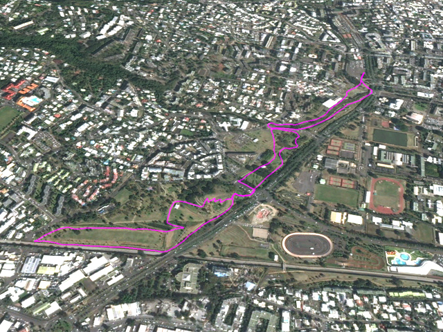 Tous les habitants de Saint-Denis connaissent cette petite colline artificielle terminée après la construction du Boulevard Sud. Le Parc de la Trinité comporte des dizaines de pistes pour les sportifs du chef-lieu. L'endroit est toujours rempli de coureurs et marcheurs, principalement le week-end ou à la sortie des bureaux. Ces multiples pistes ou sentiers tracés par les passages incessants créent à l'intérieur de ce parc la possibilité de courir 5 kilomètres sans avoir à réfléchir sur l'itinéraire ou passer plusieurs fois au même endroit. Les parkings sont également présents un peu partout. La boucle proposée rallonge le circuit de la Trinité en traversant le Parc de la Médiathèque et en utilisant les pistes vers le Gymnase Patrick Cazal. La ville étant chaude, ne pas oublier de boisson même si on trouve ci et là des robinets ou des petits bars.