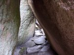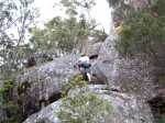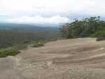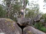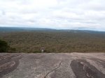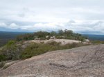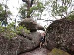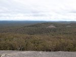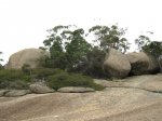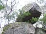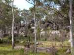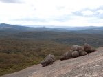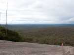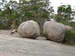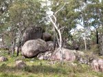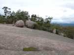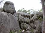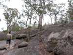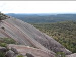 La randonnée débute au parking, facile à trouver grâce aux indications toujours claires dans ce pays où tout est fait pour le tourisme et la randonnée (Photo 1). Profiter du voyage pour repérer de tous côtés les milliers de grosses billes de granite qui se sont amoncelées dans les prairies couvertes d'eucalyptus (Photo 2). En raison des clôtures qui gardent le bétail, il n'est pas toujours possible de s'en approcher. En revanche, en d'autres endroits, ces amoncèlements se retrouvent au plus proche de la route. On peut ainsi s'arrêter et profiter de quelques curiosités comme ce rocher qui semble pouvoir basculer au moindre souffle mais qui git ici depuis des millénaires (Photo 4). Comme partout, la faune est abondante et il ne faut pas faire trop d'efforts pour dégoter un kangourou (Photo 5). Les immenses prairies où l'on retrouve ces blocs agglutinés bordent la petite route (Photo 8). Une fois au parking et en fonction du temps dont on dispose, il est possible d'effectuer plusieurs trajets. Le premier mène au roc et l'autre effectue une boucle dans le bush au sud de Bald Rock. On traverse 500 mètres de forêt sur un beau sentier avant de se retrouver au pied du monolithe où l'on retrouve bien sûr ces entassements de granite (Photo 9). La montée peut débuter en suivant les balises sur le sol granitique recouvert de quelques eucalyptus (Photo 10). Des écarts sont possibles pour découvrir l'envers du décor et partir à la recherche d'une faune toujours présente (Photo 11). Certains passages sont étroits entre les blocs (Photo 12). Il n'y a plus d'ombre et le soleil peut être très fort ; ne pas oublier d'eau. Une fois les arbres et blocs disparus, la montée est pénible mais on peut passer où on veut pour atteindre le sommet avec le cœur au maximum ; le mieux est de prendre son temps et souffler un peu pour être en forme au sommet (Photo 14). Une fois là-haut, on n'est qu'à 200 m au-dessus de la forêt mais comme l'Australie est le pays le plus plat du monde, le regard porte à des kilomètres à la ronde au-dessus des forêts d'eucalyptus (Photo 15). De la partie la plus haute, prendre tout son temps pour apprécier le paysage (Photo 16). Certains n'hésitent pas à venir méditer, les yeux fixés sur la forêt ou les autres inselbergs ou monadnocks Relief isolé qui domine un espace en général plat. Relief résiduel rocheux en cours de destruction par l'érosion qui dépassent au loin (Photo 17). On peut ensuite passer n'importe où sur le sommet et se promener dans le petit bois qui a réussi à coloniser une partie du sommet (Photo 18). On se demande d'ailleurs comment ils ont fait pour atterrir là et trouver suffisamment de terre pour survivre. Les panoramas les plus impressionnants se rencontrent lorsqu'on longe le partie la plus haute (Photo 20). On remarque un peu partout des rochers posés ça et là en équilibre qui semble incertain (Photo 21). Seuls le vent et la pluie peuvent les avoir arrondis de la sorte depuis les 220 millions d'années qui ont suivi l'intrusion granitique créée par une poussée de magma (Photo 22). On a l'impression, avec la pente qu'il suffira de les pousser à peine pour qu'ils dévalent la pente vers la forêt (Photo 23). Tous les essais restent fort heureusement infructueux ! Après une plus ou moins longue visite des lieux, il est possible de redescendre par la forte pente du départ ou d'emprunter celle, plus faible, qu'on remarque aux taches de peinture au sol (Photo 25). Contrairement à Granite Gorge, les Wallabies ne semblent pas coloniser le rocher car aucune crotte ne vient trahir leur présence. En revanche on en voit autant qu'on veut dans la forêt d'eucalyptus en repartant ou en se promenant sous les arbres. Faute de kangourous, on peut se rabattre sur les reptiles en se méfiant tout de même de la présence éventuelle de serpents dont on ne sait pas toujours s'ils sont dangereux. Les lézards à langue bleue sont particulièrement nombreux dans les roches au pied du roc et dans les rochers le long de la route (Photo 27).