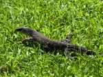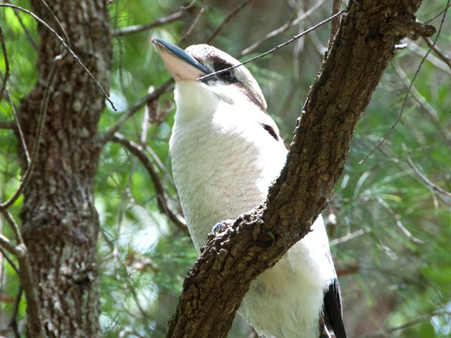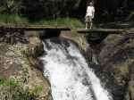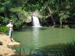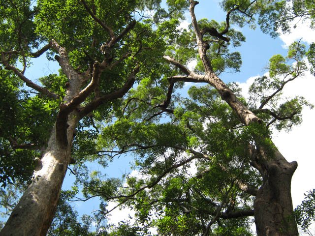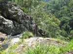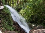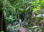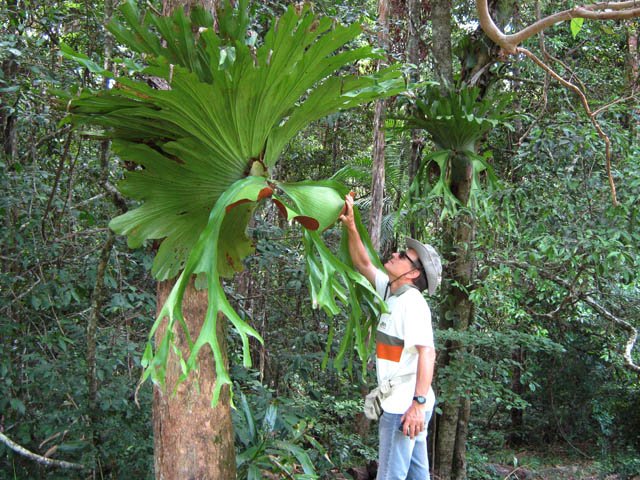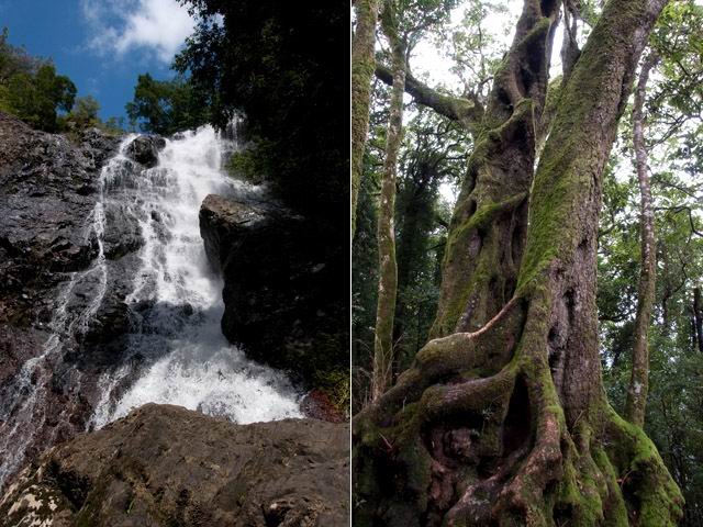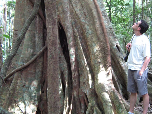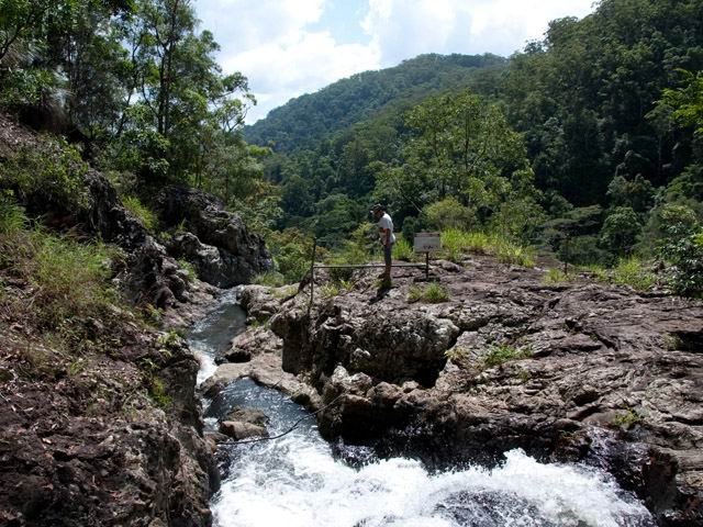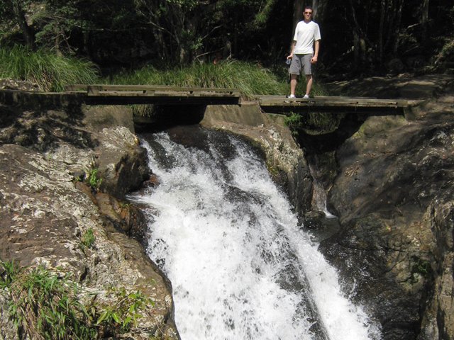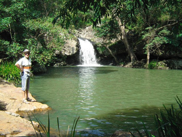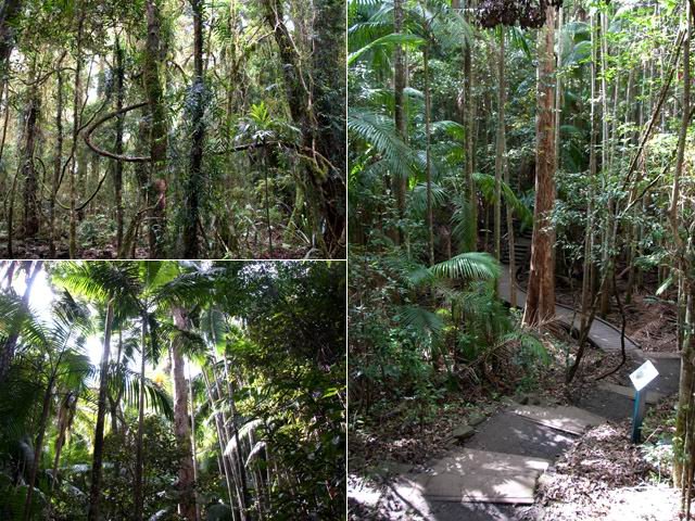 La randonnée débute à la belle petite ville de Flaxton où un grand parking a été aménagé. Guetter les varans s'ils sont en train de chercher de la nourriture dans l'herbe qui borde le parking (Photo 2). Ils ne tentent pas de fuir rapidement mais se meuvent placidement, la langue constamment dehors pour renifler les odeurs particulières d'un randonneur. Profiter également des grands arbres qui entourent l'aire de stationnement (Photo 4). Certains ont des troncs énormes et multiples (Photo 1). La région est humide et les cornes de cerfs s'y développent facilement jusqu'à en trouver sur chaque arbre (Photo 7). Deux sentiers partent aussitôt ; celui des chutes et le Picnic Track pour les gens du pays qui doivent venir s'y reposer le week-end. Le sentier est de très bonne qualité, surtout au début dans la forêt dense peuplée de palmiers (Photo 9). Une bonne partie est constituée d'escaliers avec rambardes. La descente est parfois forte mais le sentier est facile, large et propre. Profiter de la forêt qui abrite de nombreuses espèces d'oiseaux qu'on voit voleter ou qu'on entend chanter. Le plus emblématique, le kookaburra, reste sans bouger, discret avec seulement l'œil qui suit les mouvements du marcheur (Photo 12). Le sentier ondule dans cette belle forêt, passe au-dessus du torrent (Photo 13) ou près d'un beau bassin alimenté par une courte chute (Photo 14). Le bruit de l'eau est constant, qu'il vienne des cascades principales ou des petits ruisseaux qui rejoignent le torrent (Photo 16). On peut, lors de cette balade forestière et aquatique, se retrouver au sommet de la chute (Photo 17) où un panneau indique le danger de s'approcher trop près du bord (Photo 18). Durant la descente, un point de vue sur la chute à travers les arbres permet de l'admirer dans sa presque totalité (Photo 19). Après quelques lacets supplémentaires, c'est le tour des rochers au pied de la cascade d'apparaître (Photo 20). On atteint la base de la chute en hors sentier, en marchant sur les rochers glissants mais l'ombre incite peu à se baigner si on dispose de peu de temps. Ce sera différent si on a pris soin d'emporter son pique-nique sur le dos et qu'on dispose au moins de la demi-journée. Outre les oiseaux, il est possible d'apercevoir des serpents dans les fourrés (Photo 21). Attention quand on ne connait pas l'espèce car, en Australie, le nombre d'espèces venimeuses est supérieur aux espèces non venimeuses.