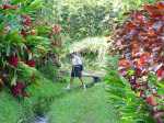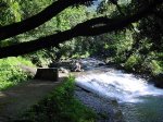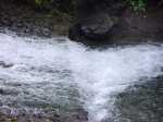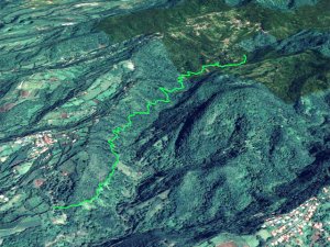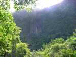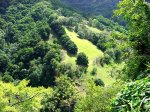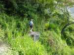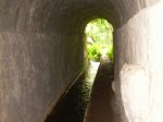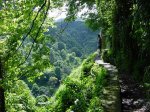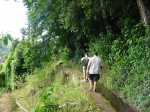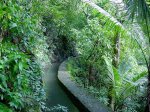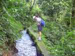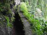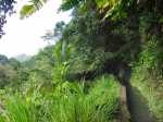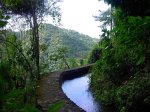 La randonnée débute près de la station de pompage entourée de grilles. Une barrière en bois peut être fermée en cas d'interdiction de passage par les autorités. Un panneau avertit des dangers de la sortie en attirant l'attention sur la présence de vide ou de serpents. La description de la randonnée est assez aisée puisqu'il s'agit de suivre la totalité de ce canal sans jamais avoir à chercher son passage ni à faire des efforts car le terrain est totalement plat sauf sur quelques rares ouvrages (Photo 1). On aura constamment un talus rocheux à gauche et le vide ou la forêt à droite. La marche s'effectue sur le haut du muret qui emprisonne l'eau. Très vite les premiers à-pics imposent de regarder où mettre les pieds (Photo 2). On devine le Piton La Croix qui domine Fonds-St-Denis dont on aperçoit quelques toitures en amont de la vallée de la Rivière du Carbet (Photo 3). Sur la droite, on domine les prairies et cultures de la Plassonnerie ou des habitations isolées au pied du Petit Piton (Photo 4). Comme la randonnée est courte, ne pas hésiter à stationner sur le mur pour admirer ces paysages (Photo 5). Sauf éboulis ou incident, le canal est toujours rempli mais y tomber ne doit pas être très grave (Photo 6). Lorsqu'il est vide, la randonnée perd de son charme (Photo 7). Près de 50 000 randonneurs pratiquent ce parcours chaque année. Il est donc fréquent de rencontrer des familles entières effectuant la balade. Pour se croiser, la meilleure manière consiste à enjamber le canal pour laisser passer les marcheurs (Photo 8). Parfois il n'y a pas de ravin et les croisements sont plus faciles (Photo 9). Plus on avance et plus la végétation est importante de chaque côté (Photo 10). Mais on devine tout de même les cascades tombant des falaises en face (Photo 11) ou le Petit Piton qui domine sur la droite (Photo 12). Le canal ne disparaît jamais excepté sous quelques ouvrages bétonnés d'une dizaine de mètres maximum très pratiques pour se croiser. Il faut également prendre garde à certains endroits où le muret est plus bas que le niveau du canal et que la marche s'effectue dans quelques cm d'eau. Les balisiers sont de plus en plus fréquents dans la végétation. Les grandes fleurs rouges sont énormes et il est impossible de les manquer (Photo 14). Les rencontres avec la faune sont fréquentes. On peut y apercevoir de beaux crabes de terre (ciriques) aux teints orangers et jaunes qui lèvent les pinces en l'air pour se protéger ou plongent rapidement dans le canal par peur du randonneur (Photo 15). Cela peut être aussi des bovidés paissant dans les parages (Photo 16). Les chèvres font également leur apparition par endroits. Plus loin, la végétation s'intensifie. Les oiseaux y sont nombreux et on aperçoit fréquemment des colibris cherchant le nectar dans les fleurs. On traverse de belles parties boisées où l'on rencontre de grands spécimens de fromagers, de kapokiers au tronc épineux ou de très hauts gommiers (Photo 17). Il faut dire qu'ils ne manquent jamais d'eau pour survivre (Photo 18). Les bananiers et bambous sont également présents en grande quantité. Plus on approche de Maison Rousse, plus les fleurs sont présentes. Après les balisiers, ce sont les roses de porcelaine ou les alpinias qui bordent le passage (Photo 20). On s'approche dans les fleurs au plus près du seul tunnel du parcours (Photo 21). Le canal coule dessous mais le passage pour une personne demeure ; la traversée est donc facile et ne demande pas de lumière d'appoint (Photo 22). L'endroit est de plus en plus habité et le canal longe la route de Fonds Mascret. On peut suivre la route, repartir sur la droite et emprunter le sentier qui s'éloigne un peu du canal et se rapproche de la Rivière du Carbet. La balade est agréable le long du torrent (Photo 23). La sortie se termine à l'écluse construite en travers de la petite rivière (Photo 24). Le captage marque le tout début du canal où l'eau pénètre dans un aqueduc couvert (Photo 25). Par beau temps, il est agréable de se baigner dans le déversoir de l'écluse pour se faire masser le dos. On peut attaquer le retour en suivant le même itinéraire, en légère descente cette fois. Repérer la pancarte sur la droite, installée par le pépiniériste de Fonds Mascret qui propose des fleurs à la vente (Photo 26). Le retour prend le même temps de marche que la légère montée de l'aller (Photo 28).